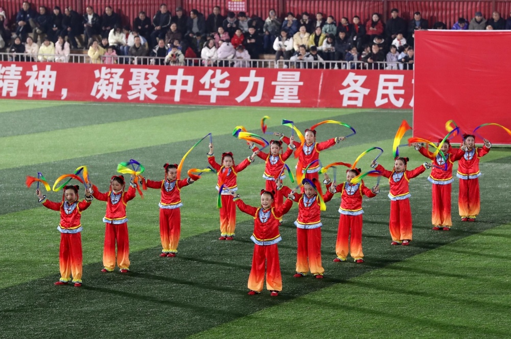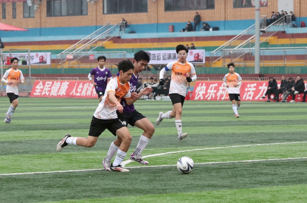 2月4日,在贵州省黔东南苗族侗族自治州榕江县城北新区“村超”足球场,湖南省会同县一中班超球员(蓝衣)与贵州省安顺市孟甲学校班超球员在比赛中拼抢。