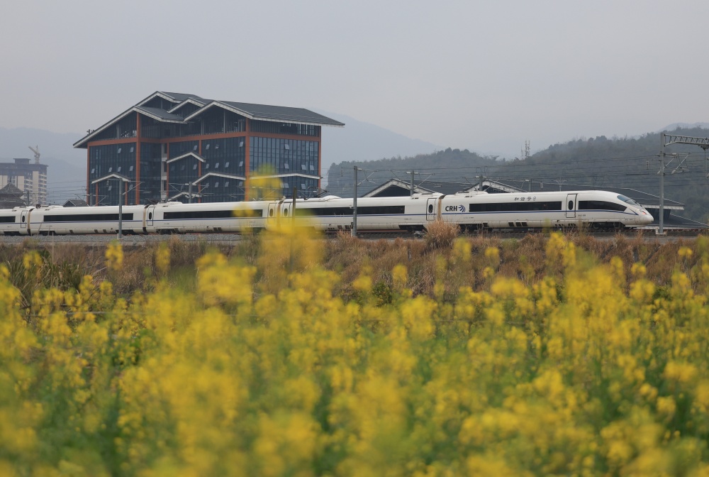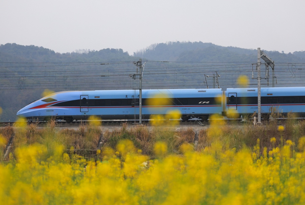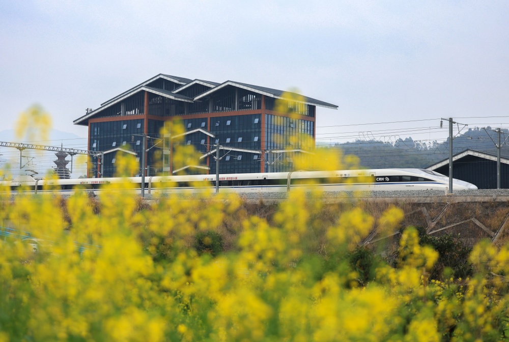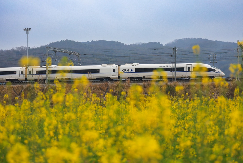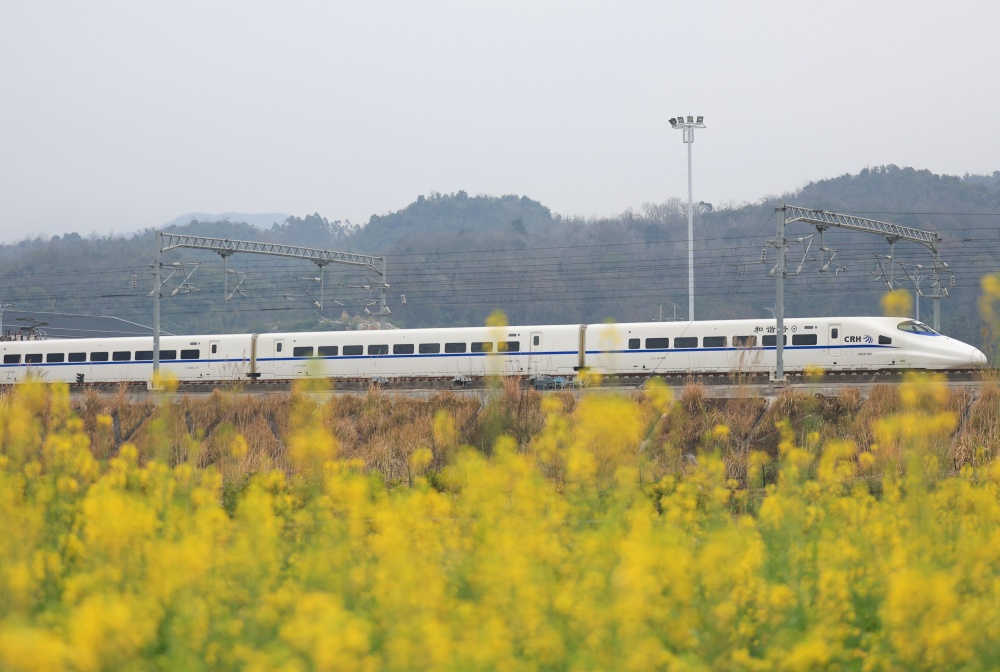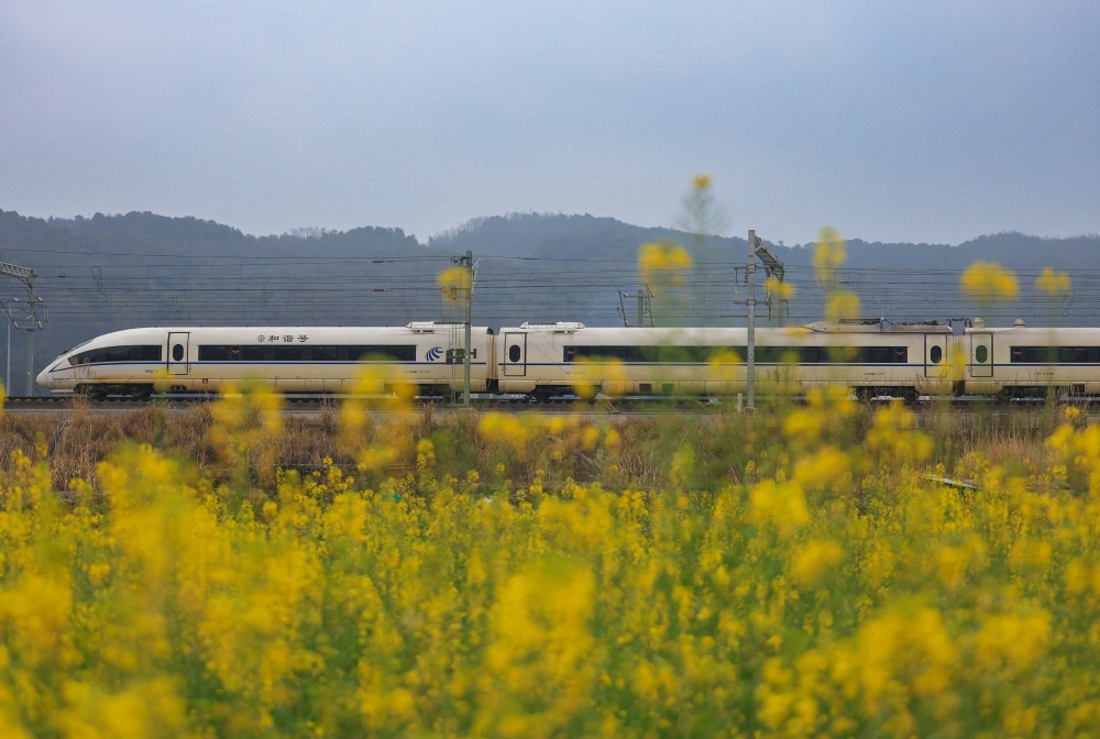 当日是二十四节气中的立春,贵州省黔东南苗族侗族自治州从江县境内的油菜花竞相绽放,一列列动车组列车在油菜花盛开的田野间疾驰而过,构成一幅幅列车开往春天的美丽画卷。