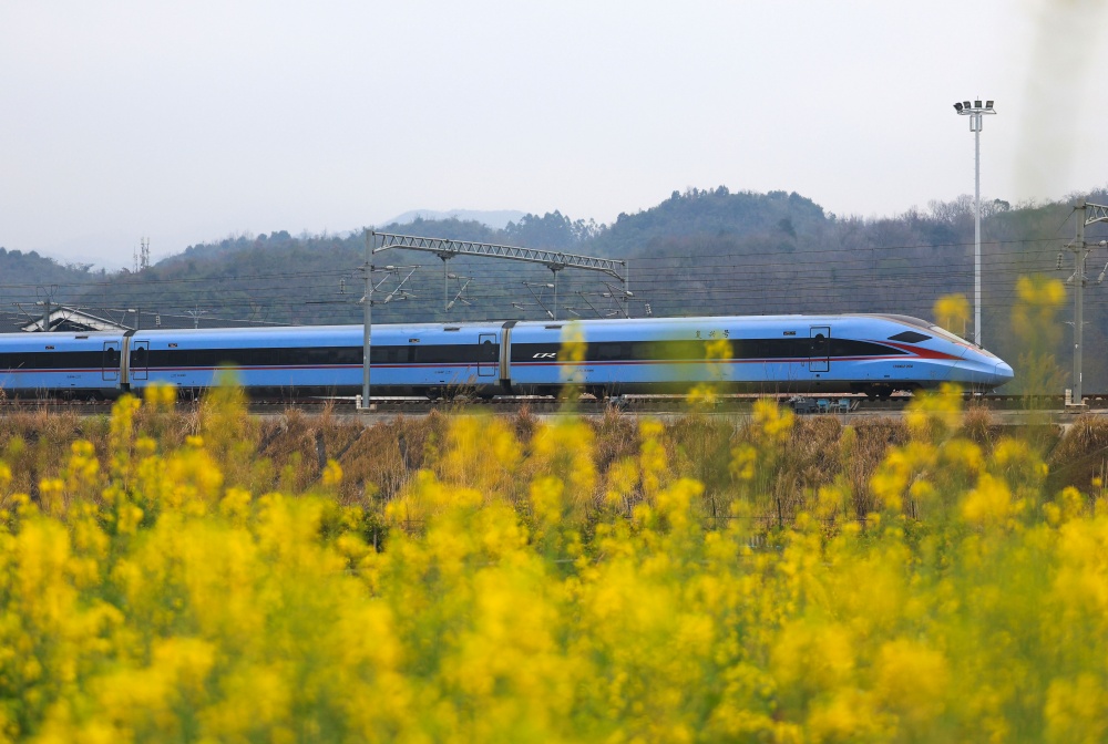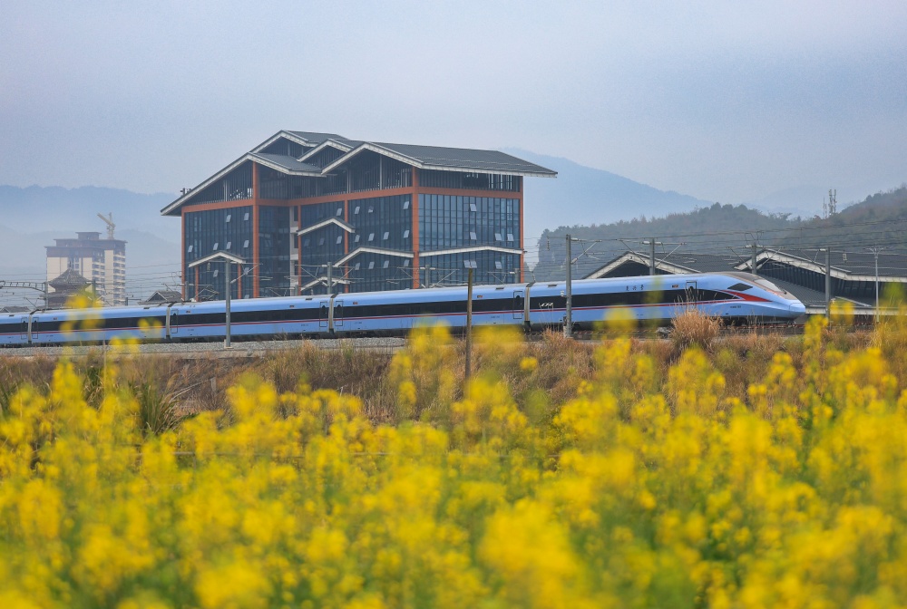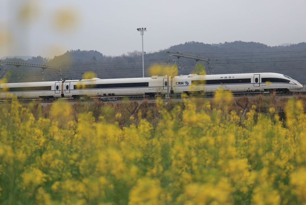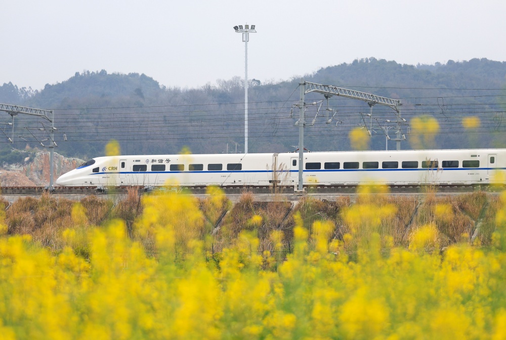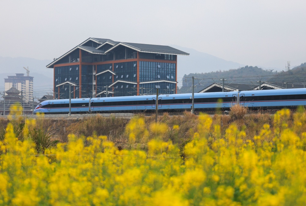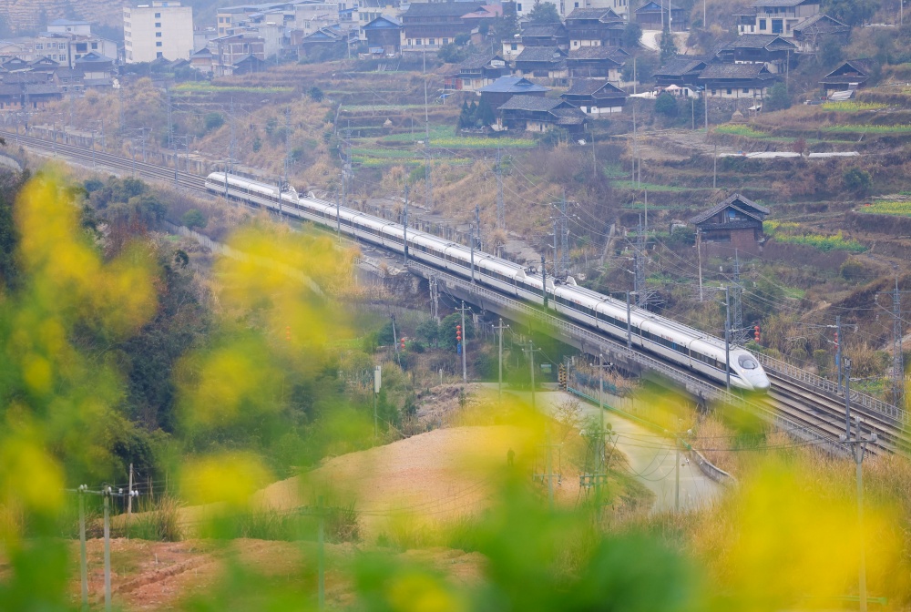 2月4日,贵广高速铁路上的动车组列车驶过贵州省从江县洛香镇油菜花盛开的田野。