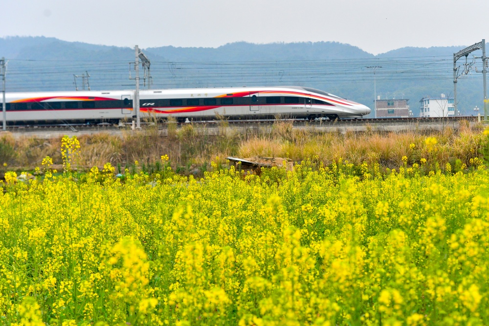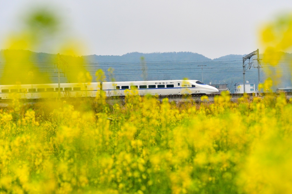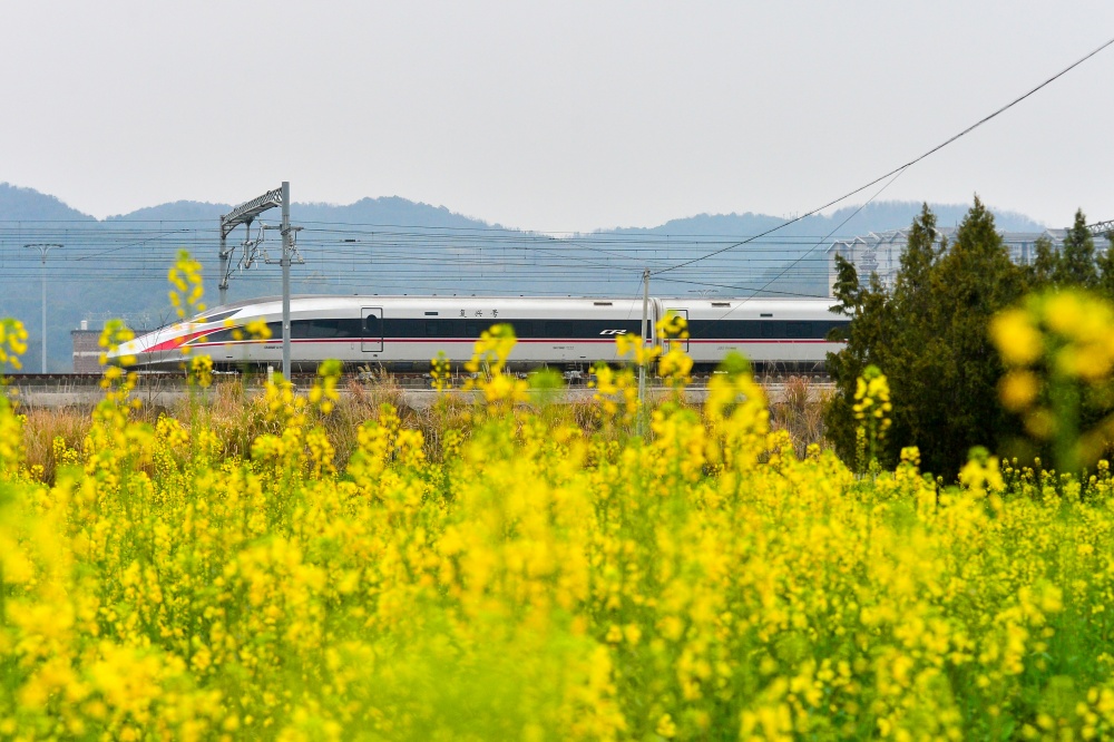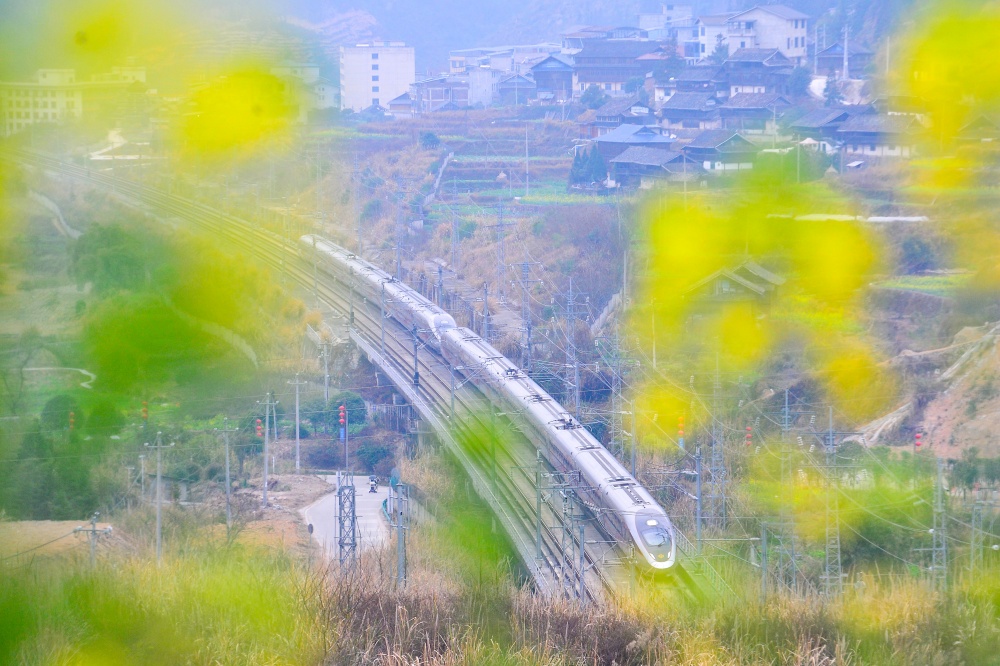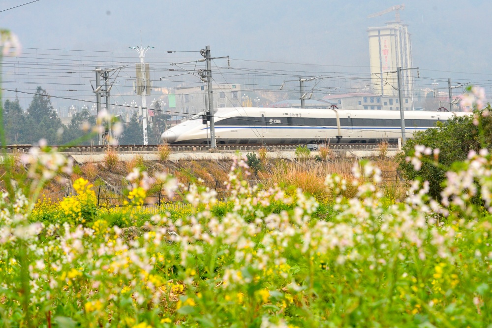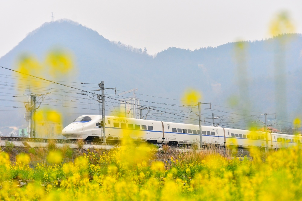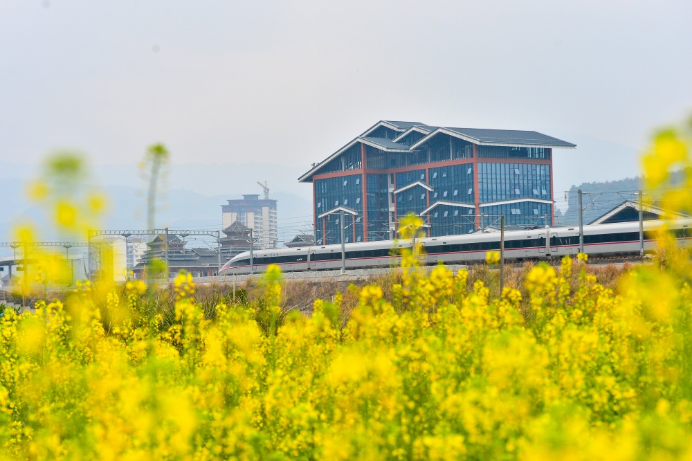 2月4日,在贵州省黔东南苗族侗族自治州从江县洛香镇境内,动车组列车在油菜花盛开的田野间疾驰而过。