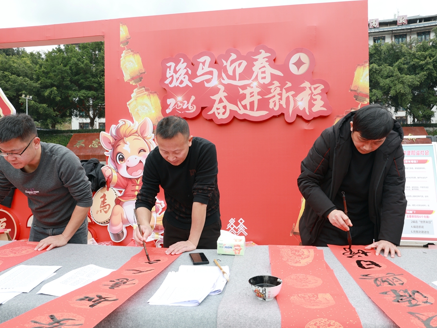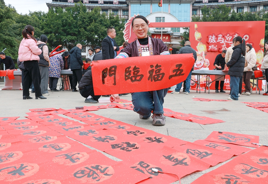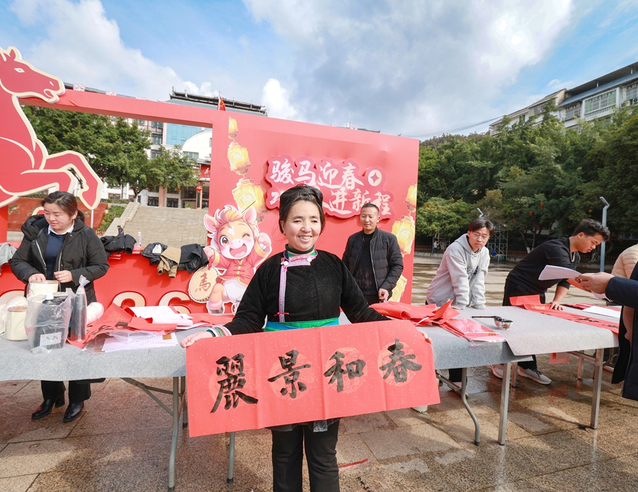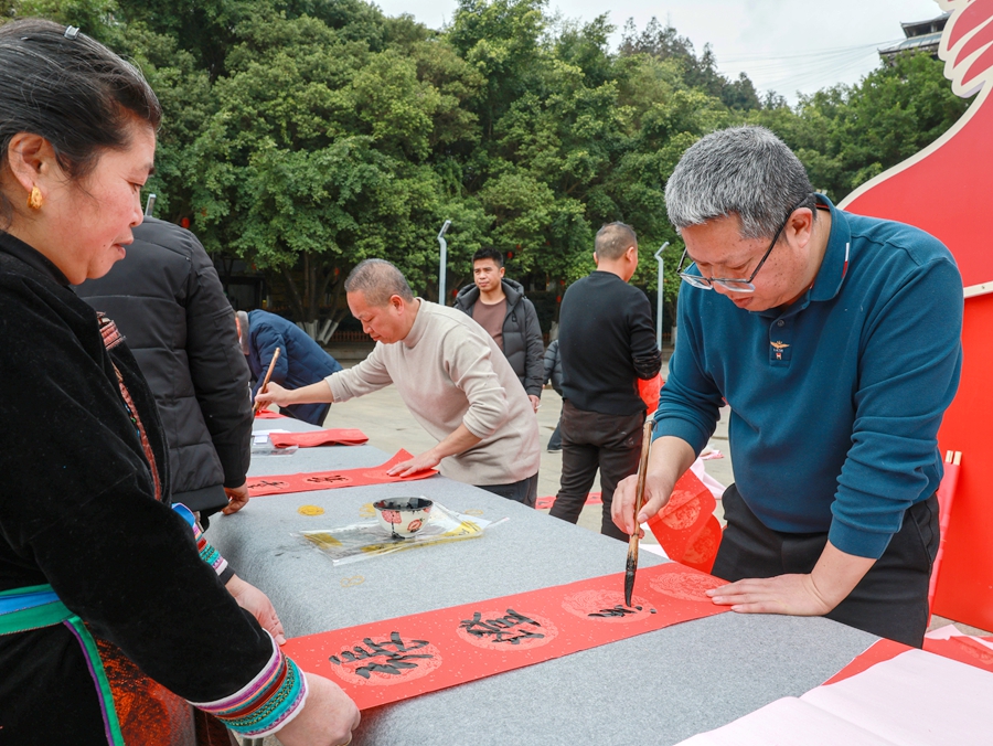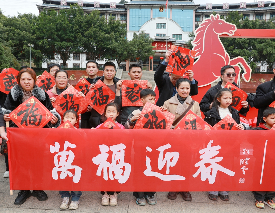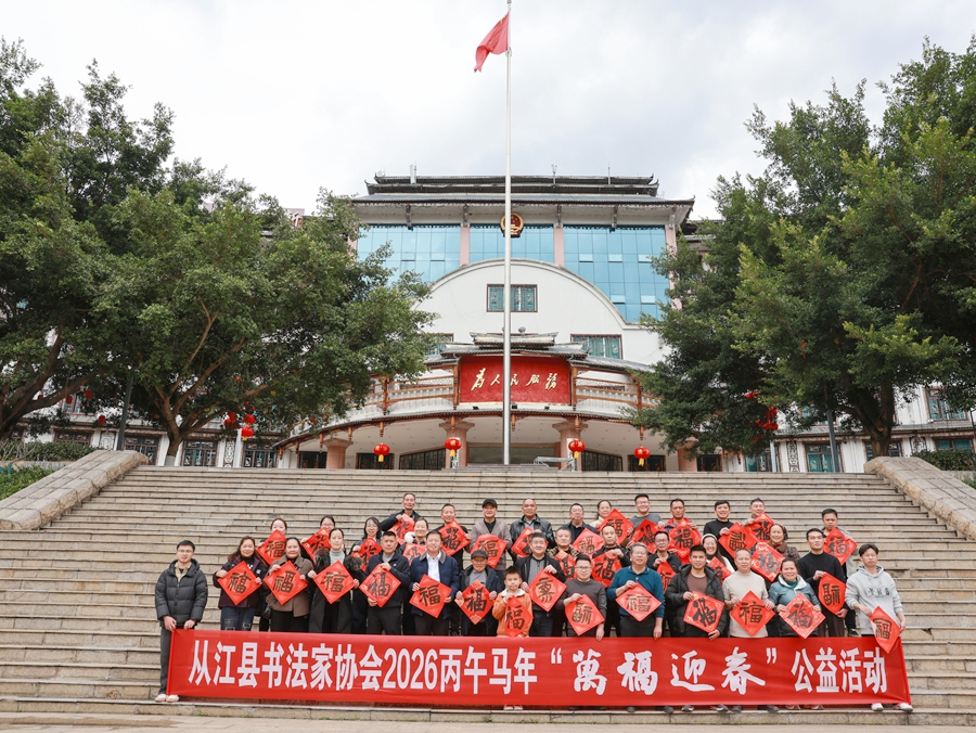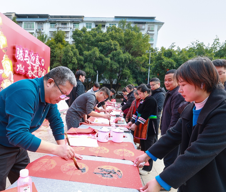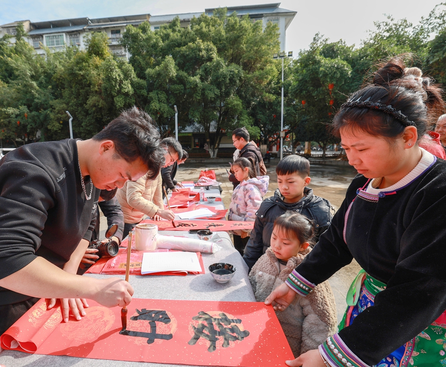 2026年2月11日,贵州省黔东南苗族侗族自治州从江县“万福迎春·送春联进万家”公益活动在县政府广场火热开展。书法家协会成员现场挥毫泼墨,书写春联、赠送福字,为各族群众送上饱含年味的新春祝福。