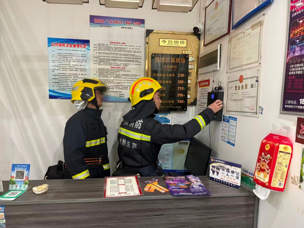 夜幕无声换战袍,苗寨深处守平安。当万家灯火次第亮起,热闹了一天的消防员们悄然换上战斗服,开启除夕夜的“硬核”守护模式。夜色中,消防员穿行在景区的石板路上,对商铺、客栈及歌舞表演点进行“地毯式”夜查。“老板,灭火器要放在显眼处”“请注意用火安全”……一句句温暖的叮嘱在夜色中回响。宣传资料一份份发到游客手中,消防安全知识随着新年的祝福传递到每个人心里。苗族阿妈接过宣传单,竖起大拇指:“有你们在,我们安心!”。针对除夕夜人流密集的特点,消防站在景区重点区域设立流动岗哨,安排专人现场值守,确保一旦发生险情能够“打早灭小”,筑起一道无形的安全防线。