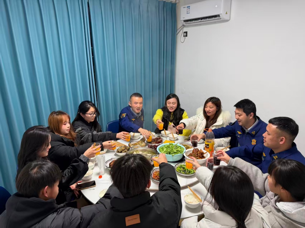 敞开红门迎客来,营区里面年味浓。为营造喜庆祥和的节日氛围,消防站敞开大门,邀请游客及家属进站共度佳节。营区内,家属与游客们走进整齐划一的宿舍,触摸着棱角分明的“豆腐块”被褥,驻足便民服务站前,看着一张张记录温情的志愿服务剪影,眼中满是骄傲与欣慰。消防站精心准备了消防主题卡通公仔等纪念品,将“平安”的祝福送到每一位群众手中。食堂内长长的圆桌连接起天南海北的情谊,消防员与家属、游客一起包饺子、话家常。元宝饺、月牙饺摆满案板,热气腾腾的饺子出锅时,大家举杯共祝,通过视频连线向远方的亲人传递跨越千山万水的思念与祝福。