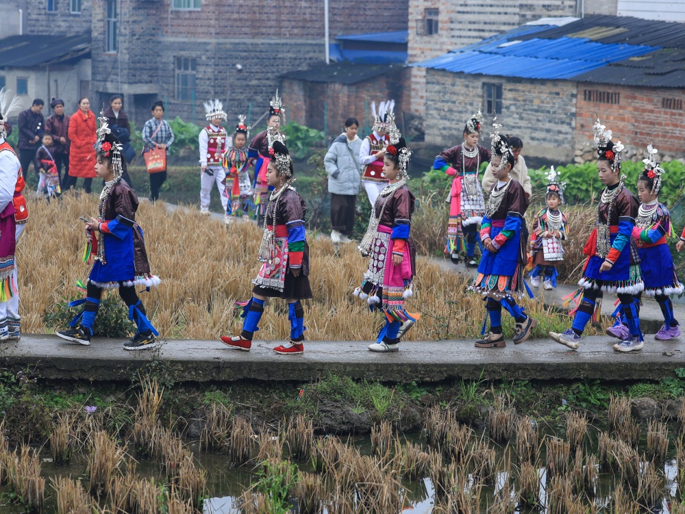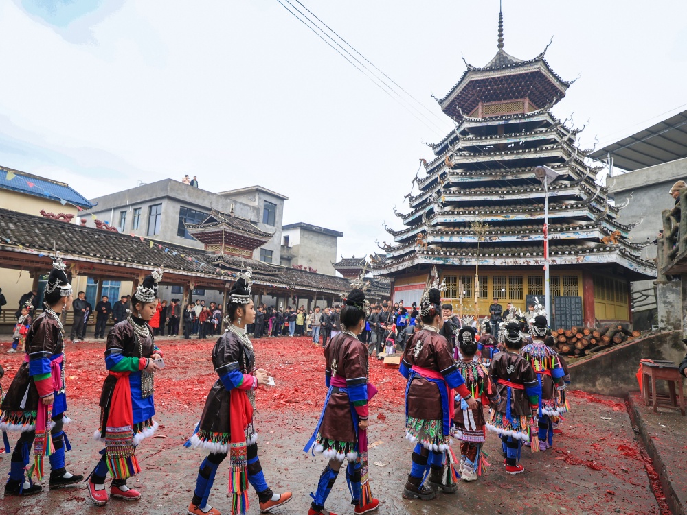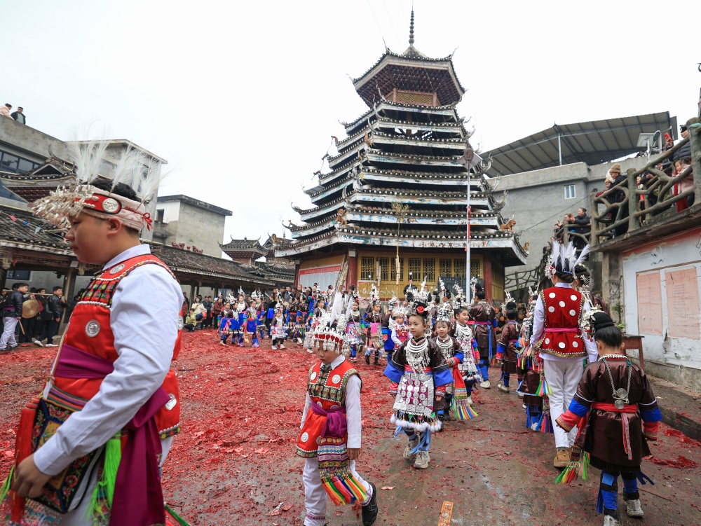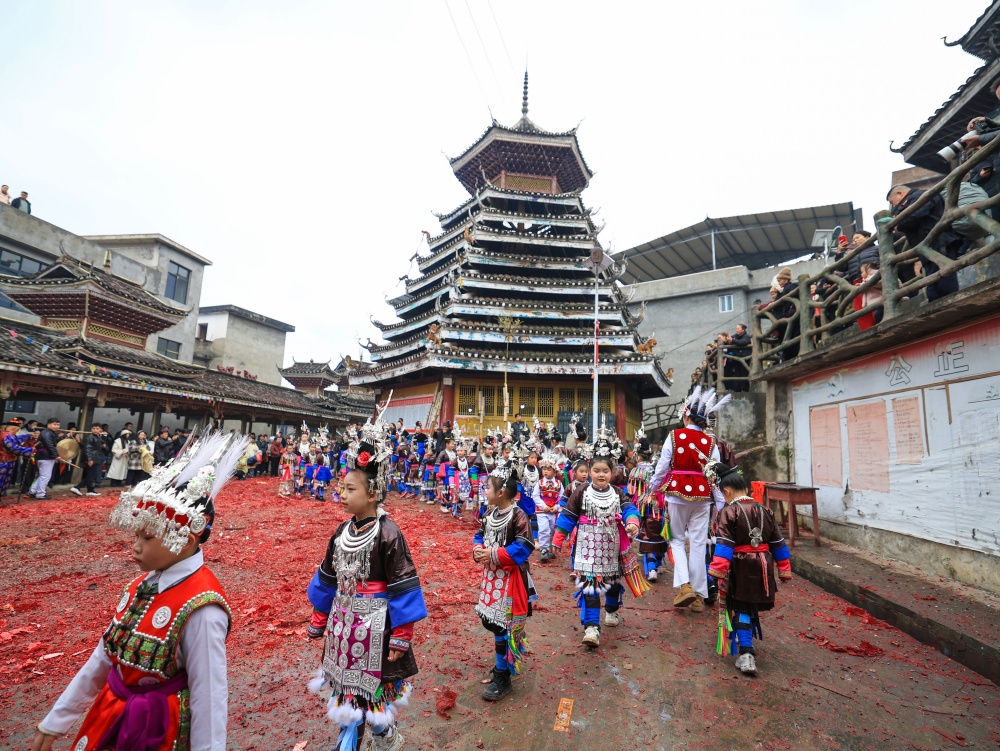 2月17日(农历大年初一),贵州省黔东南苗族侗族自治州从江县贯洞镇龙图侗寨,侗族同胞身着节日盛装,欢聚一堂,开展“赶略”民俗活动。侗族群众通过巡游、吹芦笙、鸣铁炮、唱侗歌等形式,共庆新春佳节。