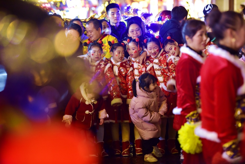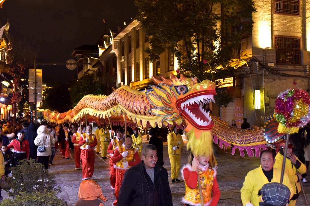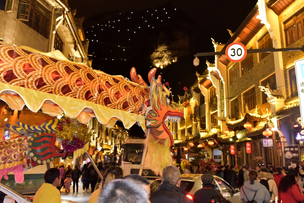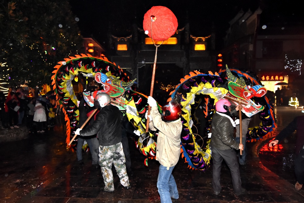 各社区龙灯队陆续出龙亮灯,灯头提灯率队,后面依次为横幅旗幡、竹编鸟兽牌灯、纸扎造型花灯、鼓乐演奏、划旱船、耍蚌壳、玩龙灯、歌舞表演等,队伍绵延数百米,浩浩荡荡穿行于古城街巷。沿途市民和游客纷纷驻足观看,大家摸龙背、钻龙身,在锣鼓喧天中感受最地道的镇远年味。