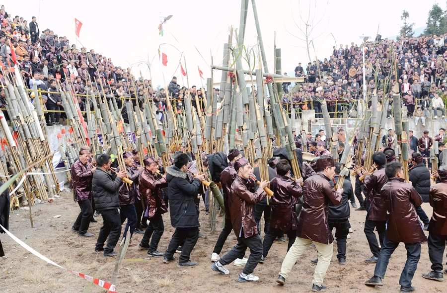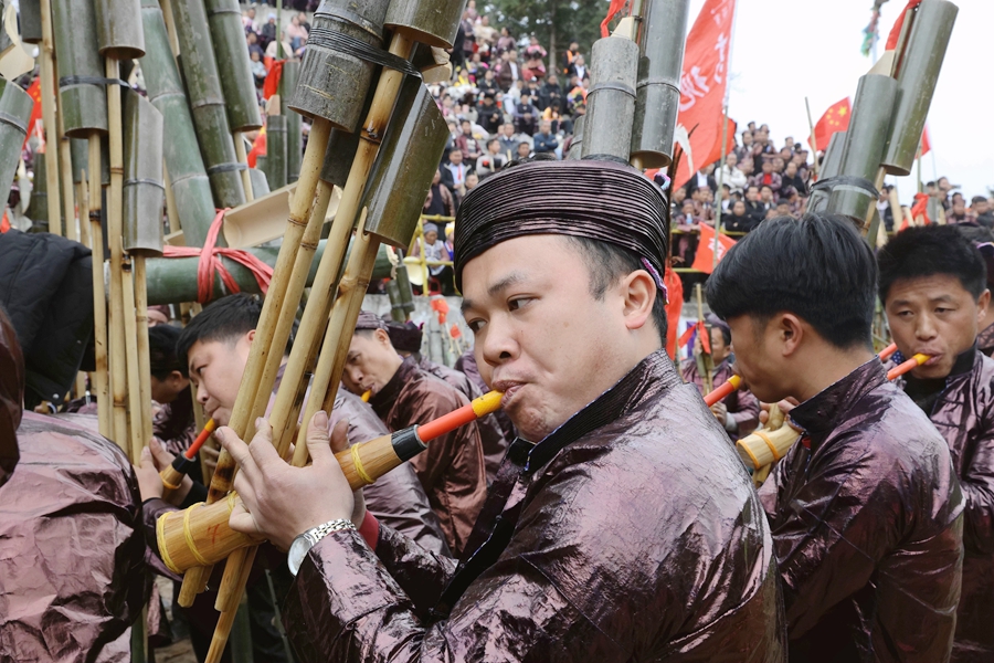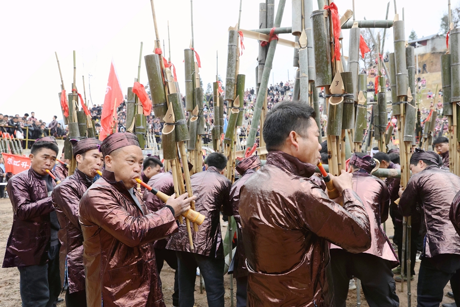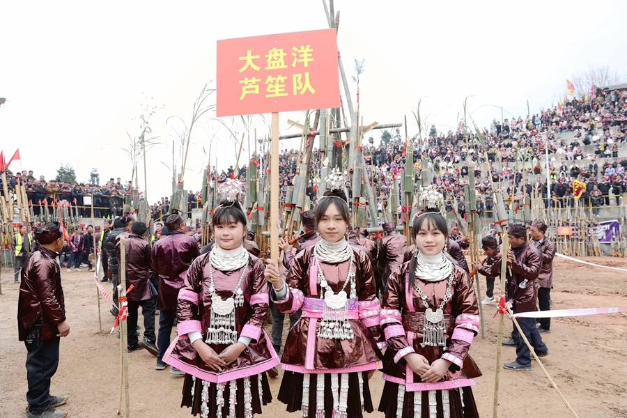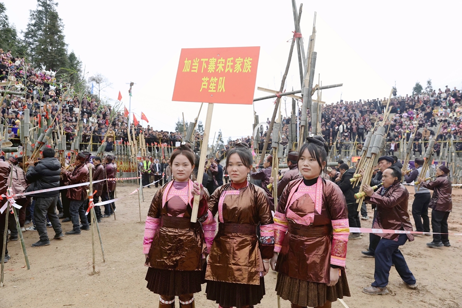 2月21日是大年初五,榕江县古州镇高懂村、三盘村在松月芦笙堂联合举办“松月2026年春节芦笙会”。来自榕江县古州镇、忠诚镇以及从江县停洞镇、东朗镇的17支苗族芦笙队齐聚一堂,参加吹芦笙比赛,旨是通过开展芦笙会友活动欢庆新春佳节的同时交流感情,增进村与村、寨与寨之间的团结和友谊。