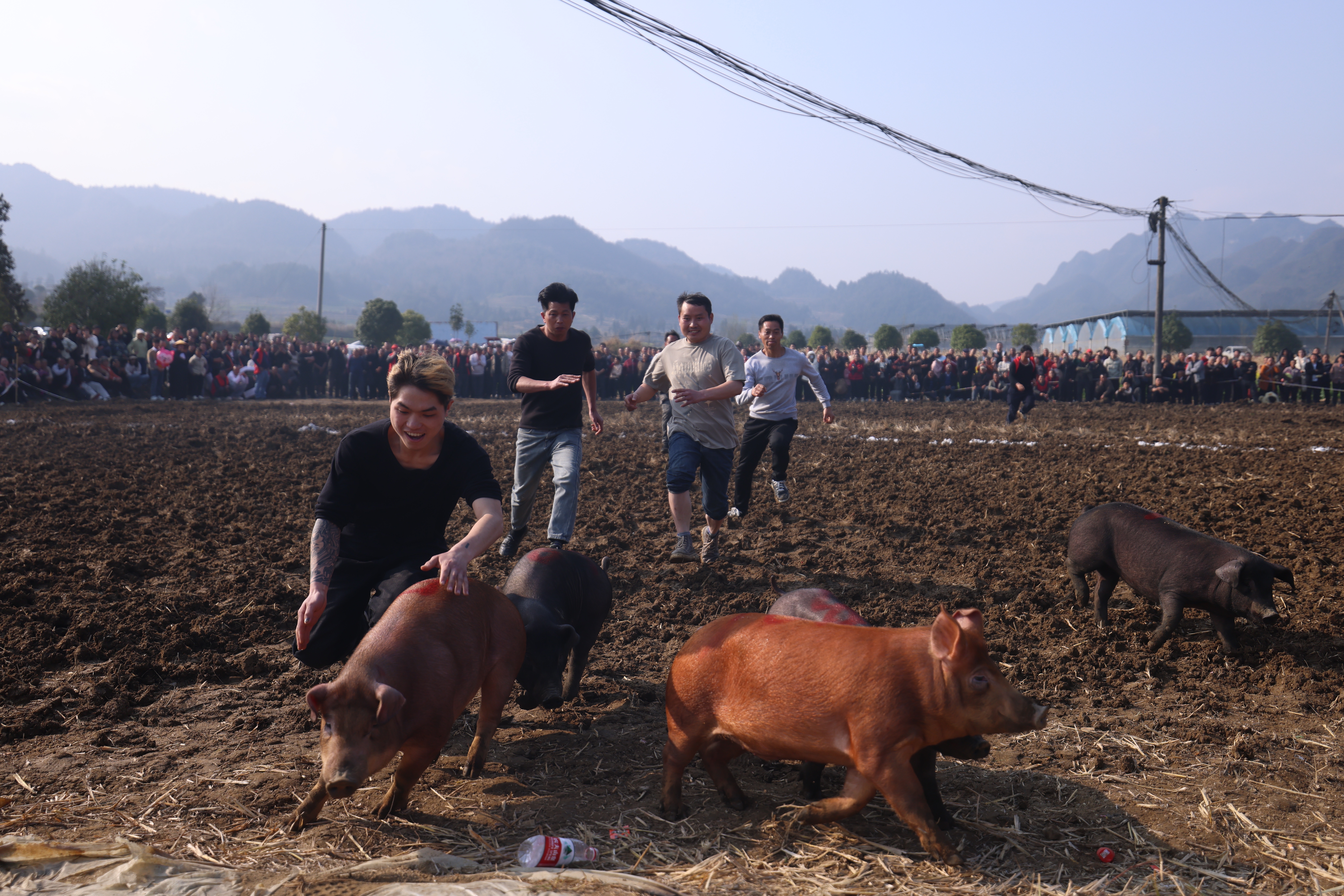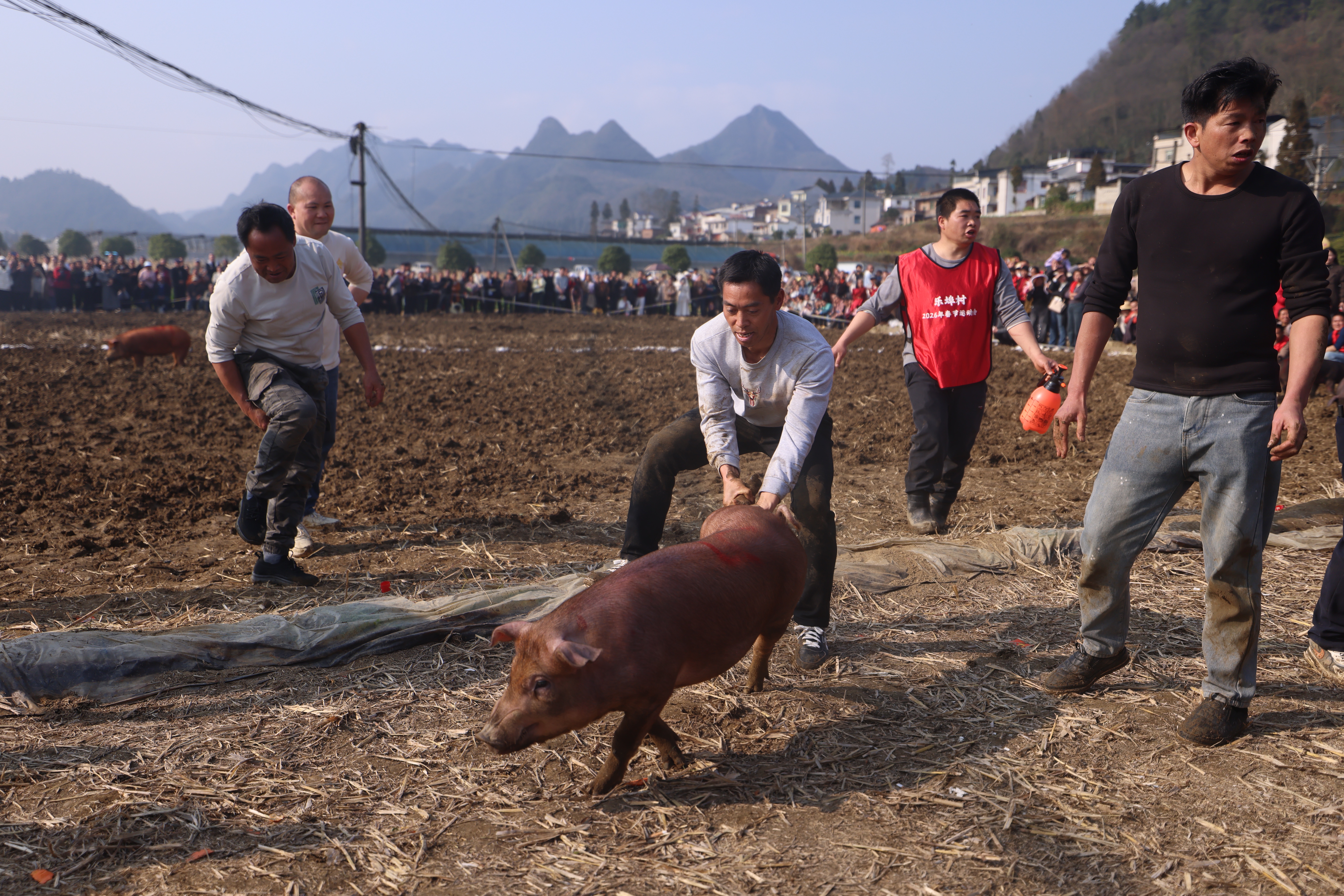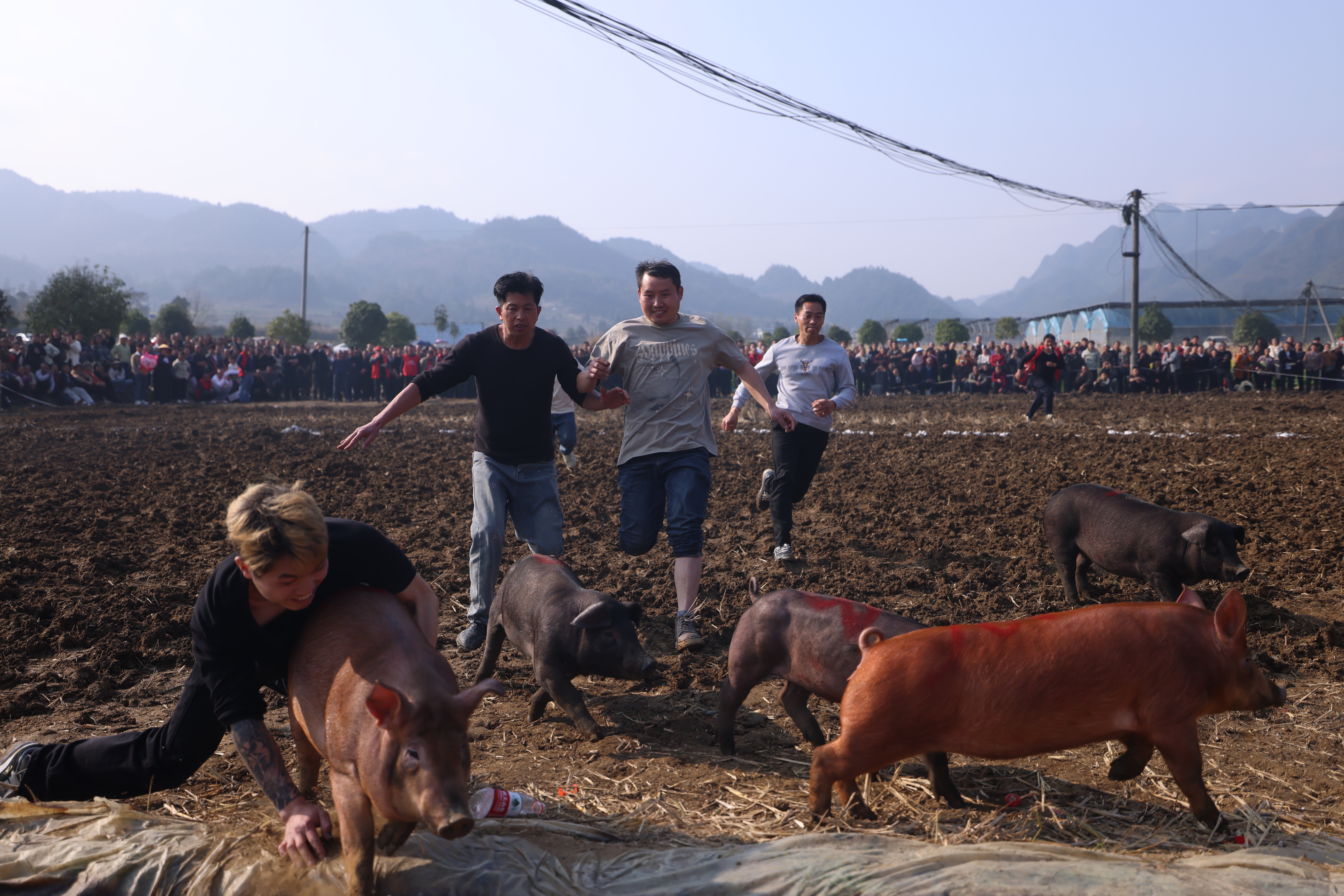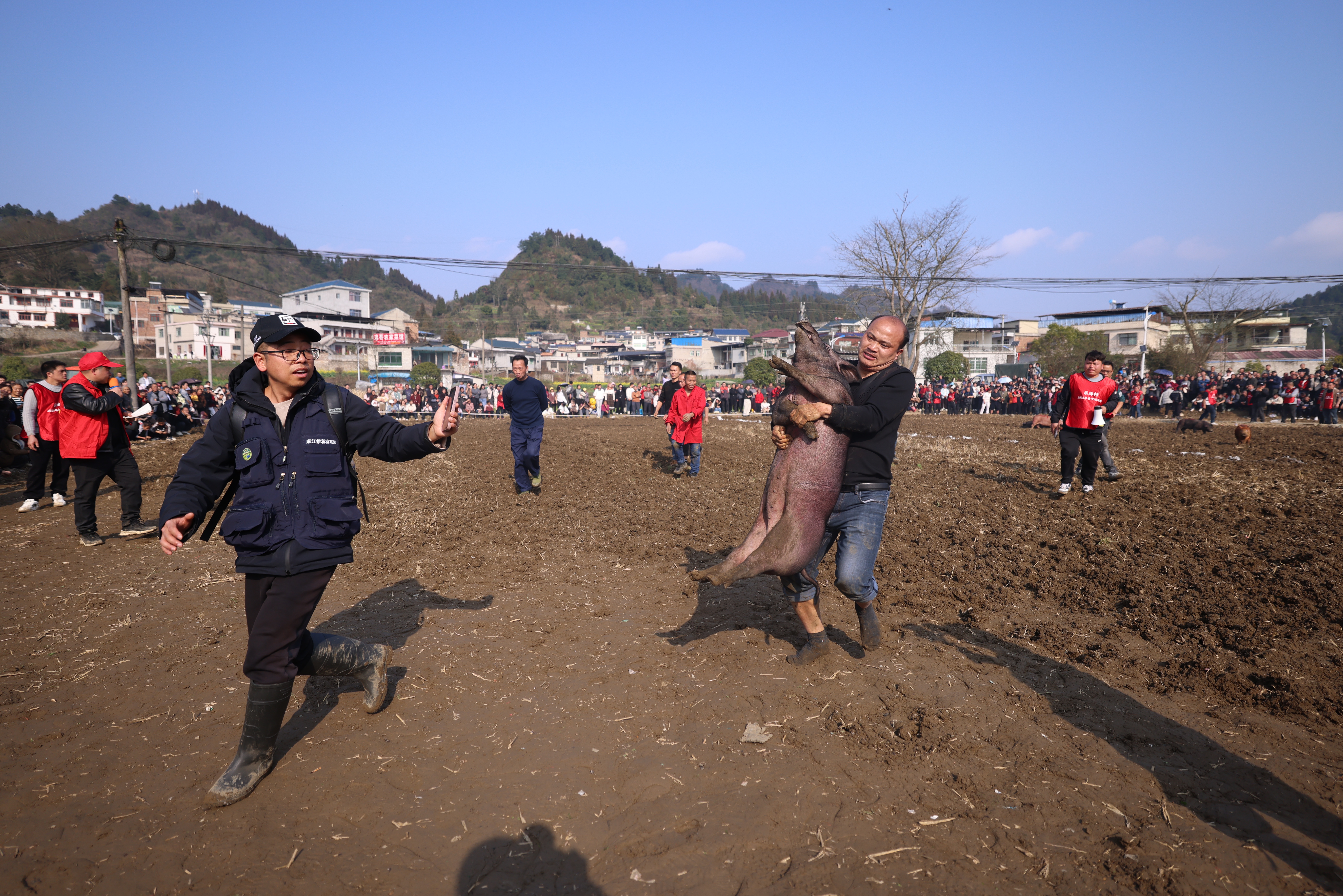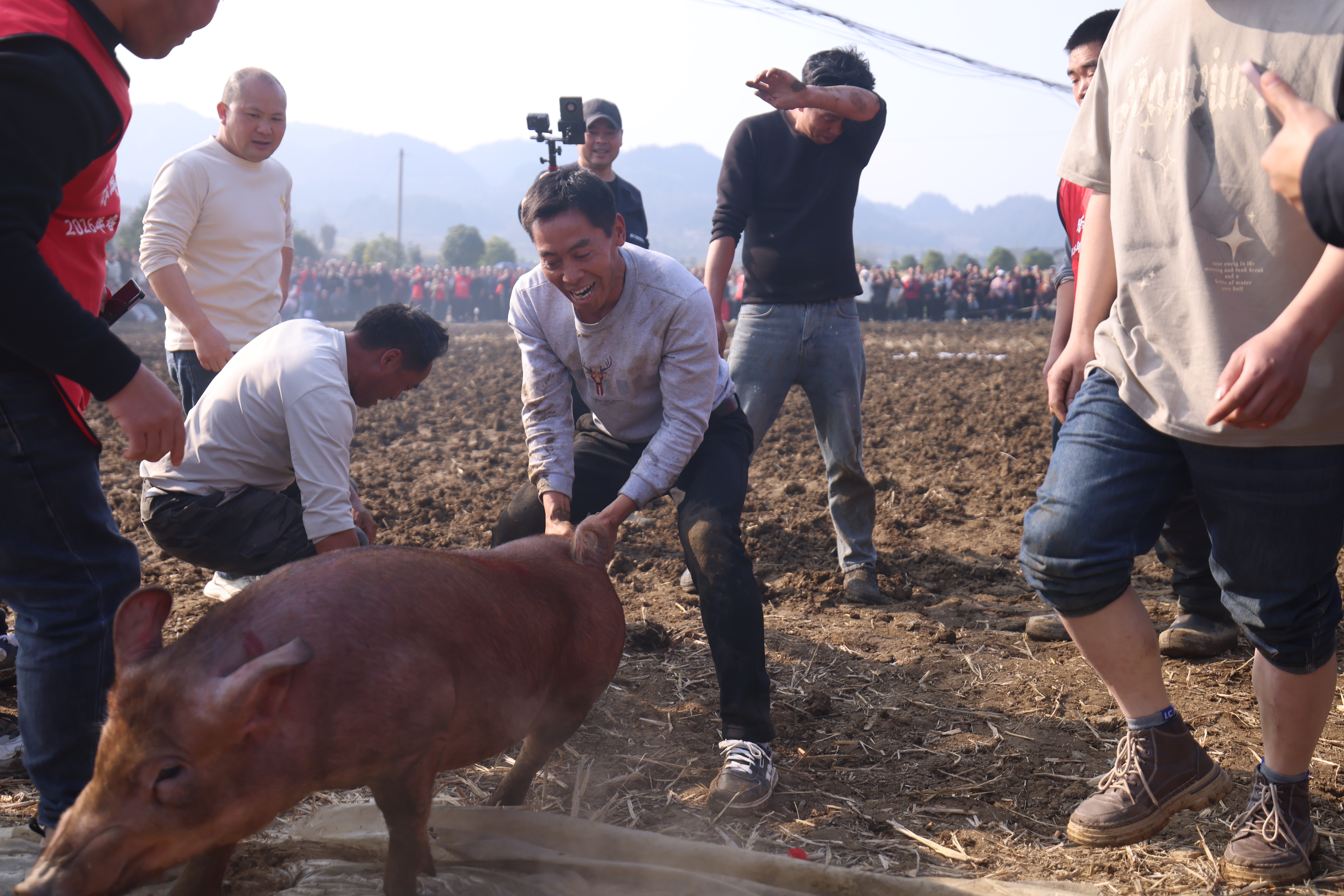 与此同时,趣味十足的抓猪、抓鱼、抓鸡活动同步火热开启。活动现场人声鼎沸、热闹非凡,参赛选手们你追我赶、斗智斗勇。泥水飞溅中,有人瞅准时机猛地一个鱼跃抱住小猪,有人追着鸡群满场跑,欢笑声、呐喊声、助威声响彻云霄。这些看似“土味”十足的项目,恰恰是麻江“村趣”的灵魂所在——将农民日常熟悉的农事活动转化为竞技游戏,让田间地头变成最接地气的赛场。