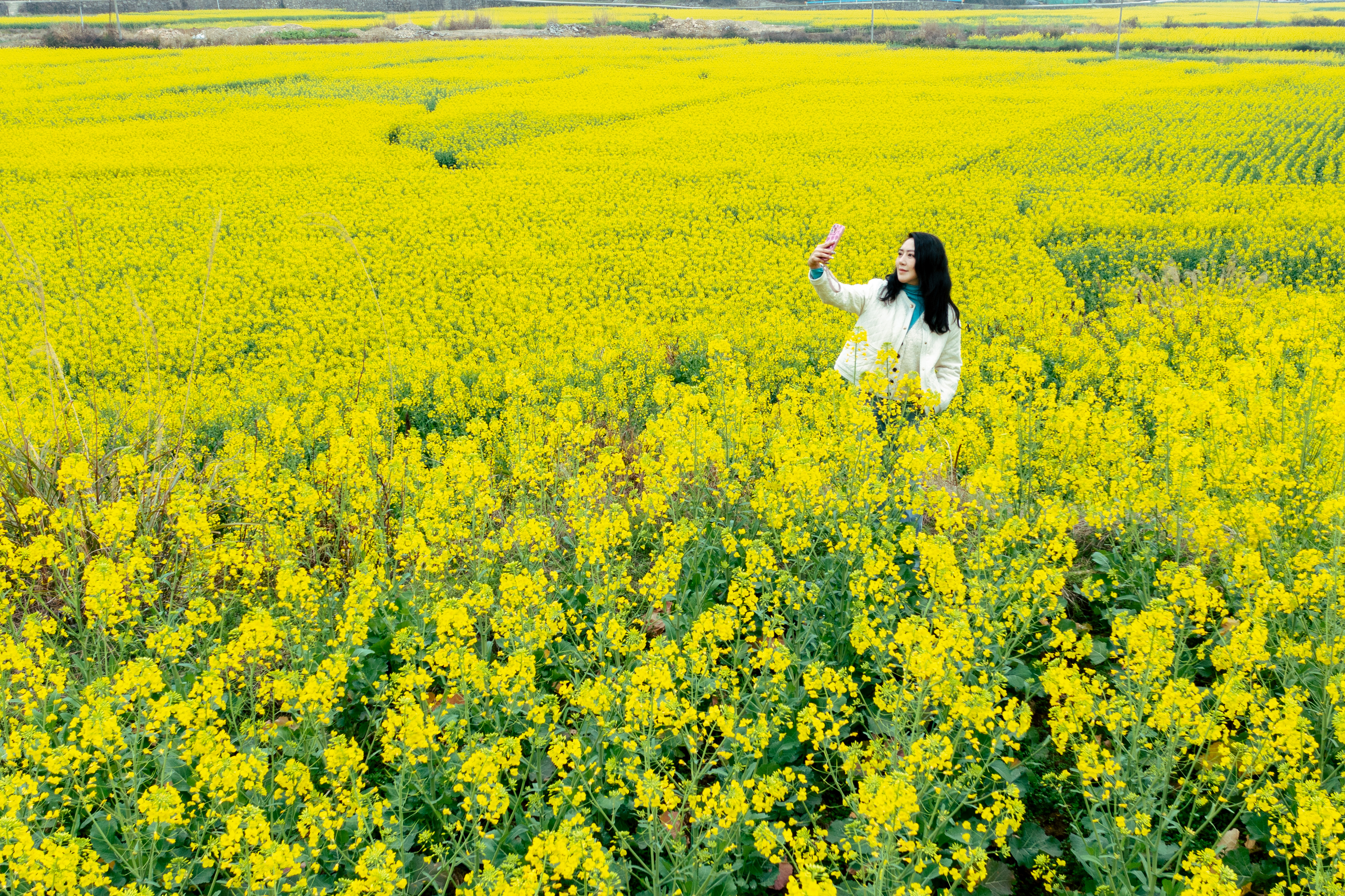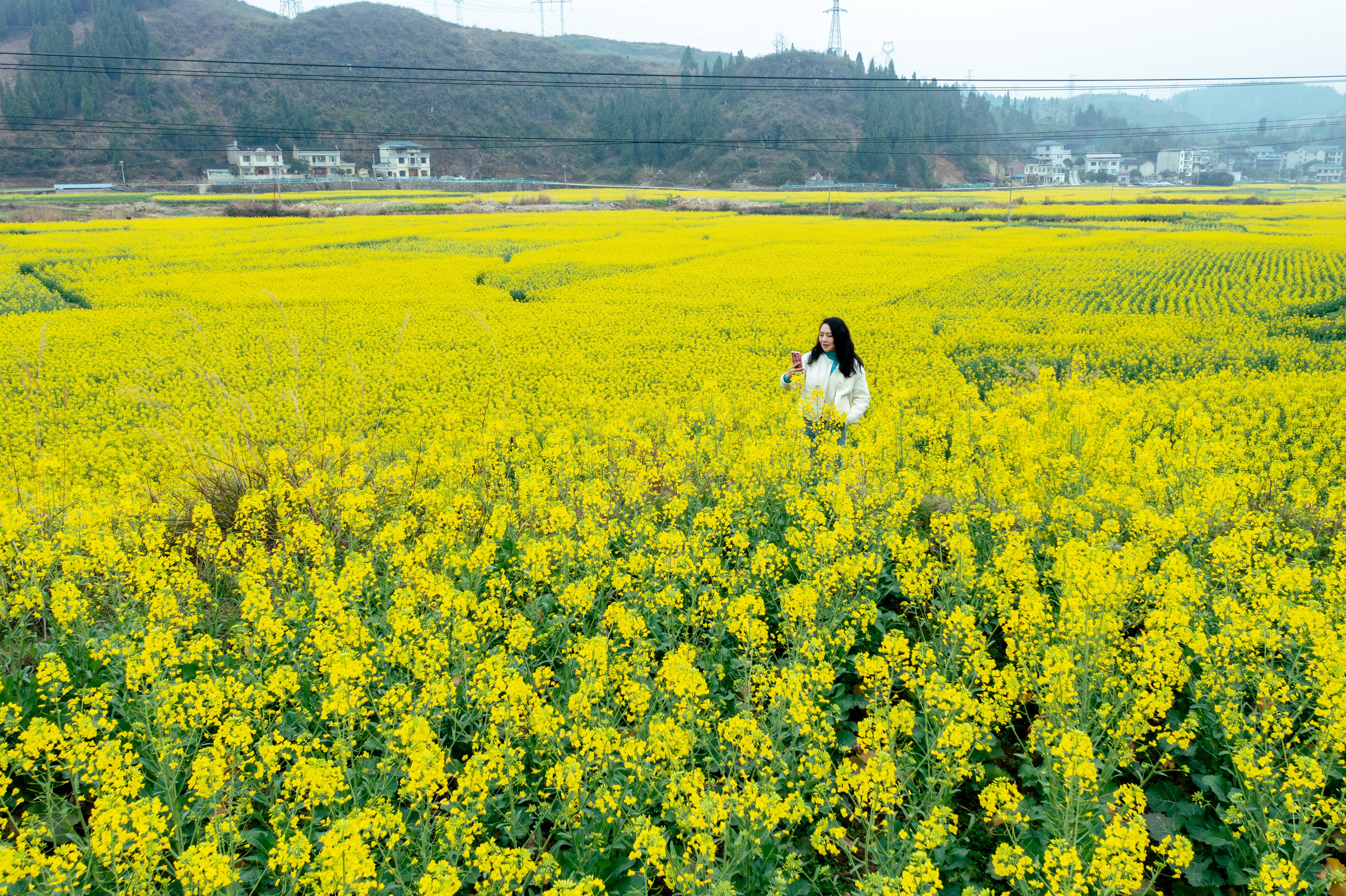 在各乡(镇)坝区,连片油菜花竞相绽放,微风拂过,花浪起伏,香气四溢,吸引不少市民与游客前来踏青赏花、拍照打卡,尽享春日美好。