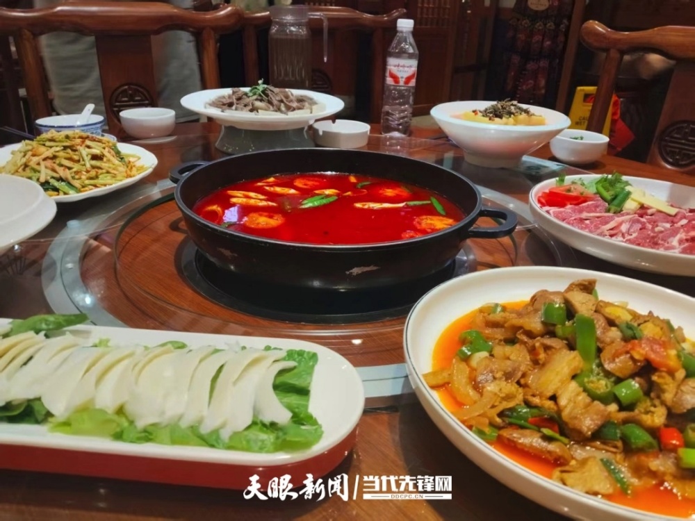走进店内,酸汤火锅的香气扑面而来。来自云南的游客陈先生一家正围坐在桌前,锅里的红酸汤翻滚着,鱼肉鲜嫩。“我们是看了网上推荐专门找过来的,不仅有美食,还能体验苗族文化,这一趟来得值!”用餐间隙,身着盛装的苗家姑娘手捧酒碗,唱着敬酒歌走来,“高山流水”的互动环节将现场气氛推向高潮——酒碗层层叠叠,米酒顺着碗边流下,游客在欢声笑语中感受苗家人的热情好客。