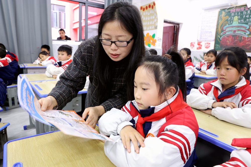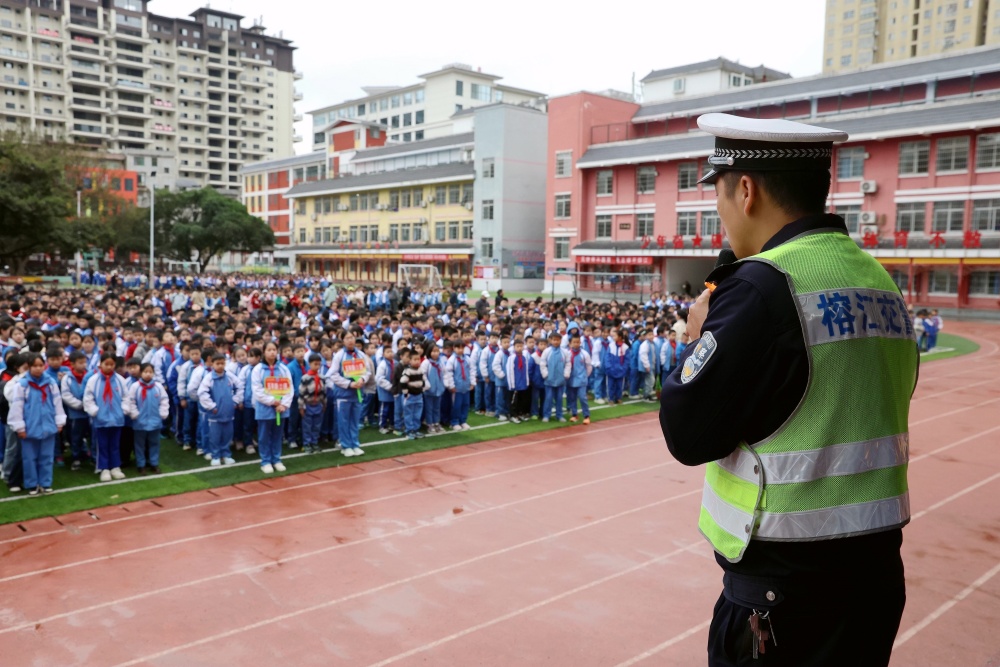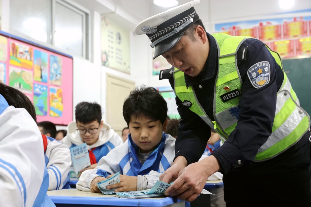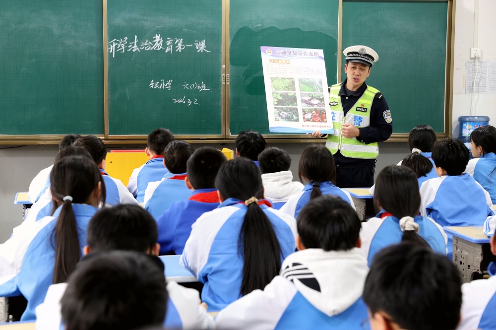 3月2日,在贵州省黔东南苗族侗族自治州榕江县古州镇车民小学,交通民警在给学生宣传道路交通安全常识。