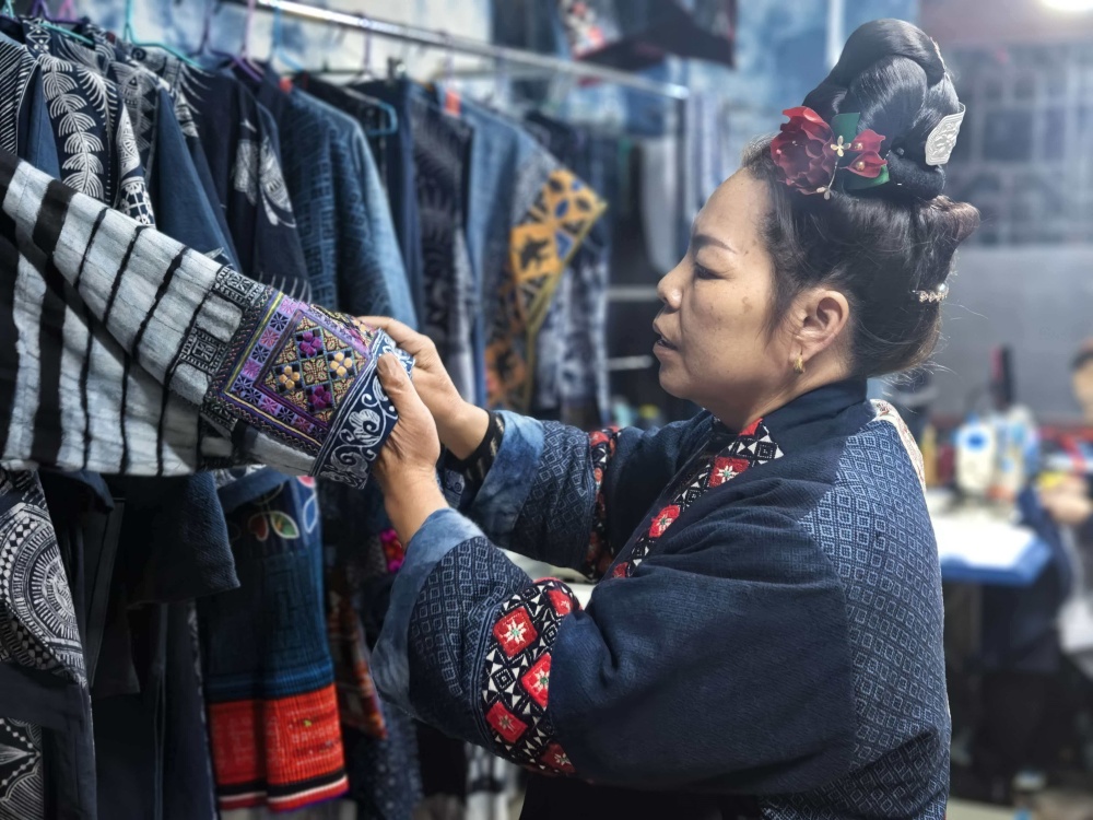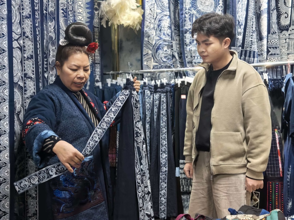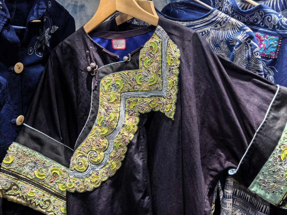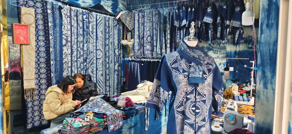 起初,她们在榕江做好成品后批发给别人。随着对市场的了解和对蜡染事业的热爱,她们来到凯里,先是在金泉湖草坪新村开启创业之路,2023 年在风情园绣里淘开设了第一家商铺,2025 年 12 月又乘势开了第二家店铺。如今,她们的店铺一个位于绣里淘一期,另一个在绣里淘三期,三期的店铺门面更大。