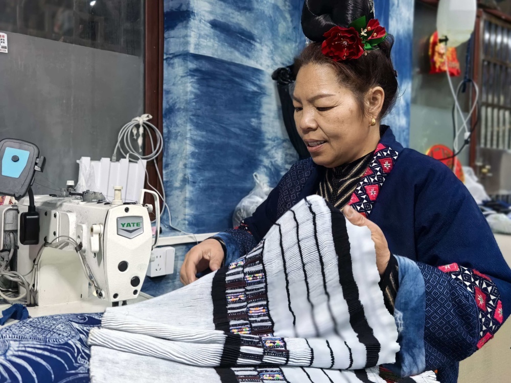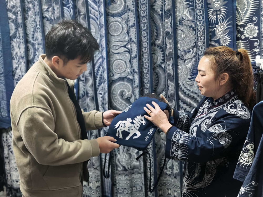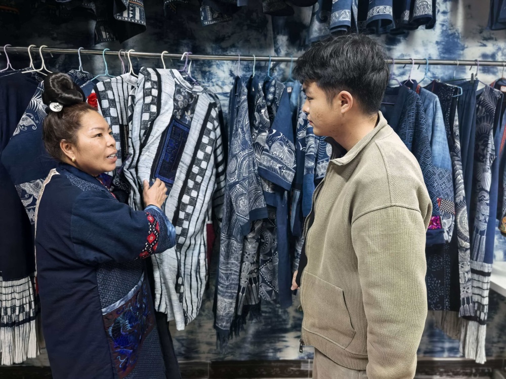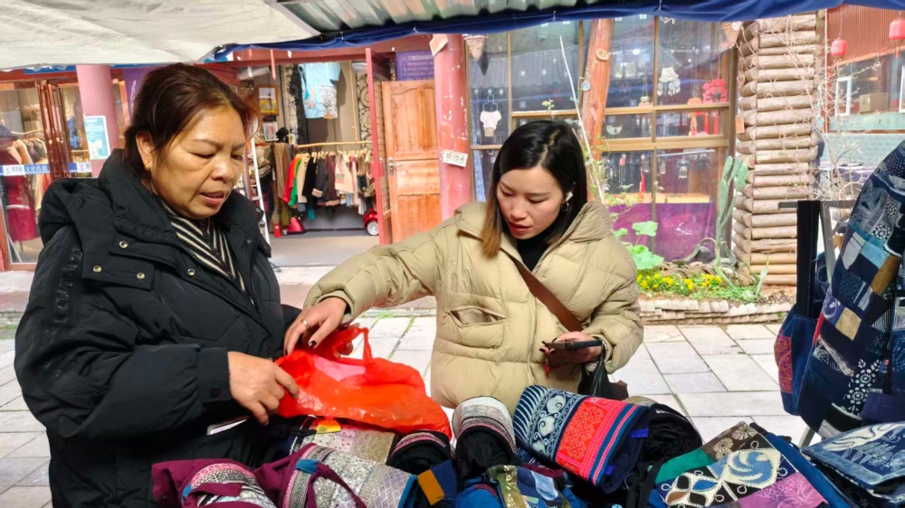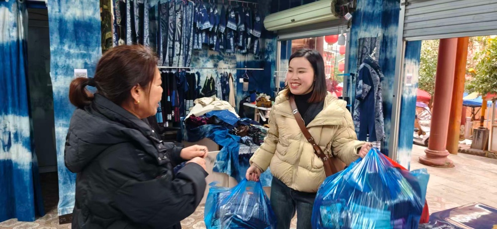 目前,她们固定聘请了多名本地员工。凭借着精湛的技艺和对品质的执着追求,店铺的生意越来越好,年收入可达二十多万元。销售渠道既有线上也有线下,本地有五六个带货主播长期从她们家拿货,产品远销北京、上海、武汉等地。拿货张女士一直和他们家建立了长期合作,她表示,自己愿意长期从这里进货,因为吴家姐妹的蜡染制品卖得好、款式多、质量好,而且回购率很高。