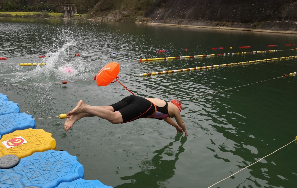 3月1日,在贵州省黔东南苗族侗族自治州榕江县古州镇头塘村游泳比赛现场,运动员从起跳台跳入水中。
