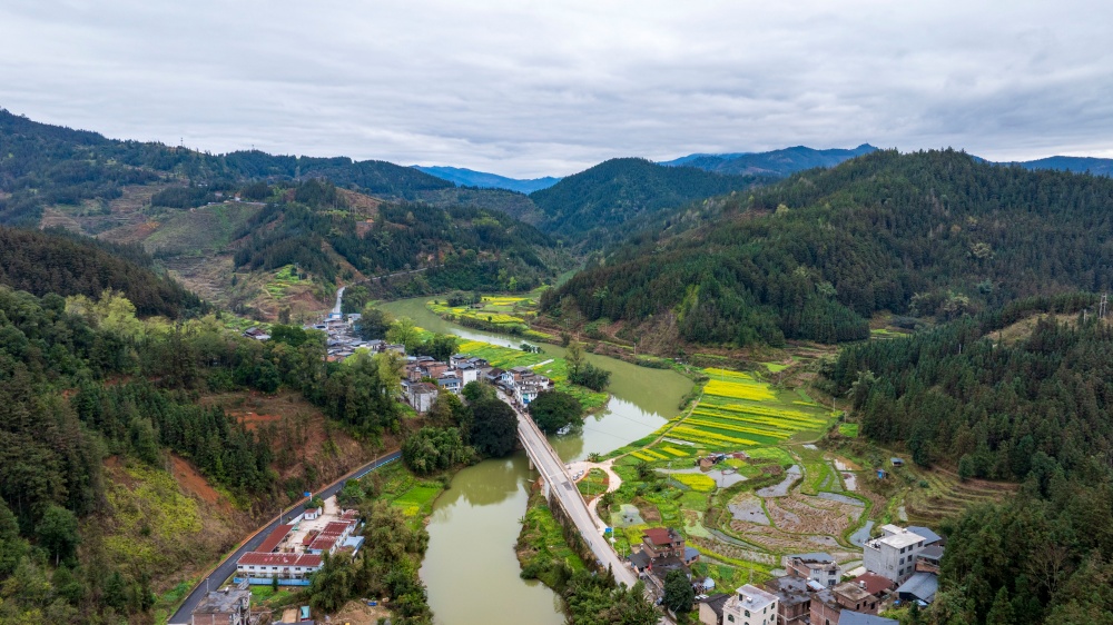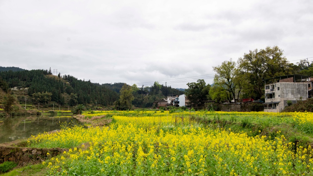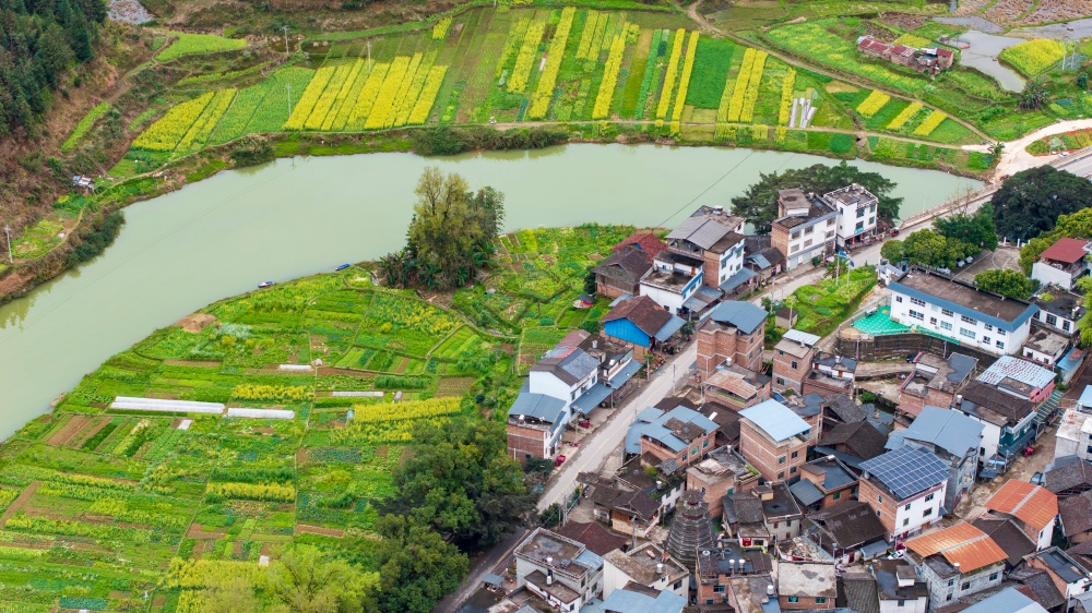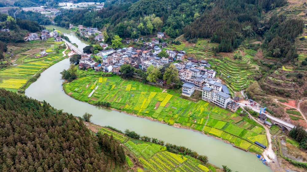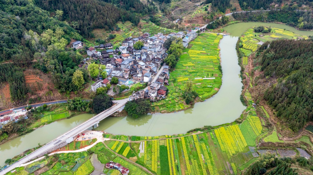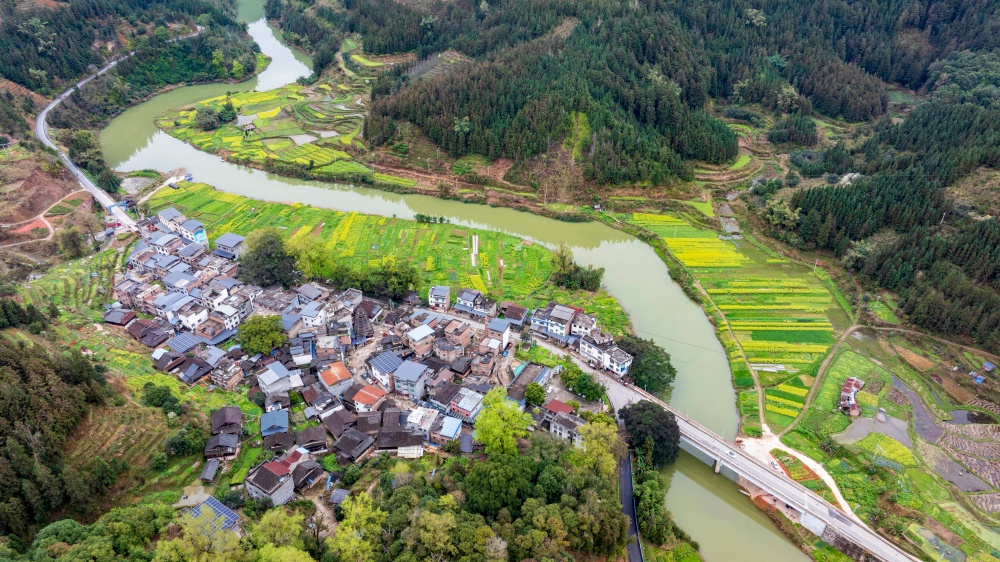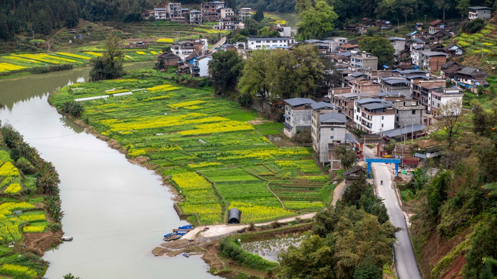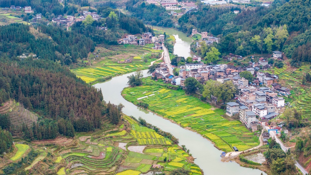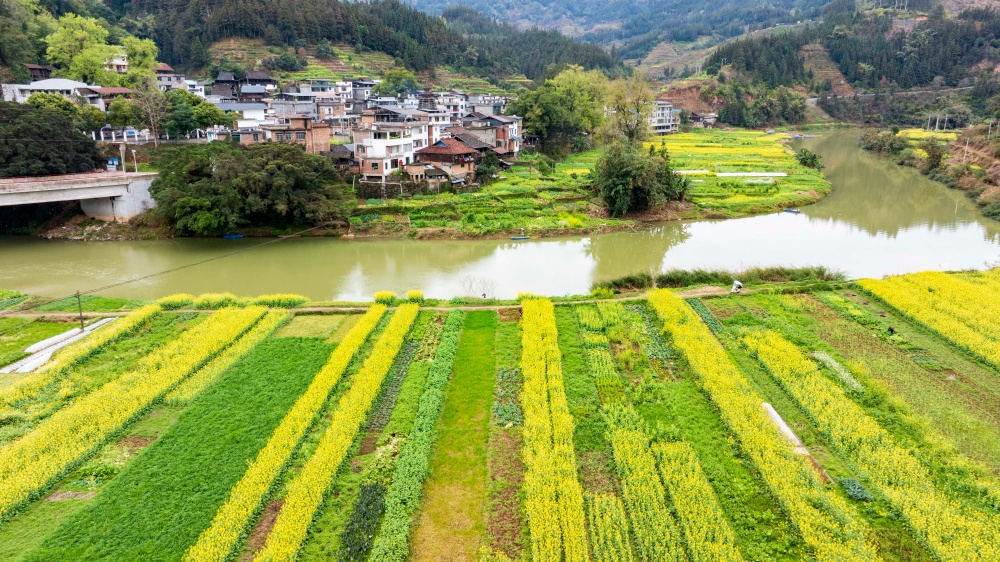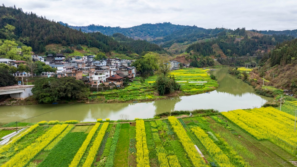 早春时节,气温回暖,贵州省黔东南苗族侗族自治州从江县丙妹镇长寨村的油菜花竞相绽放,与民居、田野、道路、河流、青山等相互映衬,构成了一幅生态宜居的乡村画卷。