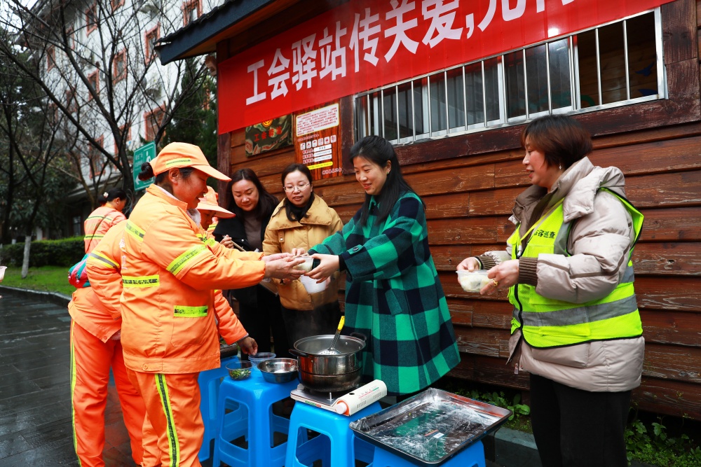 “元宵节能吃到工会送的爱心饺子,还收到大礼包,我们真的感到特别温暖。今后我们一定坚守岗位、尽职尽责,把美丽剑河打扫得干干净净、整整齐齐。”顺意(贵州)环境产业有限公司片区巡查管理员潘盛莲坚定地说。