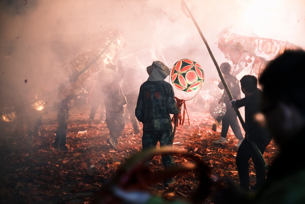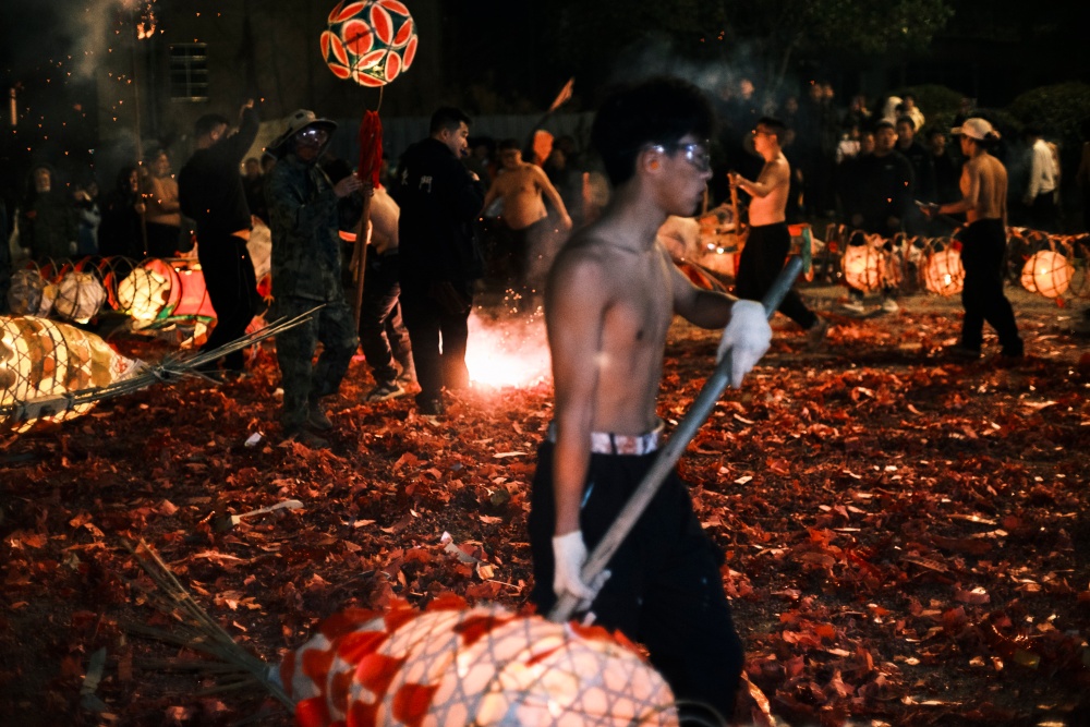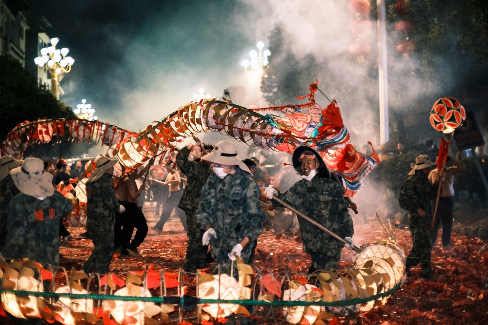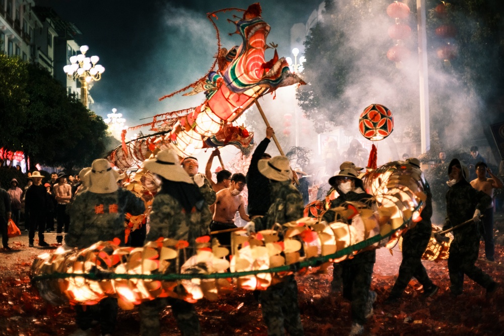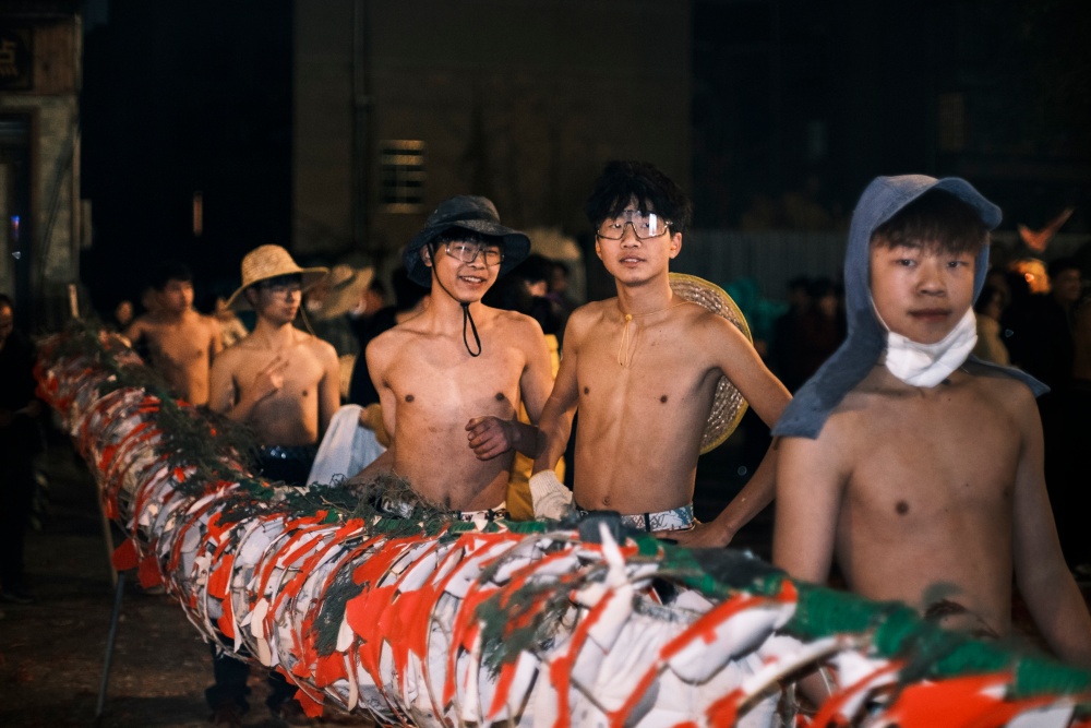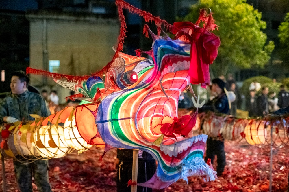 城关区花园炸龙点是当晚的核心现场,早早便被前来参与和观赏的人群围得水泄不通。大家手持绑满鞭炮的竹竿,目光灼灼地等候着亮龙登场,锣鼓声阵阵响起,为这场民俗狂欢拉开序幕。一条条以竹篾为骨、彩纸为衣的亮龙昂首而出,龙目圆睁、龙鳞熠熠,舞龙汉子们全副武装,紧握龙把,在节奏明快的鼓点中昂首前行。