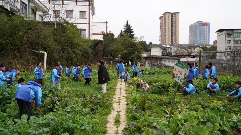 除了知识的启迪,学校还将劳动教育搬进课堂。在该校劳动实践基地内,一场生动有趣的“春耕”活动正在进行。孩子们手持小锄头,弯腰除草、松土播种,体验农耕之乐。老师们则抓住时机,把节气、农事等知识融入到田间课堂,让学生在实践中学习,在劳动中成长。