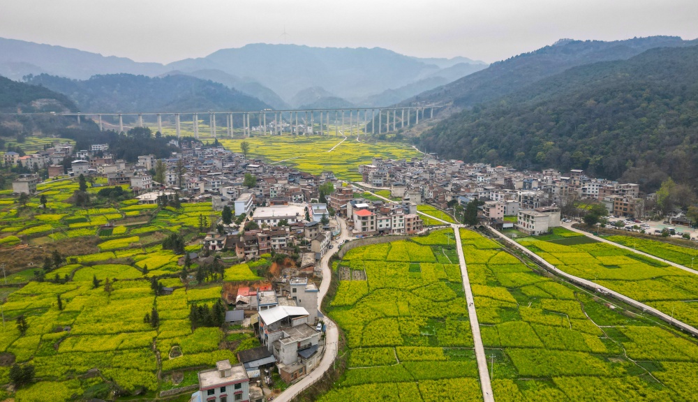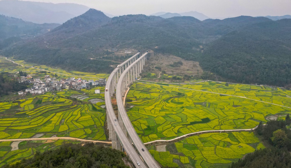 春日里,贵州省黔东南苗族侗族自治州从江县洛香镇上皮林村连片油菜花竞相绽放。金黄的花海层层叠叠,与穿境而过的高速桥梁、错落有致的村庄、郁郁葱葱的树林相互交织,微风拂过,花浪翻涌,勾勒出一幅生机盎然的田园画卷。