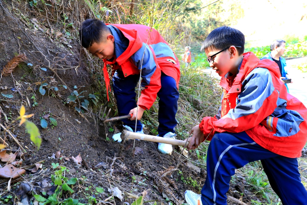 活动现场,在老师的有序带领下,学生们分组协作、分工明确,有的挥锹挖坑,有的扶苗定根,有的填土压实,每一道工序都做得认真规范,他们稚嫩的脸庞上满是专注与期待。在师生们默契的协作下,一株株充满生机的树苗迎风而立,为原本空旷的坡地披上了层层新绿。