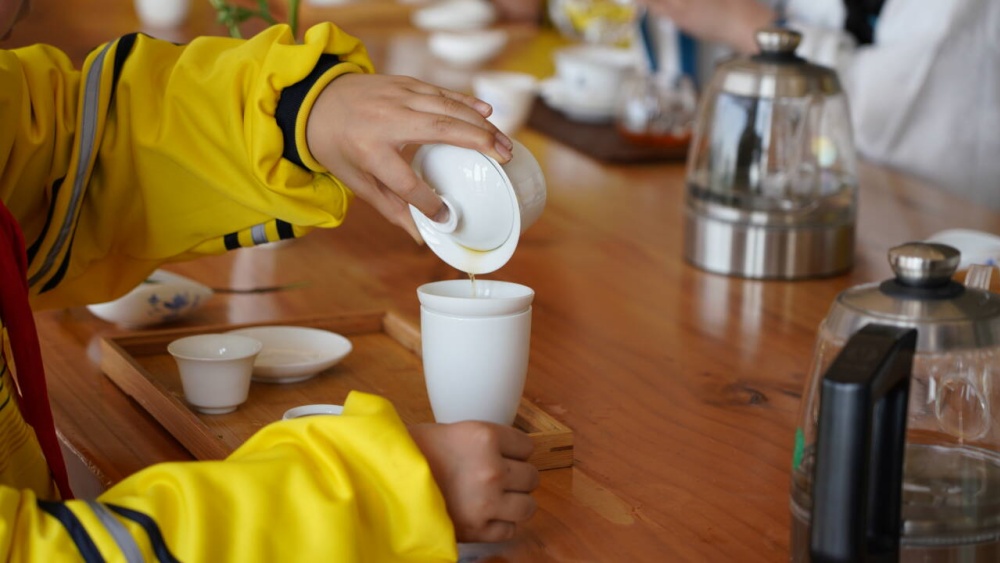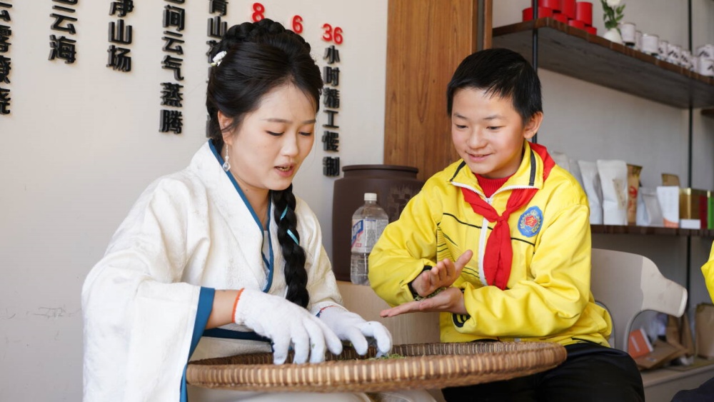 另一边的炒茶体验区,学生们围坐成圈,在茶艺师的指导下,依次体验杀青、揉捻、干燥等传统制茶工序。随着双手不断地翻抖、揉搓,刚采摘下的鲜叶逐渐变得蜷缩紧实,清甜的茶香随热气弥漫开来。孩子们在动手实践中,真切感受到匠心传承的力量。