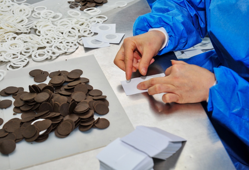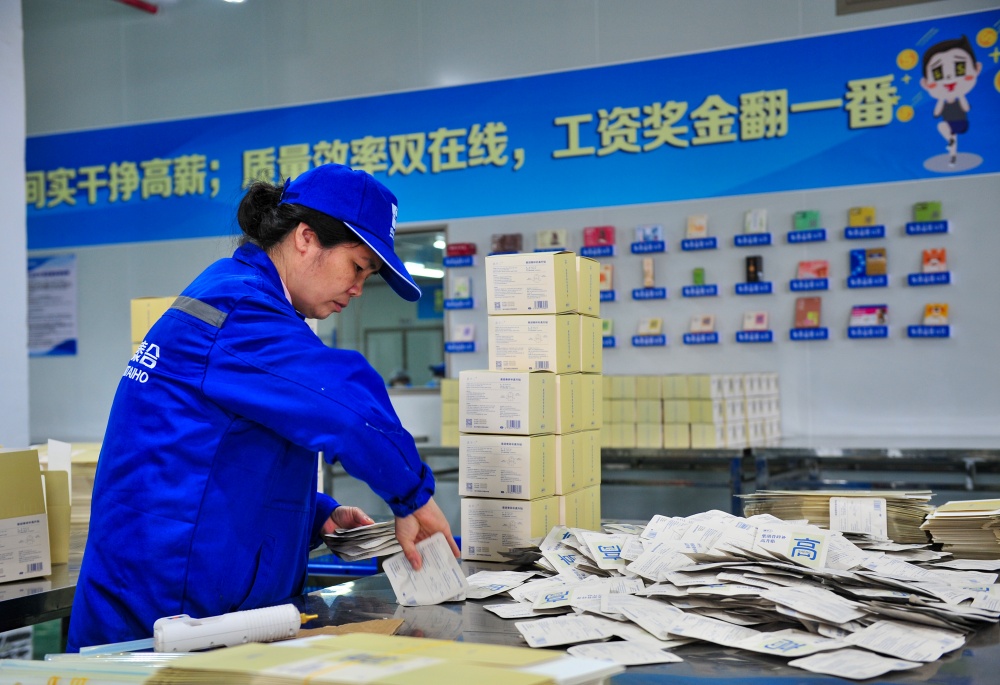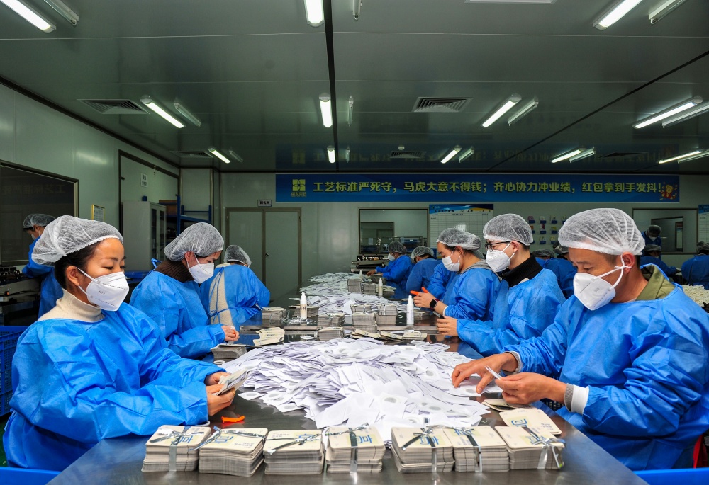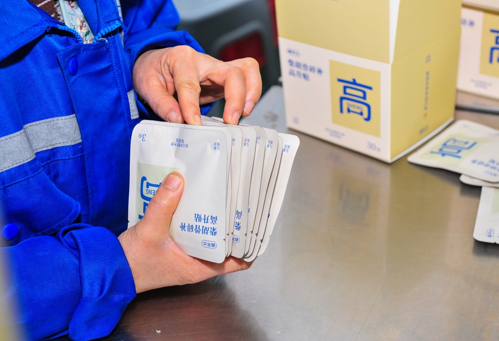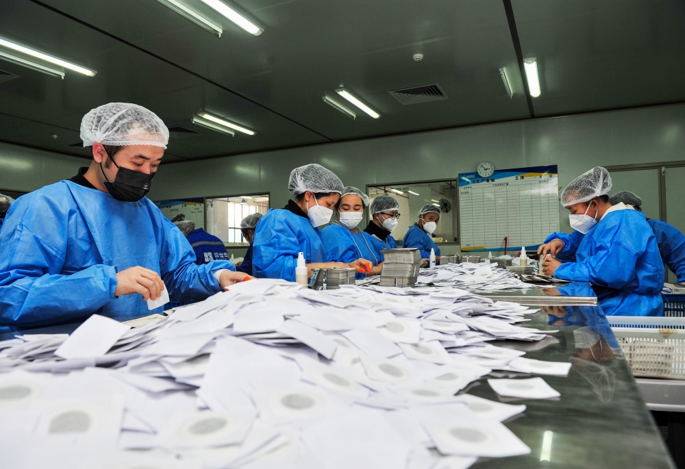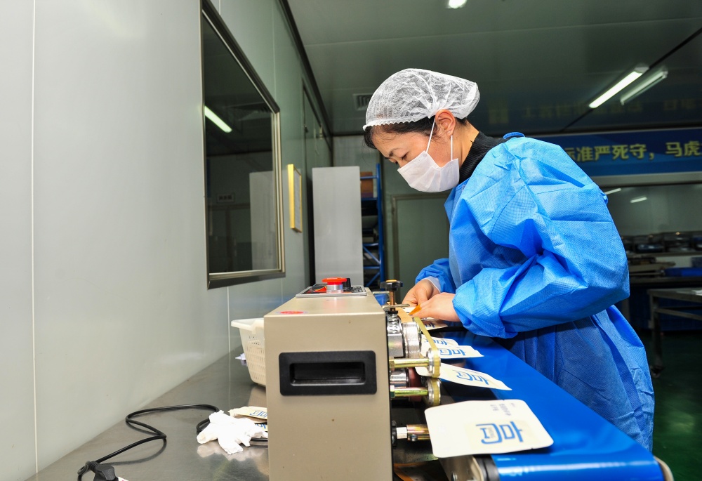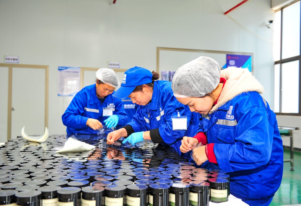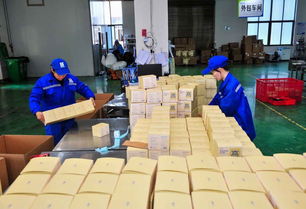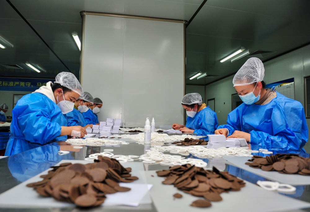 3月11日,工人在贵州省黔东南苗族侗族自治州从江县一家医药科技企业生产车间赶制订单产品。