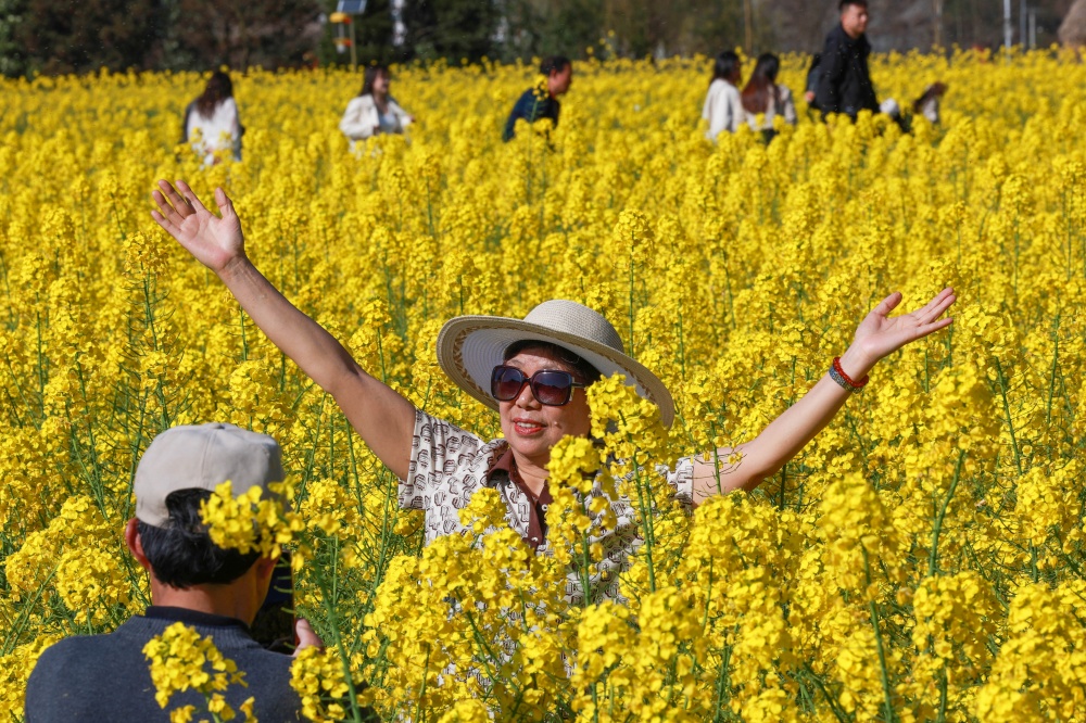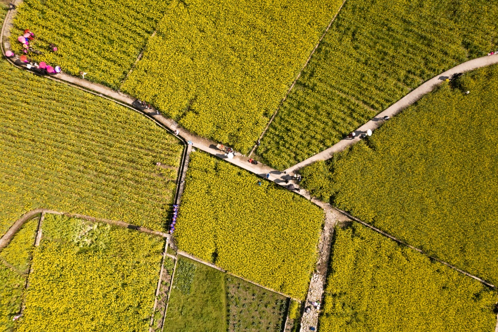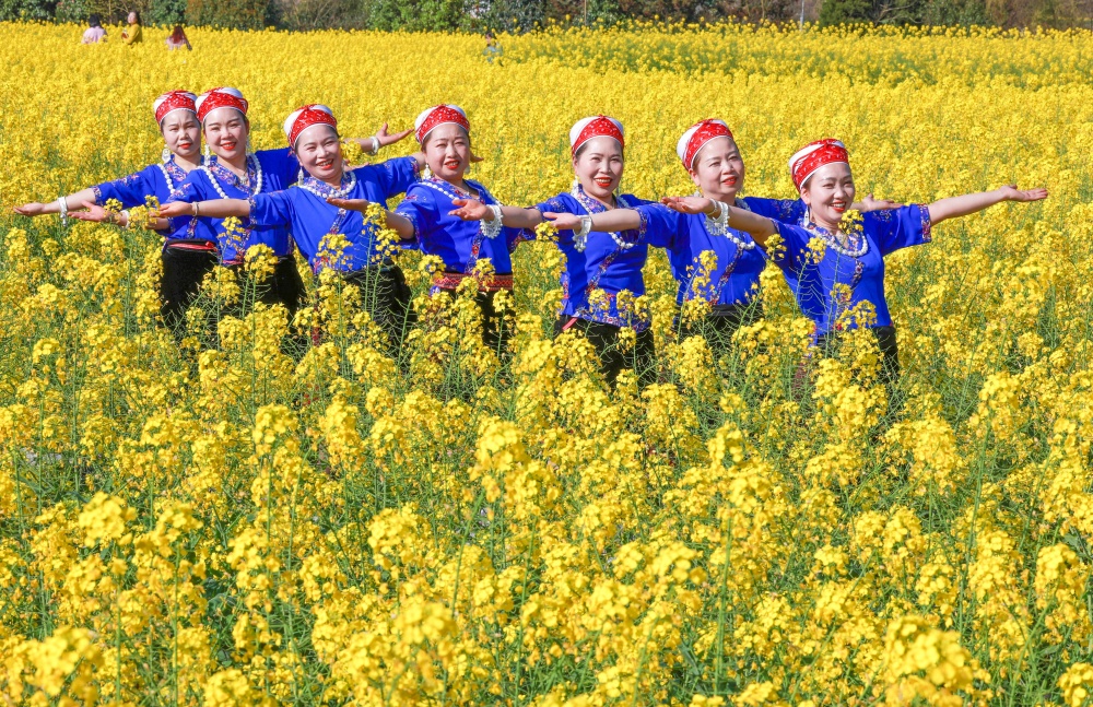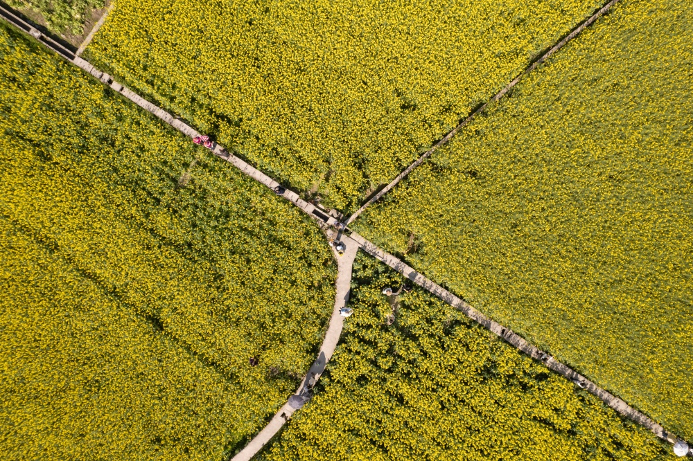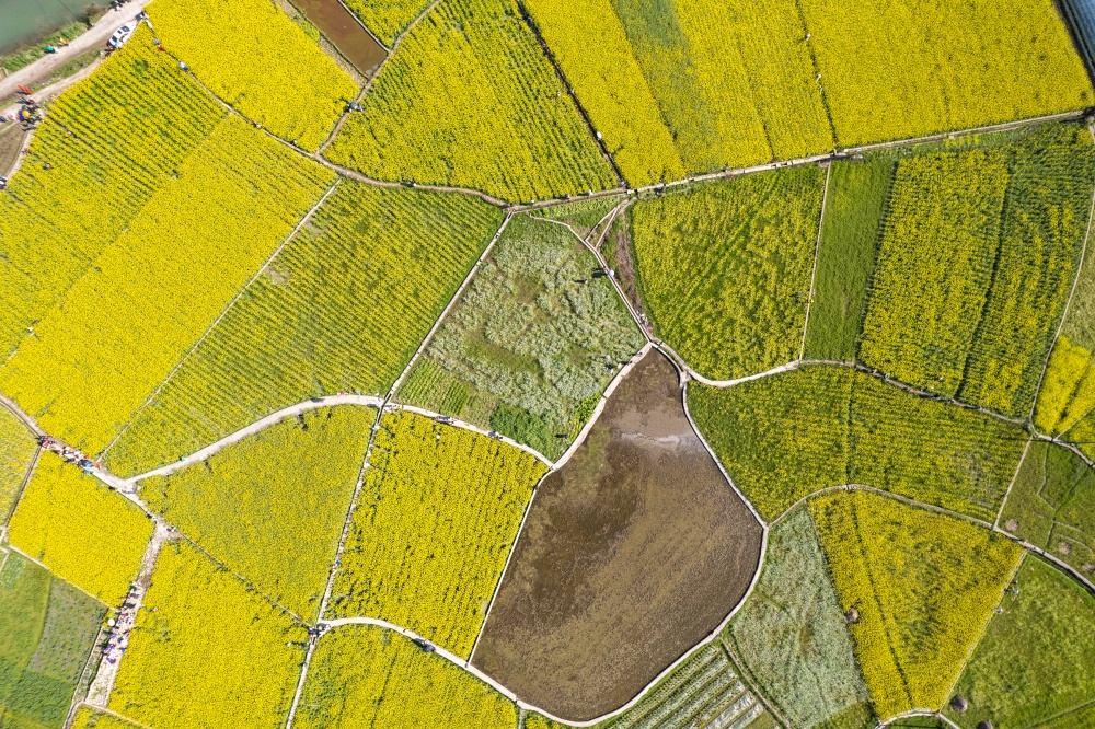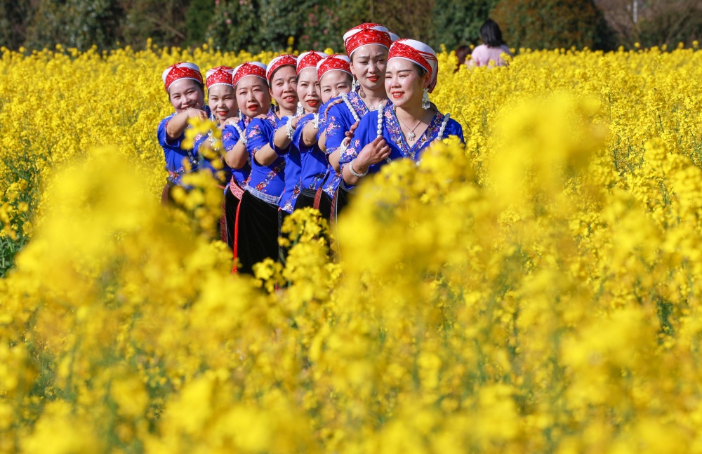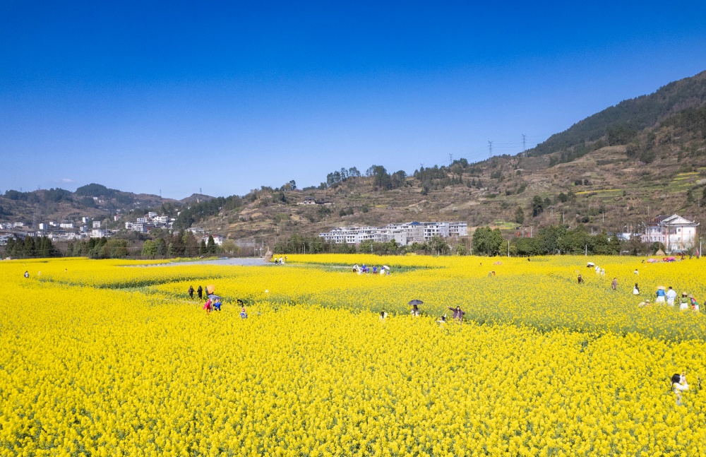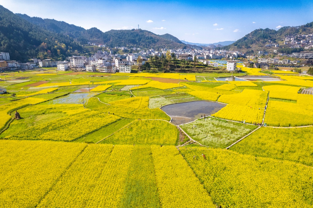 3月11日,贵州省黔东南苗族侗族自治州凯里市舟溪镇舟溪村连片油菜花竞相绽放。金黄的花海层层叠叠,与溪流、错落有致的村庄、郁郁葱葱的树林相互交织,微风拂过,花浪翻涌,勾勒出一幅生机盎然的田园画卷,吸引不少游客前来感受春日浪漫。