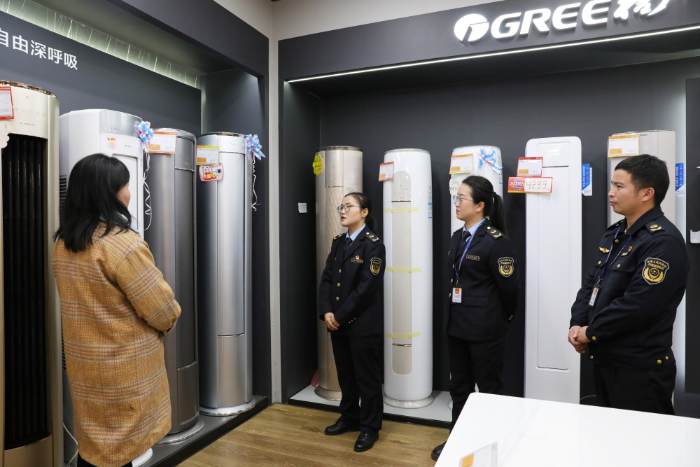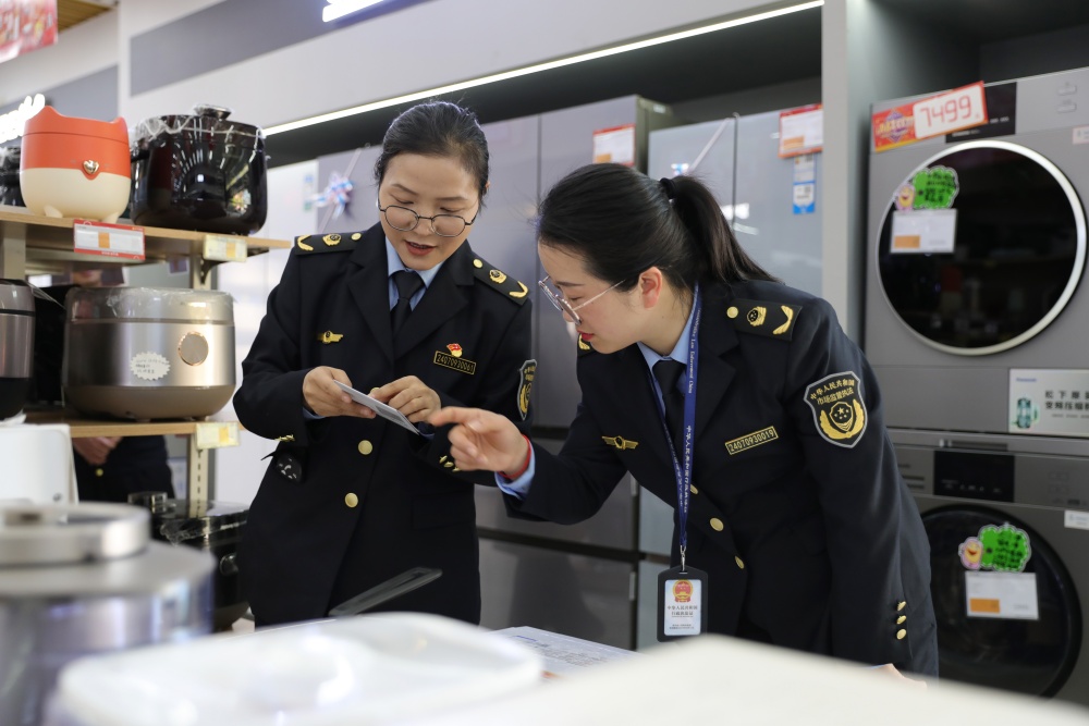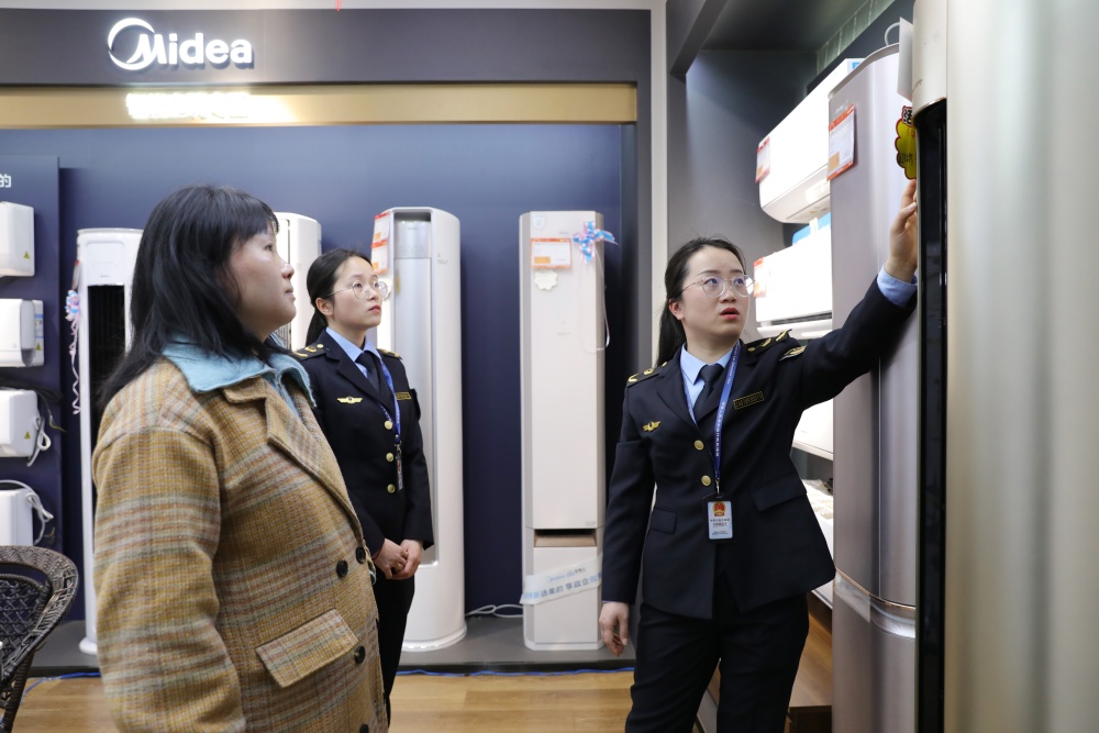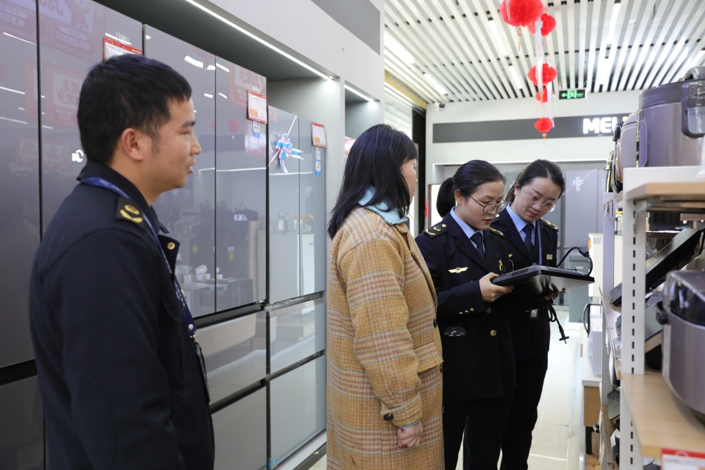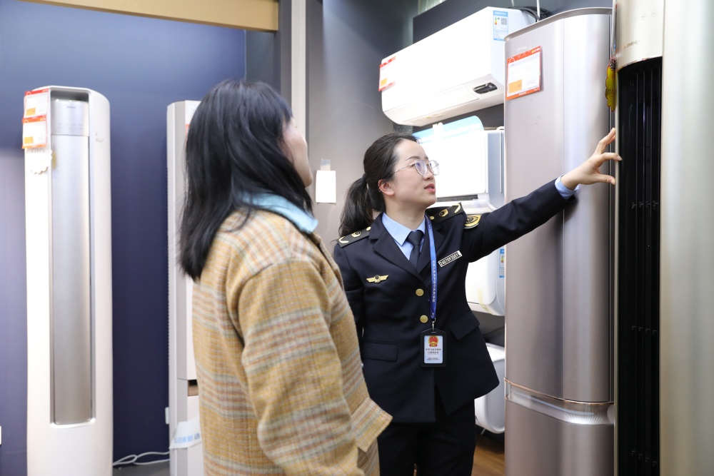 在一家品牌家电卖场,执法人员认真核对产品认证标识、能效等级和价格标签,督促商家规范执行以旧换新相关规定,让政策红利真正惠及百姓。