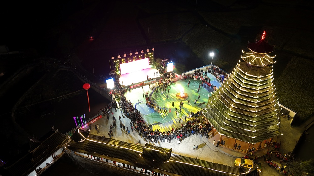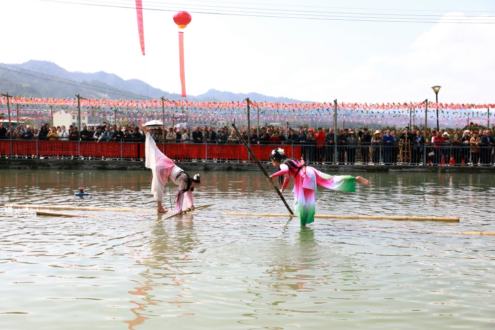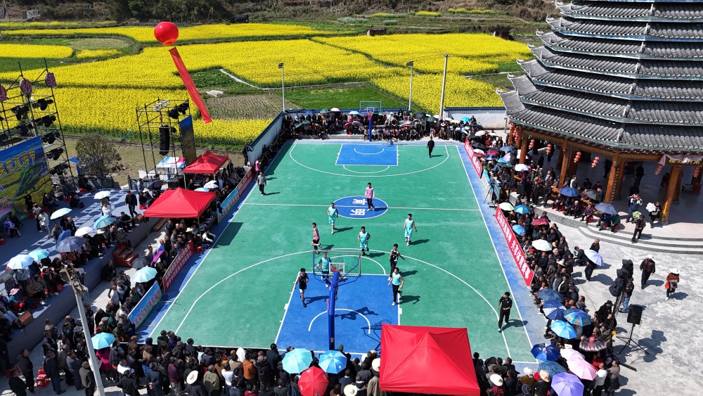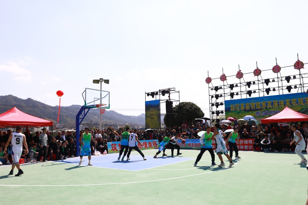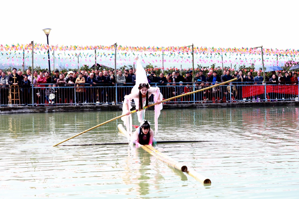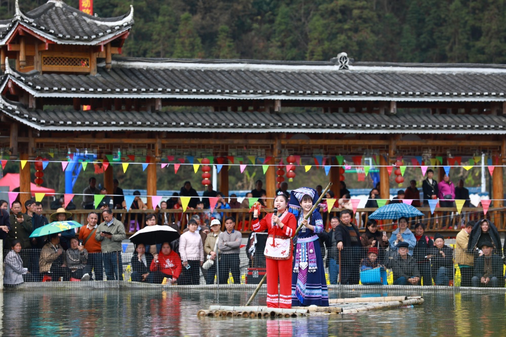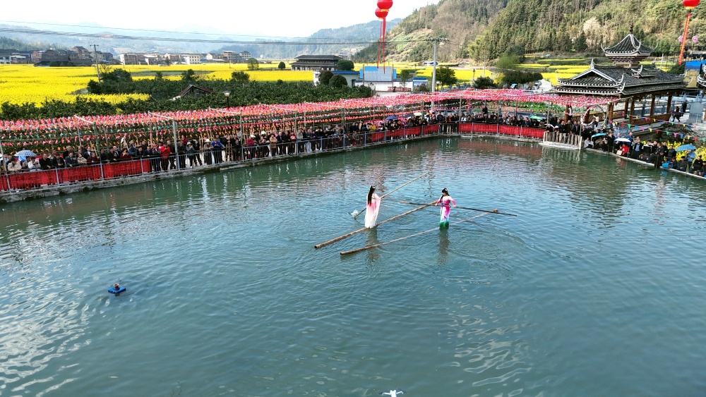 春日的南明大坝,连片油菜花如金色绒毯铺展田间,处处洋溢生机。活动现场亮点纷呈:篮球赛激情四射,队员奋力拼搏,观众喝彩不断;广西山歌悠扬婉转,悠扬歌声萦绕花海,尽显民族风情;水上独竹漂表演惊险灵动,表演者踏竹穿行,赢得阵阵掌声;乡村市集上,菜籽油、油茶等本地农特产品与乡土美食琳琅满目,既丰富游客体验,也为农产品搭建了销售桥梁。夜幕降临,篝火晚会热闹开场,游客与当地群众载歌载舞,欢声笑语热闹了春夜。