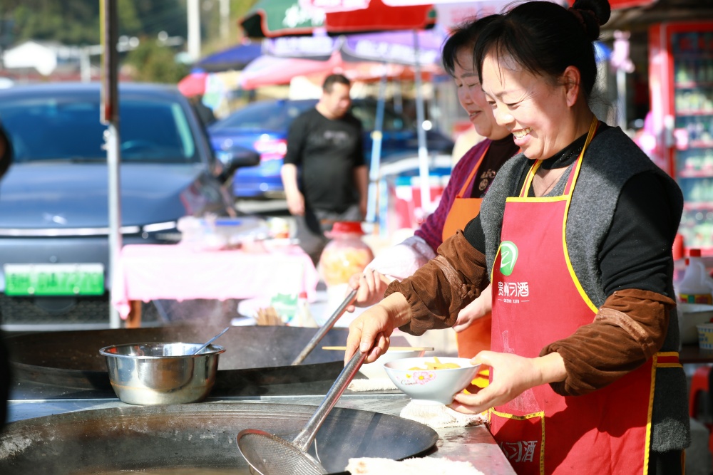 现场不少周边游客专程前来,赏花海、品美食、享乐趣,沉醉于乡村春日美景中。“今天阳光明媚,这里的油菜花盛开了,非常漂亮,置身于这片花海,感觉身心愉悦,非常惬意,我们也拍了很多照片。南明的灰碱粑也是非常好吃,我不但吃了两碗,还带了一些给家人品尝。”游客陈女士笑着说。