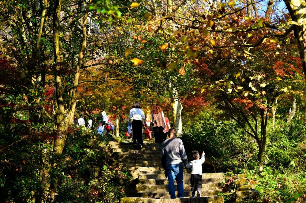 正如游客们所说,徒步登山,漫步青石古道,与大地、草木“对话”,仿佛忘却了尘世。蜿蜒的小径两旁,屹立千百年的参天古树静静守候,令人心生逍遥之感。站在香炉山景区,春日阳光将这里折射成金色,美得耀眼,让游客在现代都市的喧嚣中找到一片内心的宁静与平衡。