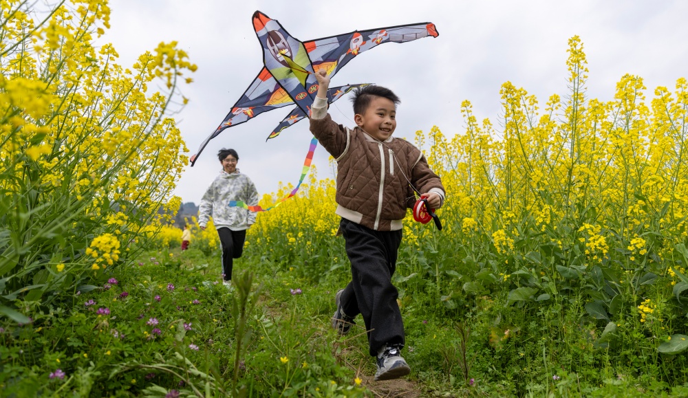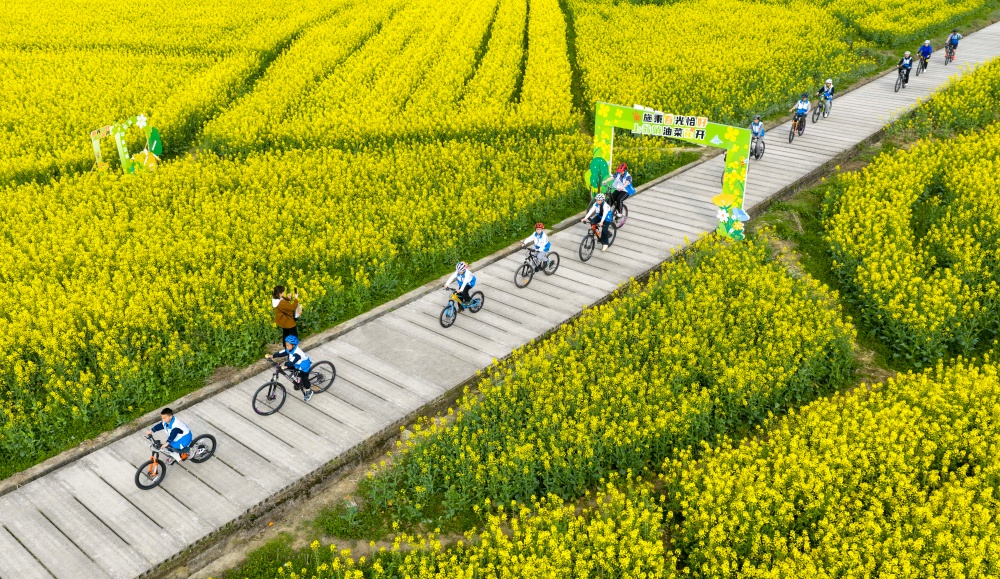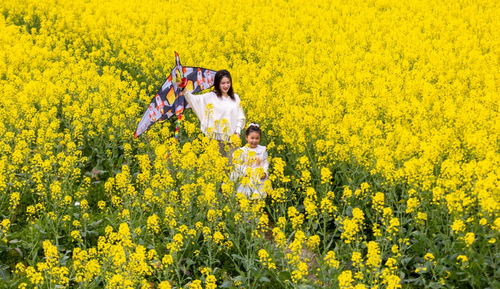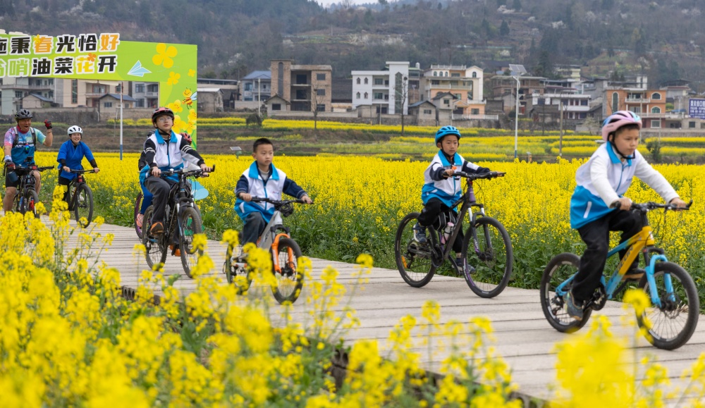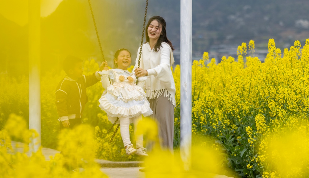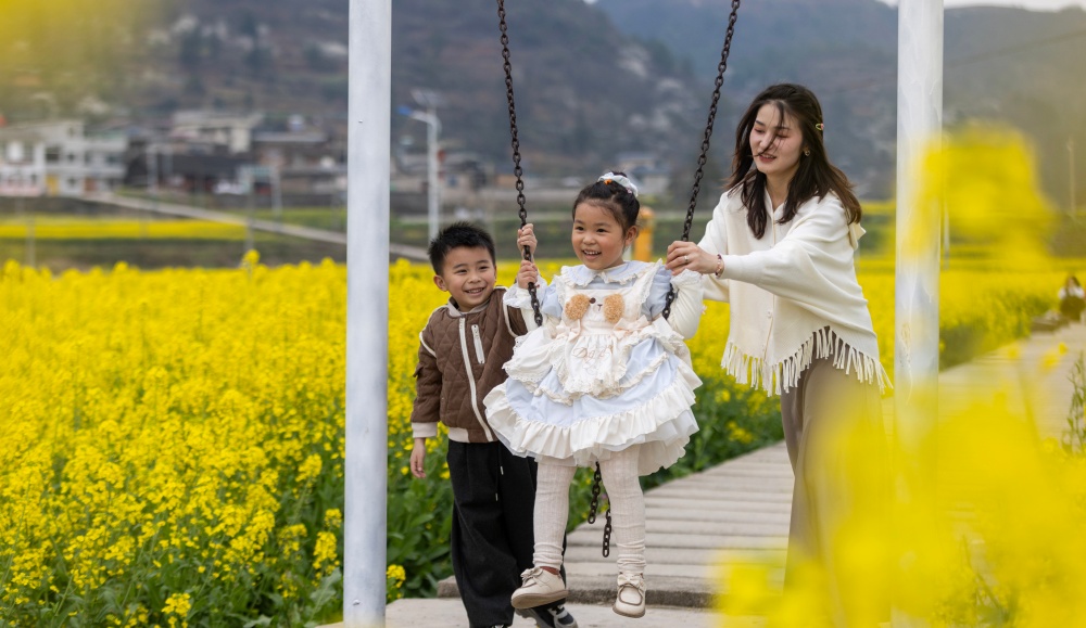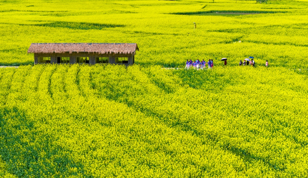 早春时节,贵州省黔东南苗族侗族自治州施秉县城关镇上翁哨村千亩油菜花竞相绽放,宛如一片金色海洋,吸引众多游人纷纷前来踏青游玩,尽享春日美好时光。