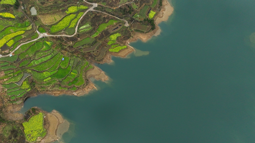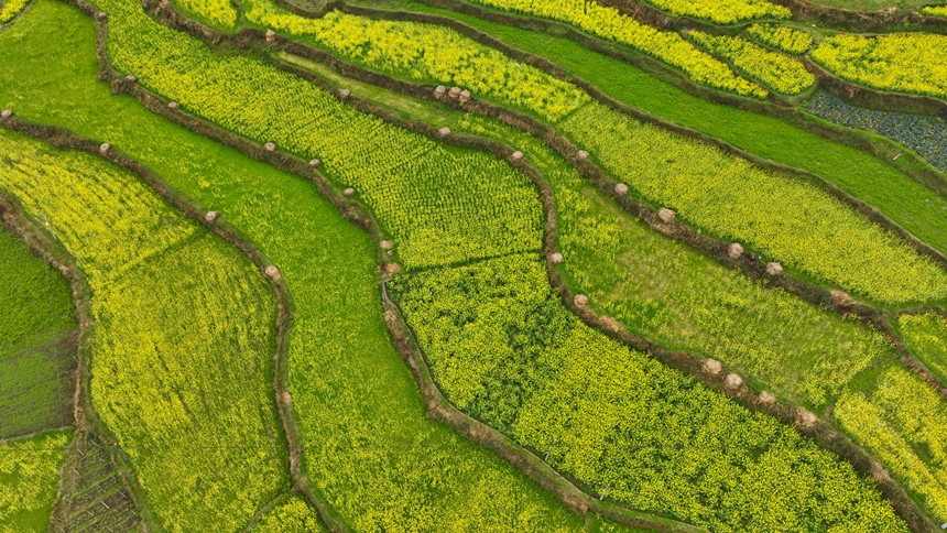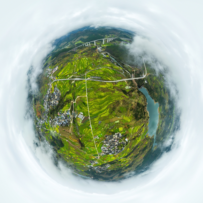 早春时节,贵州省黔东南苗族侗族自治州丹寨县兴仁镇台辰村梯田油菜花开、草木吐新绿,一场春雨过后,从空中俯瞰,田野、乡村、雨雾相映成景,宛如一幅幅春日画卷。