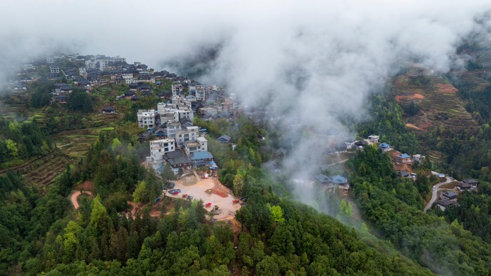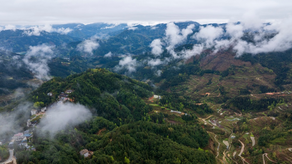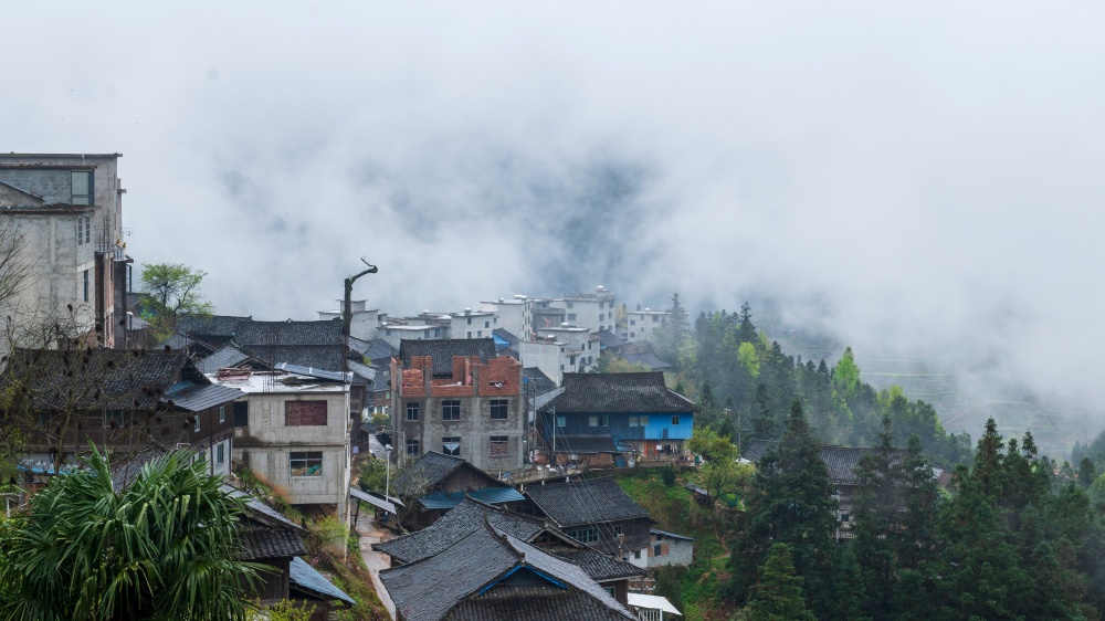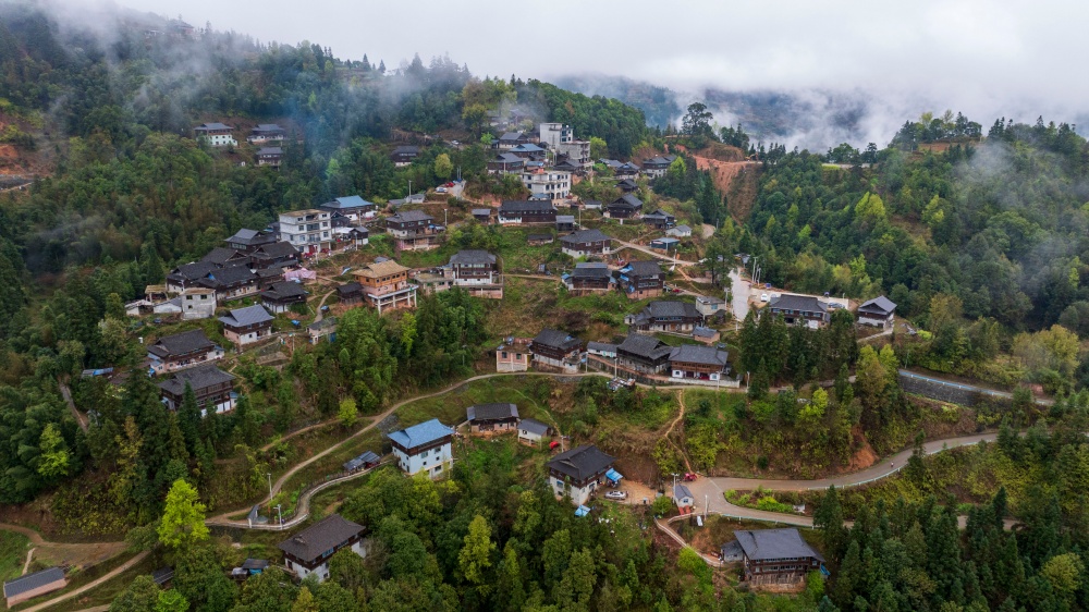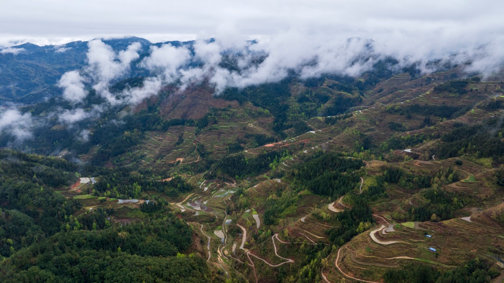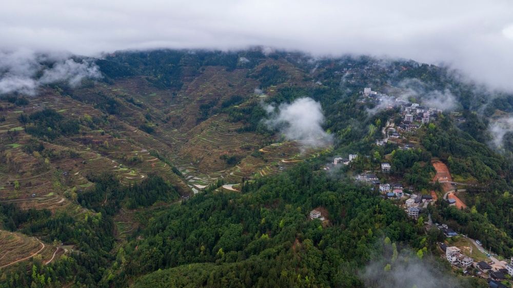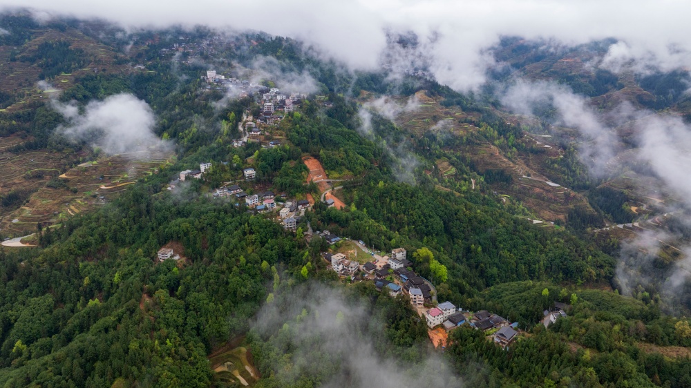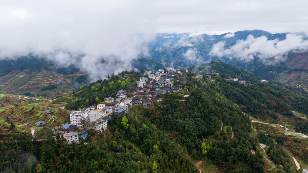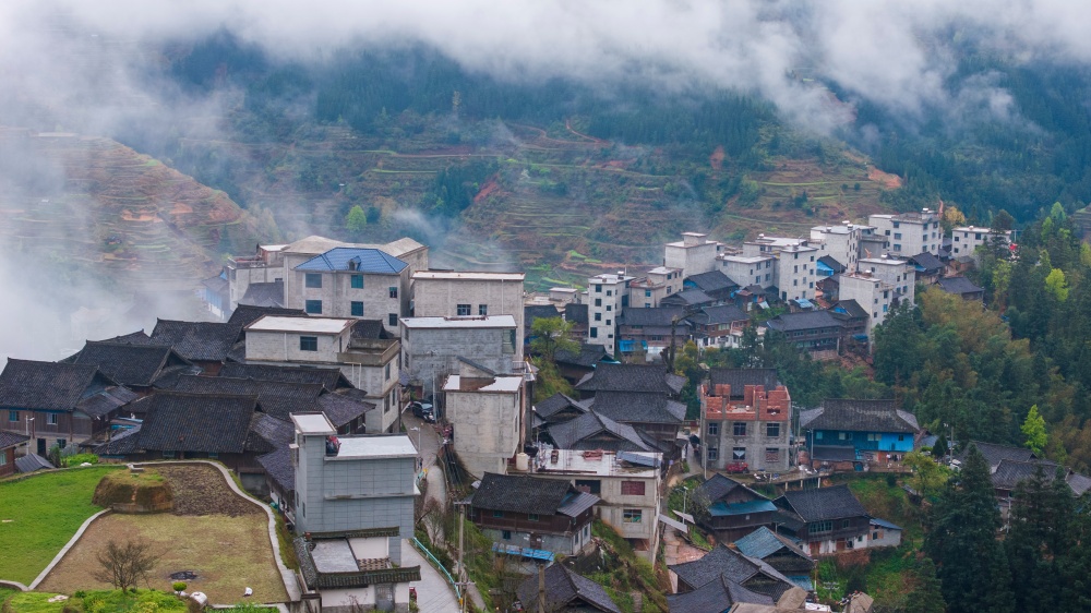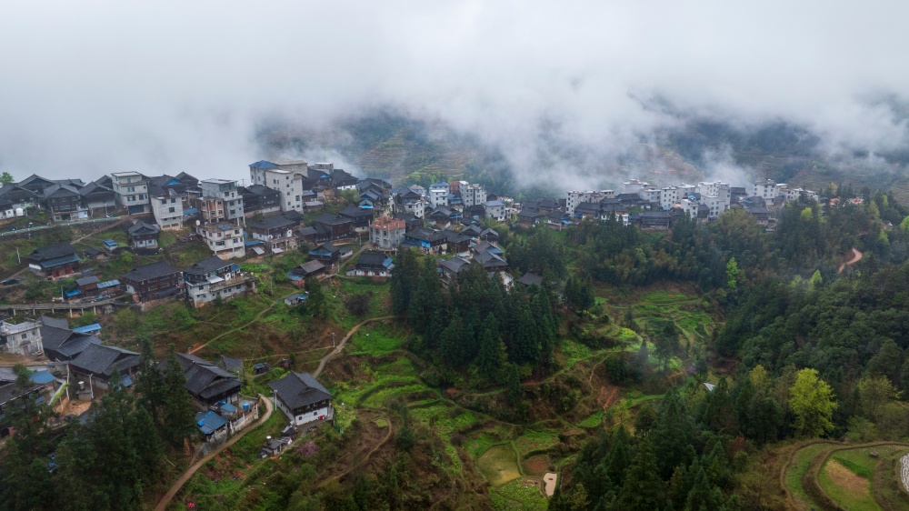 当日,烟雨中的贵州省黔东南苗族侗族自治州从江县停洞镇加当村春色迷人,云雾缥缈,层叠的梯田与郁郁葱葱的青山、错落有致的民居交相辉映,宛如一幅秀丽的山村画卷。