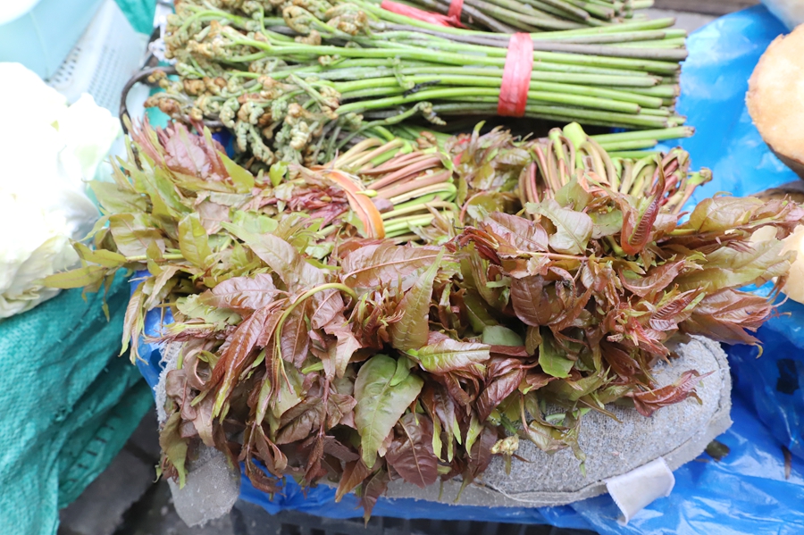 香椿作为春日“限定美味”,紫红嫩芽香气浓郁,深受市民青睐。零售价约5元/斤。
