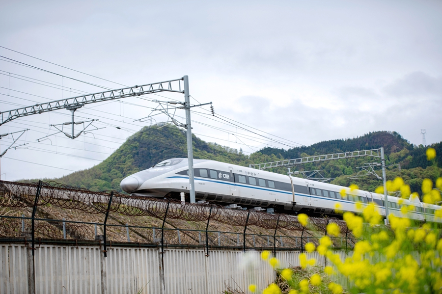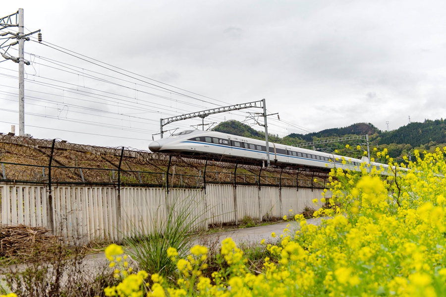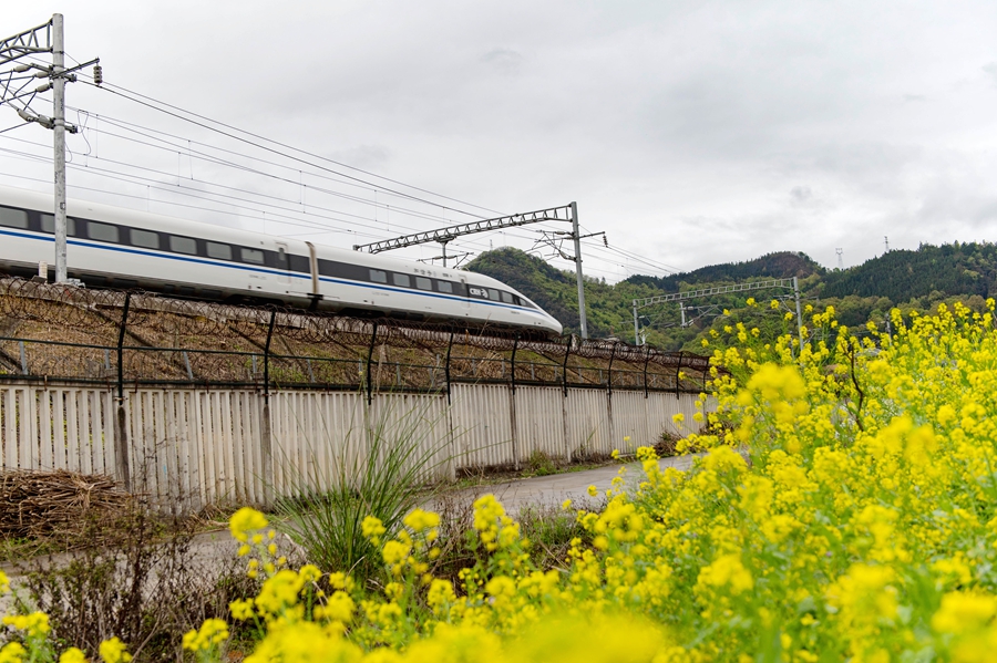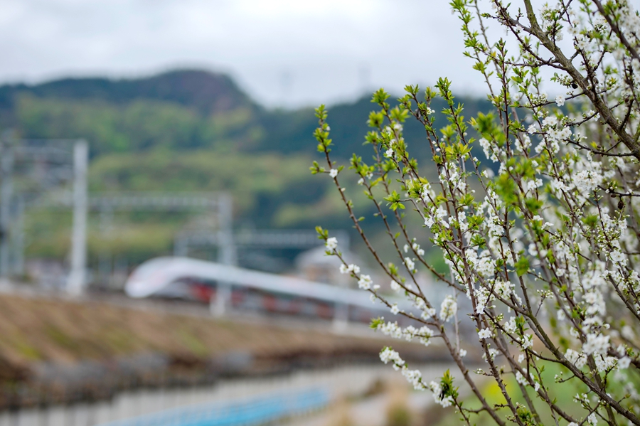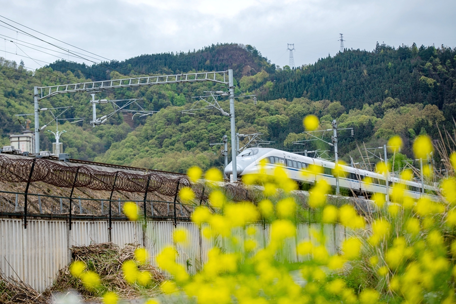 仲春时节,从江县境内的油菜花、桃花、李花竞相绽放,动车组列车穿行其间,美不胜收。
