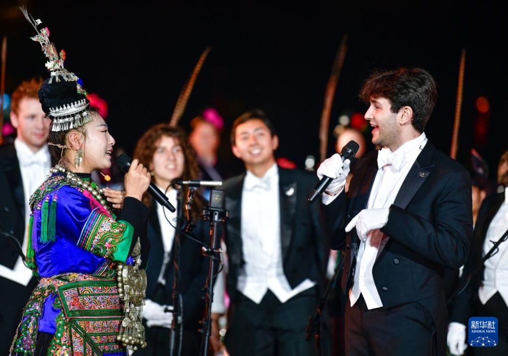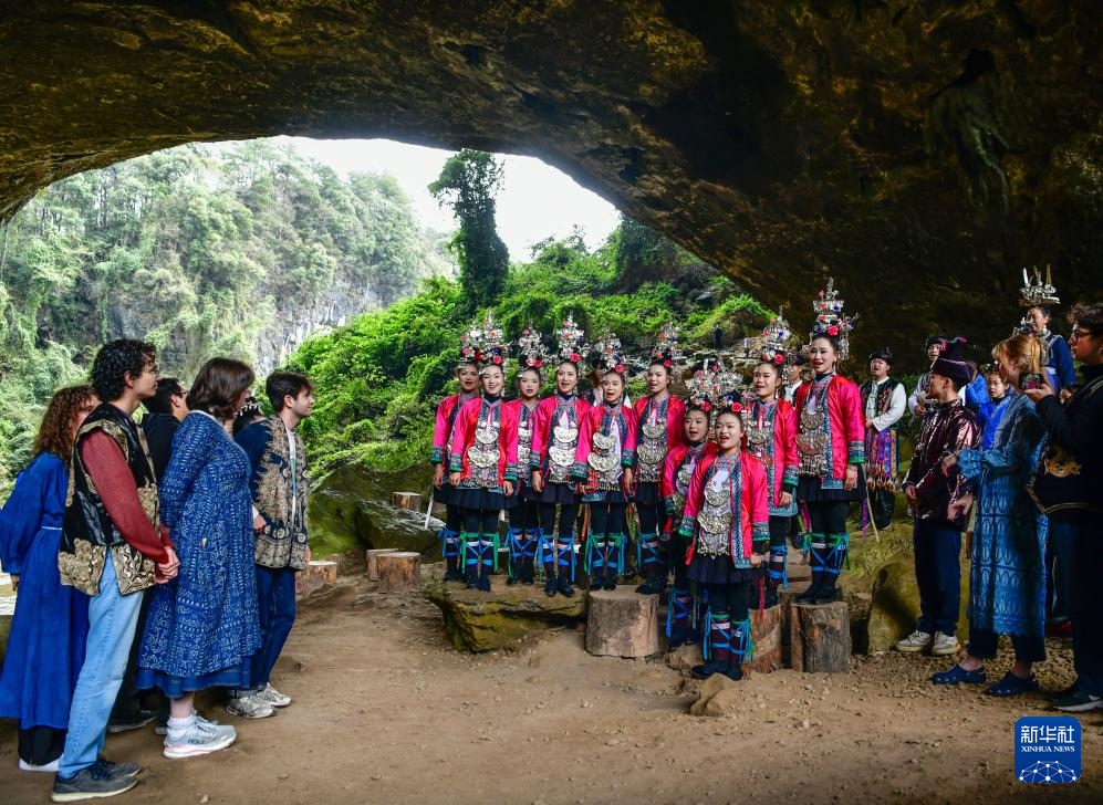 24日,贵州黔东南苗族侗族自治州黎平县高屯街道天生桥景区,天然和声在亿年天然石拱桥下自然混响,悠扬的侗族大歌与时尚的阿卡贝拉形成美妙共鸣,现场沸腾为歌声的海洋。