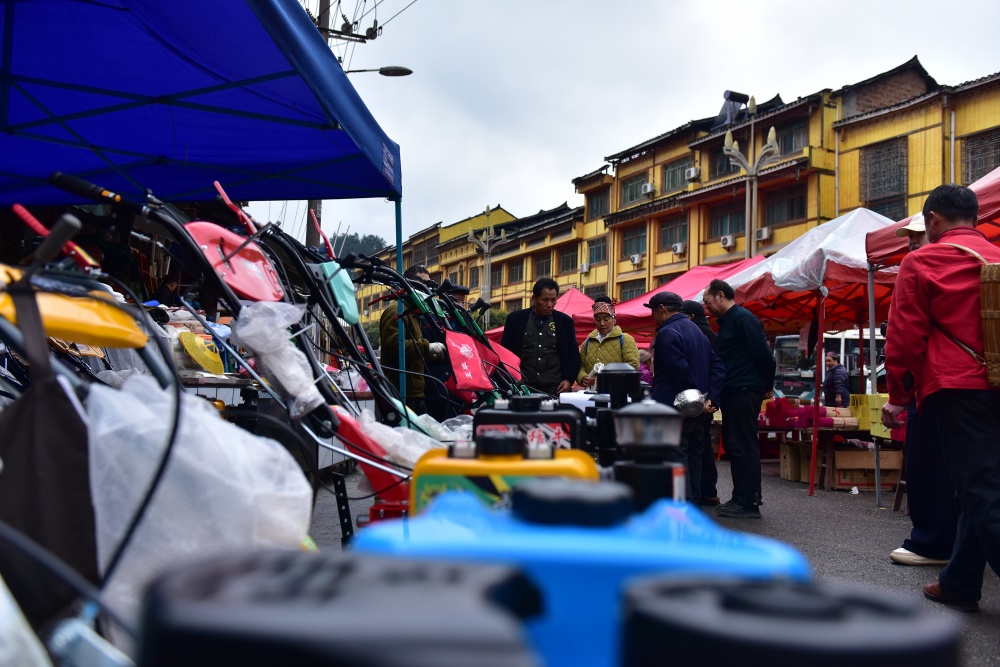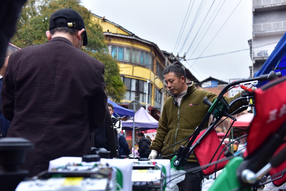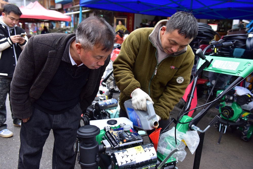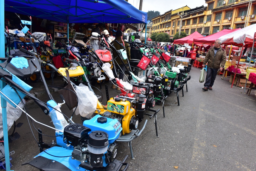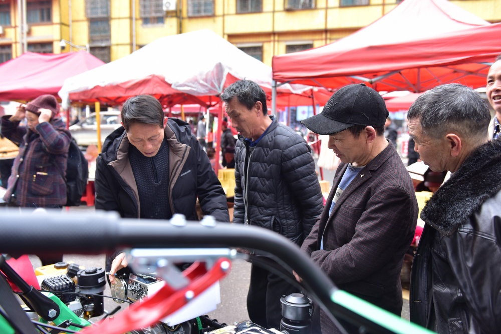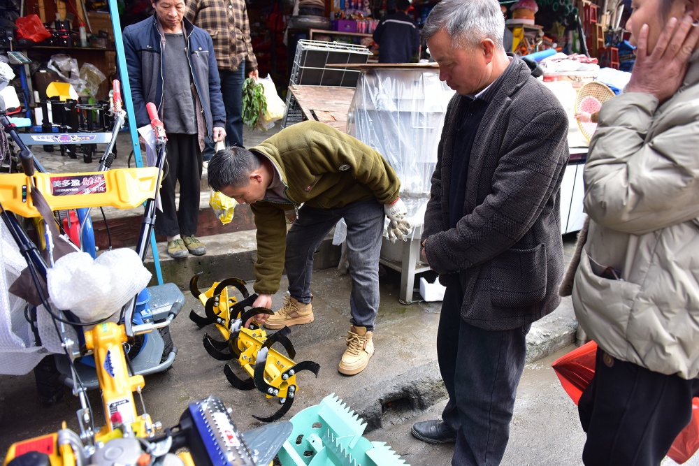 春回大地,农耕正忙。近日,剑河县岑松镇赶场日热闹非凡,集镇内各农机售卖点前,一排排崭新的微耕机整齐摆放,吸引了众多农户驻足咨询、选购。