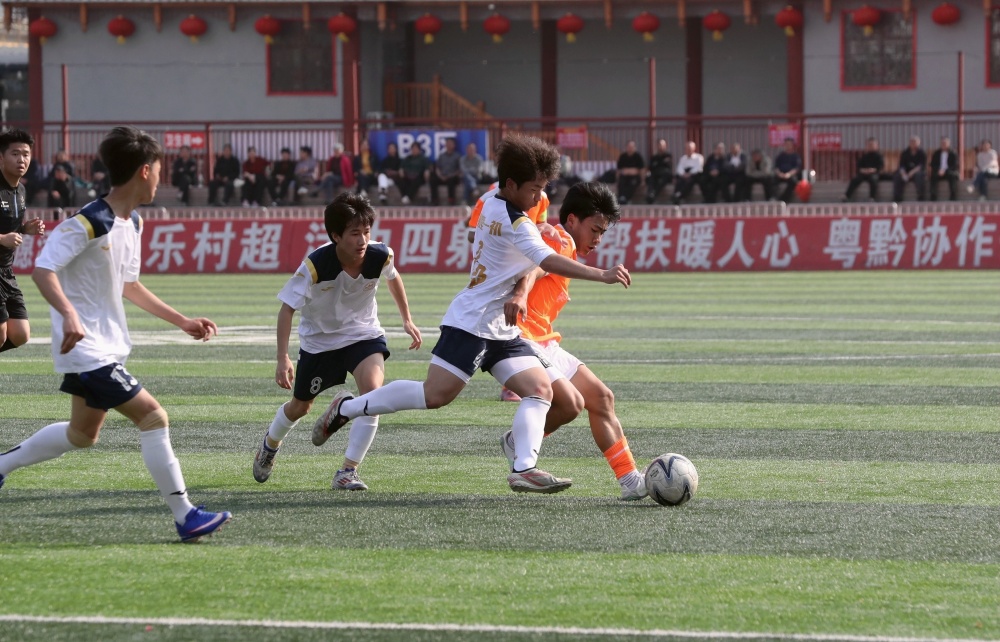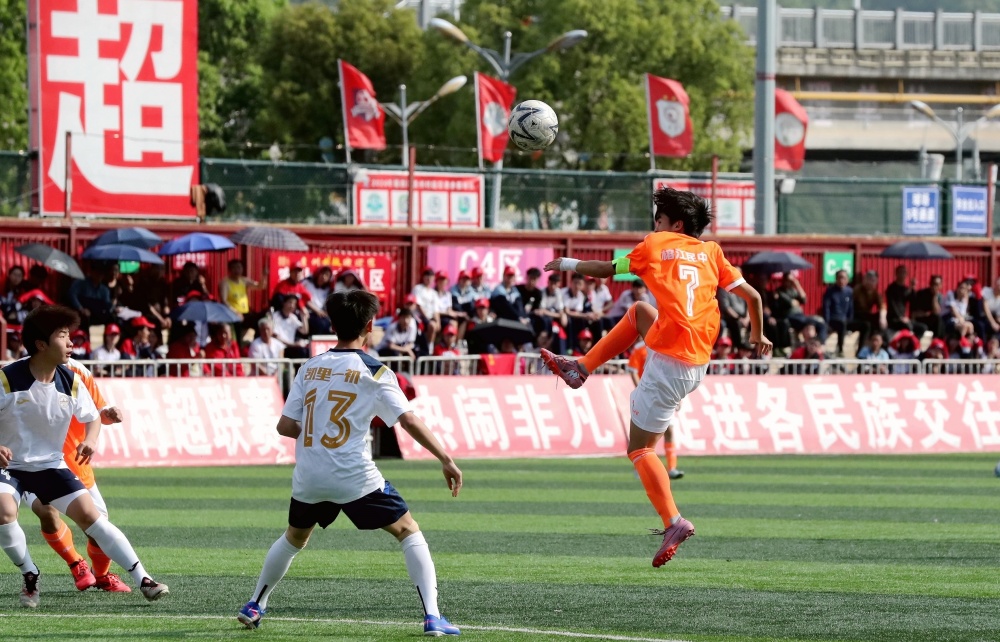 3月30日,在贵州省黔东南苗族侗族自治州榕江县城北新区“村超”足球场,榕江县民族中学足球队员(橙色衣)与凯里市第一初级中学足球队员在比赛中激烈拼抢。