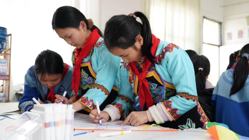 春假第一天,丹寨县扬武民族小学的学生们在学校的美术教室里忙活开来,孩子们用水彩笔在风筝纸张上天马行空,随心作画,不一会儿,小鱼、蝴蝶等一个个生动可爱,童趣十足的图案逐渐成型。