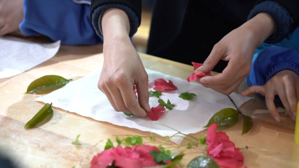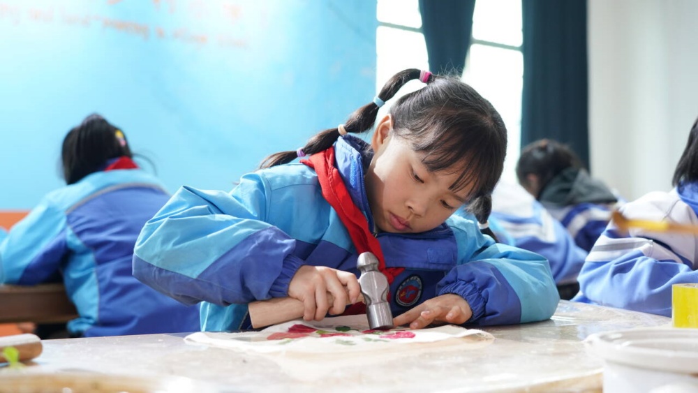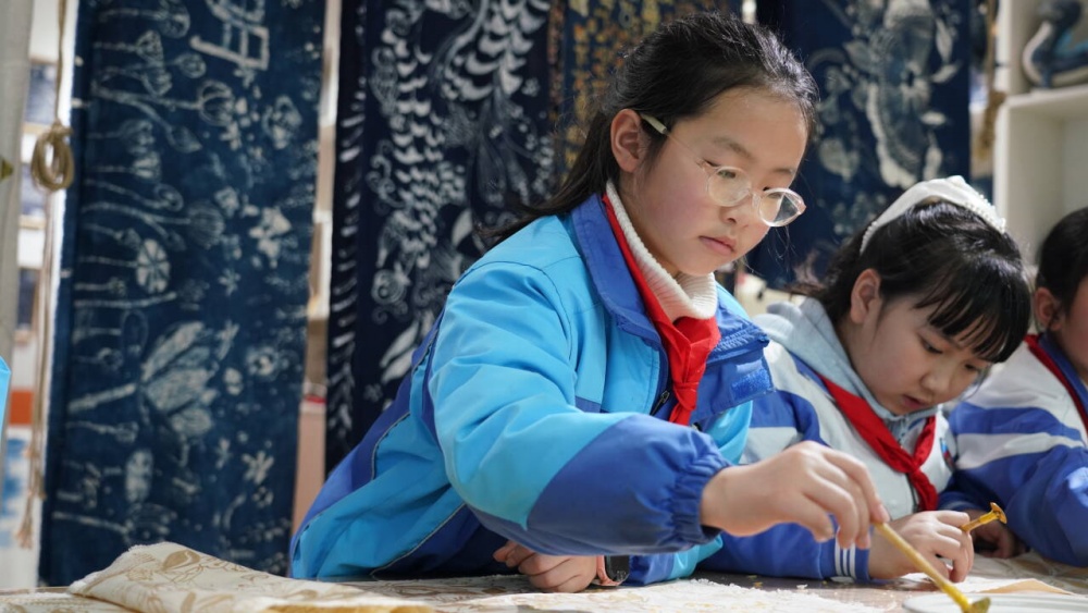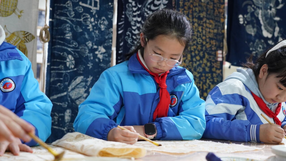 作为素有“非遗之乡”之称的丹寨,拥有丰富灿烂的民族文化,丹寨县城关第一小学则依托这一丰厚的“家底”,利用假期,为学生开启了独具特色的非遗“小课堂”,孩子们在传承人的指导下,手持蜡刀,勾勒纹样,并用刚刚摘来的新鲜植物进行拓印点缀,一沾一点之间,古老的苗族蜡染技艺不知不觉缓缓流淌进了孩子们的世界。
