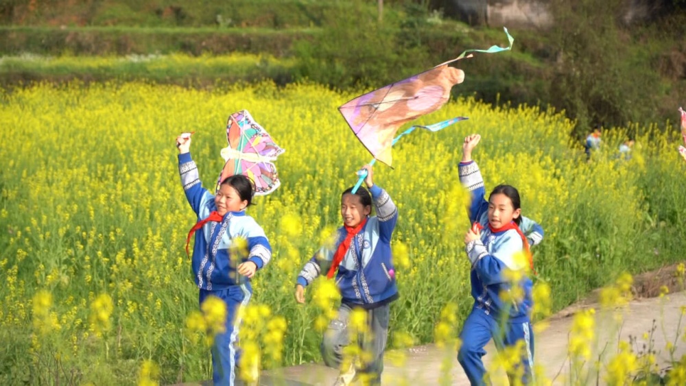 趁着春日好天气,老师带领孩子们来到田间地头放飞亲手绘制的风筝。伴随着迎风奔跑的身影,一只只绘满童年梦想的风筝扶摇直上,在金黄的油菜花田与湛蓝的天空映衬下,勾勒出一派生机盎然的春日童趣。
