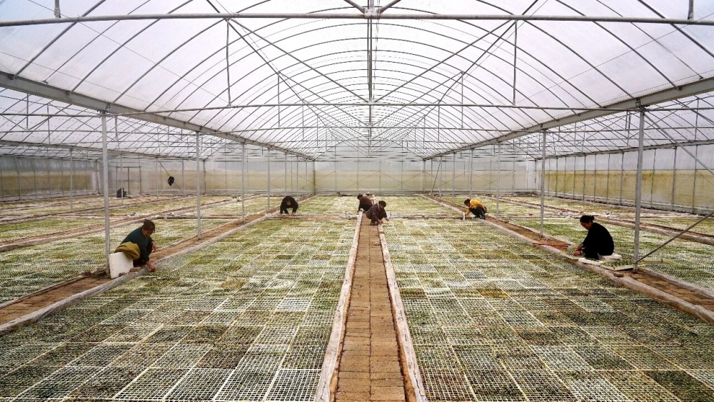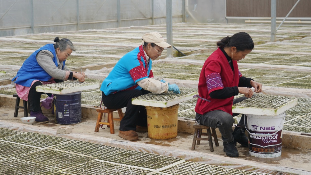 在大地乡河坝村辣椒集中育苗基地,温室大棚内嫩绿的辣椒幼苗破土而出、长势喜人。工人分工协作、动作娴熟,有条不紊地装盘、播种、覆土、浇水、间苗,用辛勤劳作孕育希望。