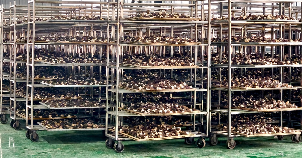采收下来的新鲜羊肚菌,很快便被送至基地附近新建的烘干厂房。修剪菌脚、分拣装筐、送入烘道烘干,浓郁的菌香溢满厂房内外。