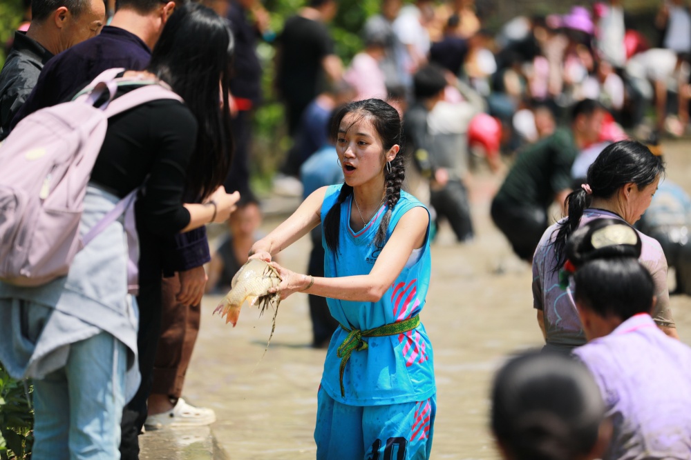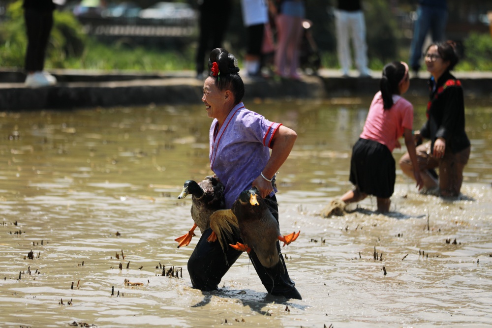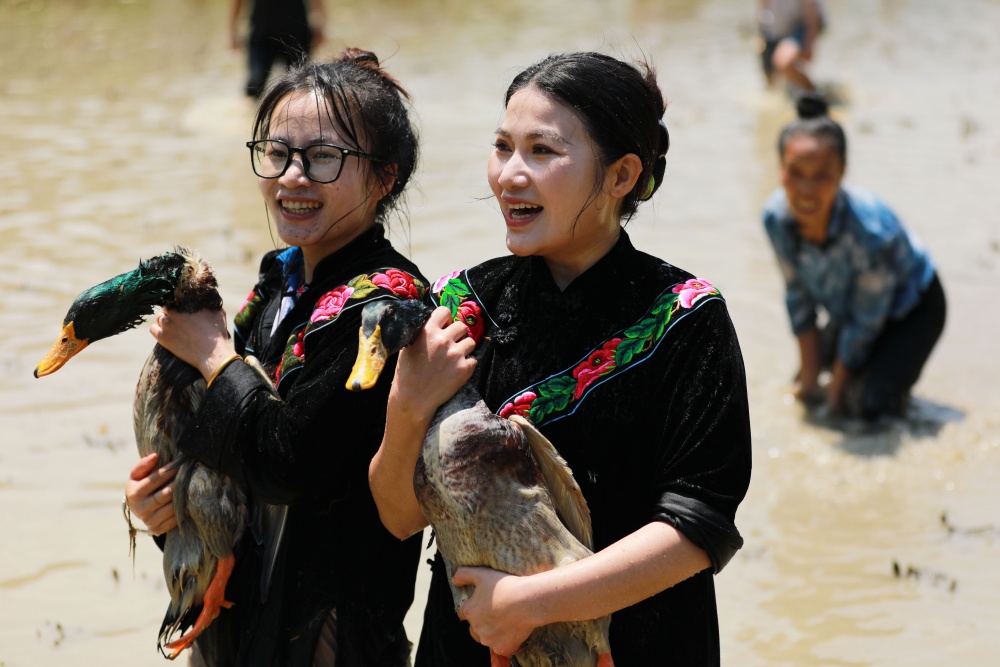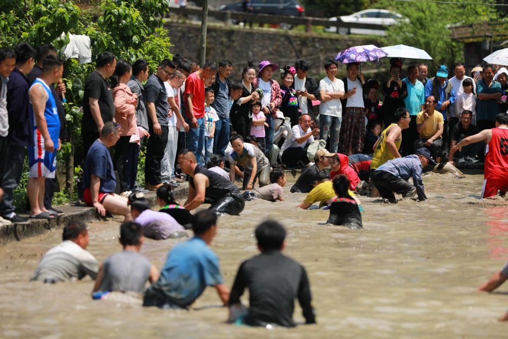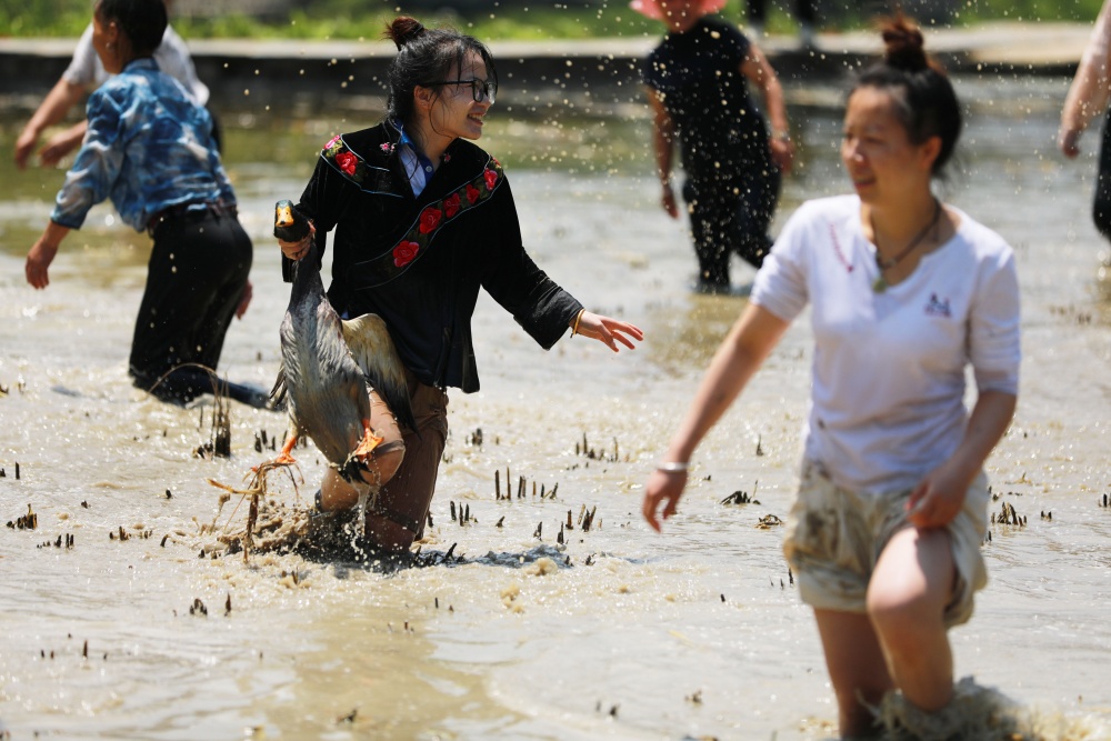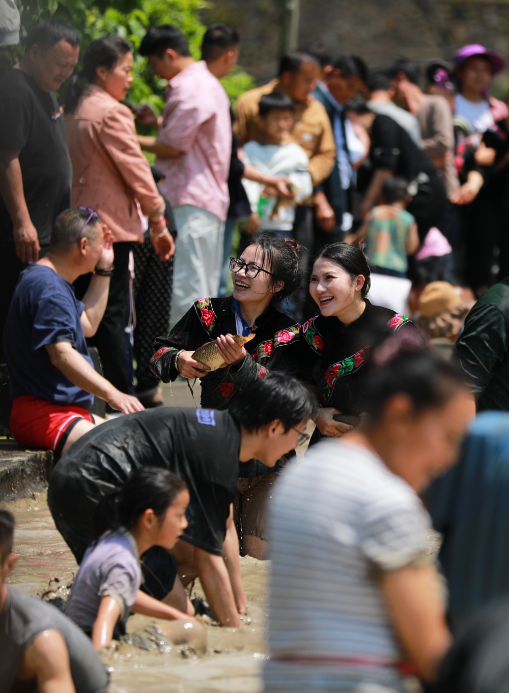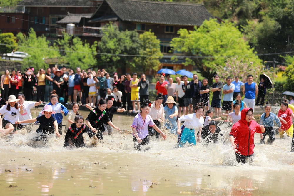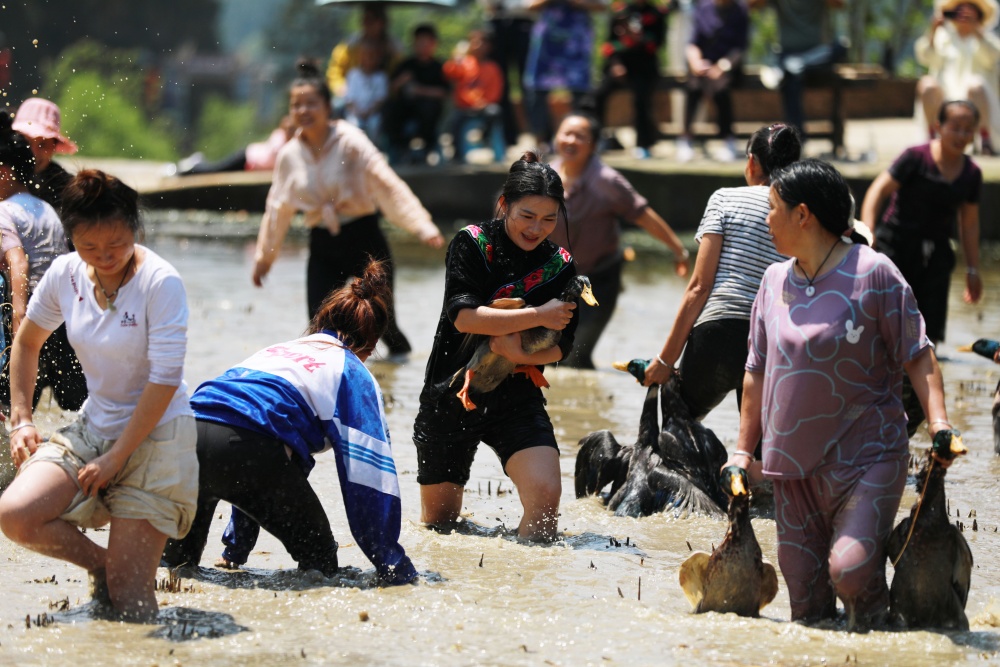 4月11日,贵州省黔东南苗族侗族自治州雷山县西江镇龙塘村借“招龙节”契机,举办稻田抓鱼、抓鸭趣味乡村旅游活动,吸引众多游客前来体验,在欢声笑语中尽享春日乡趣。