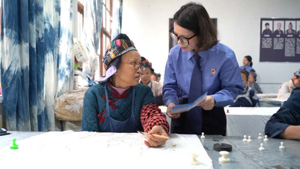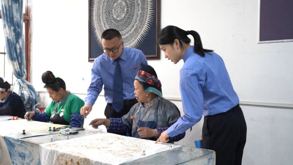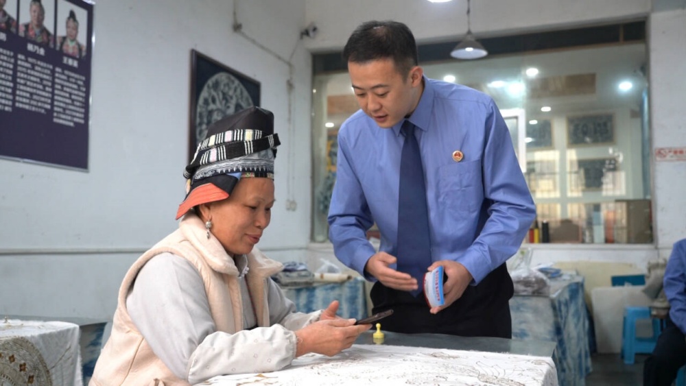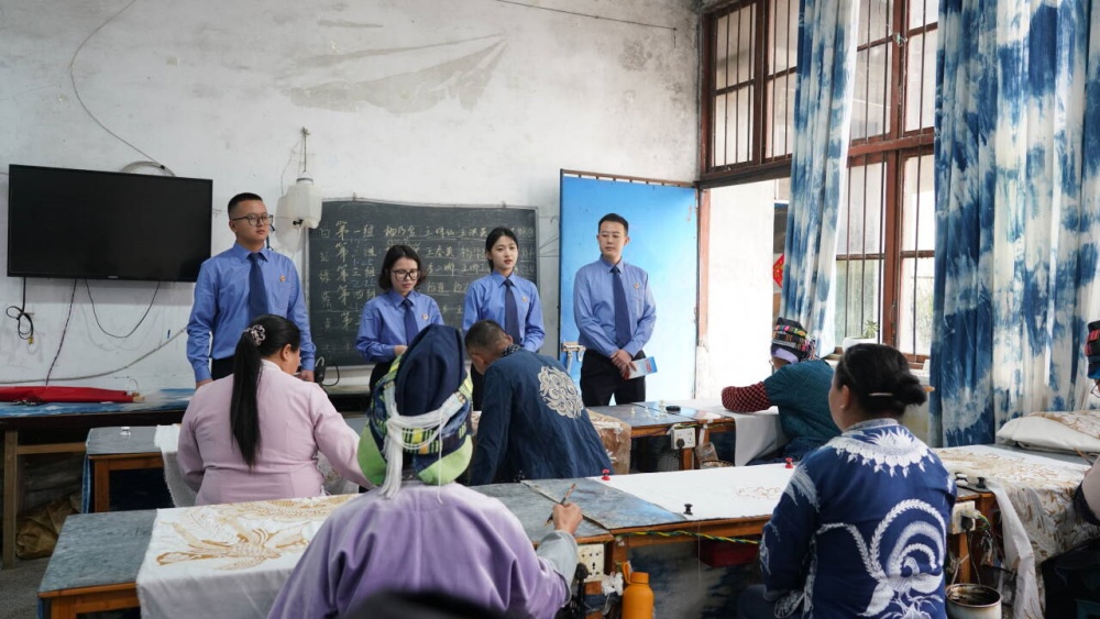 在位于丹寨县城的一家非遗蜡染工坊内,一场非遗保护宣传活动正在进行。来自县检察院工作人员现场通过具体案例,向非遗传承人普及文化安全与非遗知识产权保护知识,讲解非遗传承与文化安全的紧密联系,引导大家强化责任意识,共同守护好民族文化的根脉。