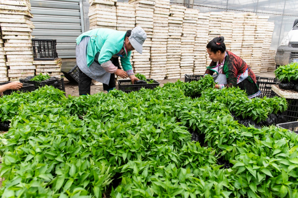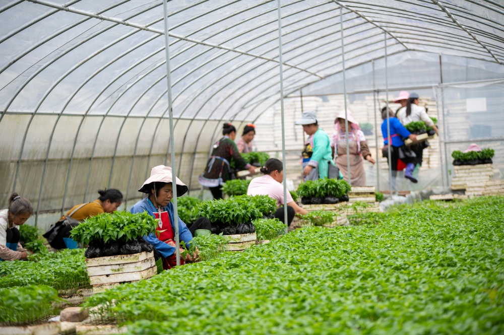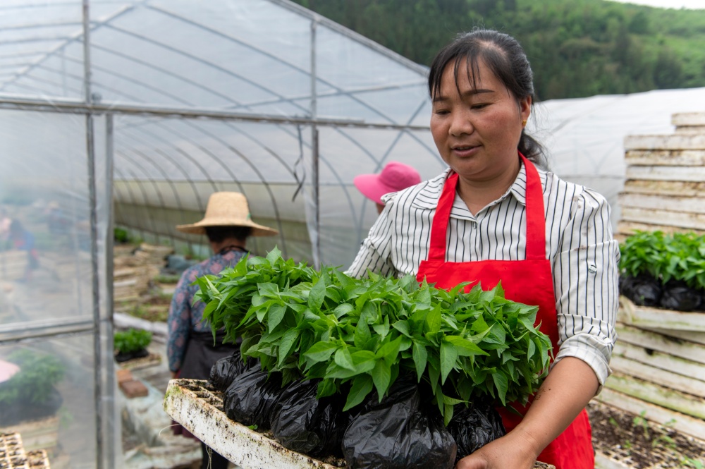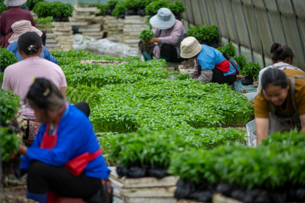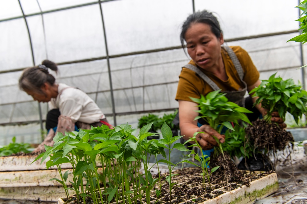 当日,贵州省黔东南苗族侗族自治州从江县丙妹镇大塘村辣椒育苗基地大棚内,村民抢抓农时集中起苗,准备移栽大田。