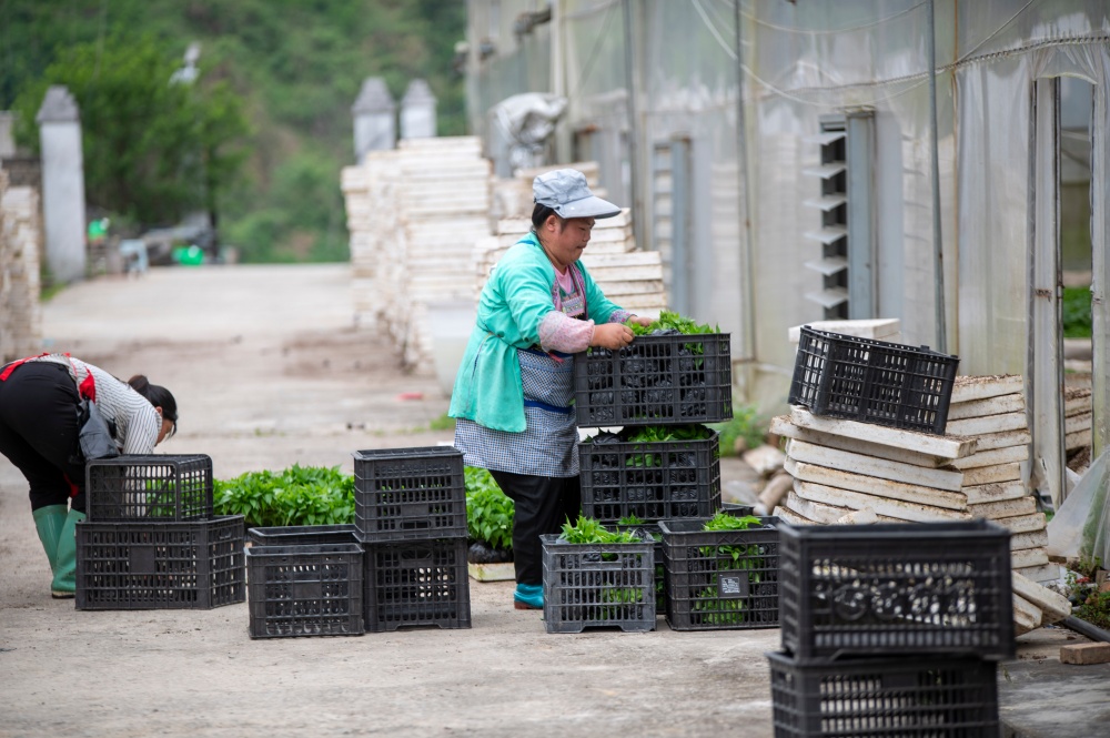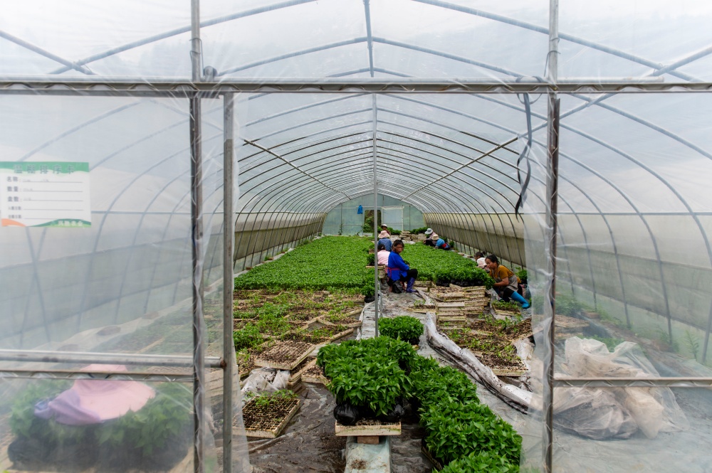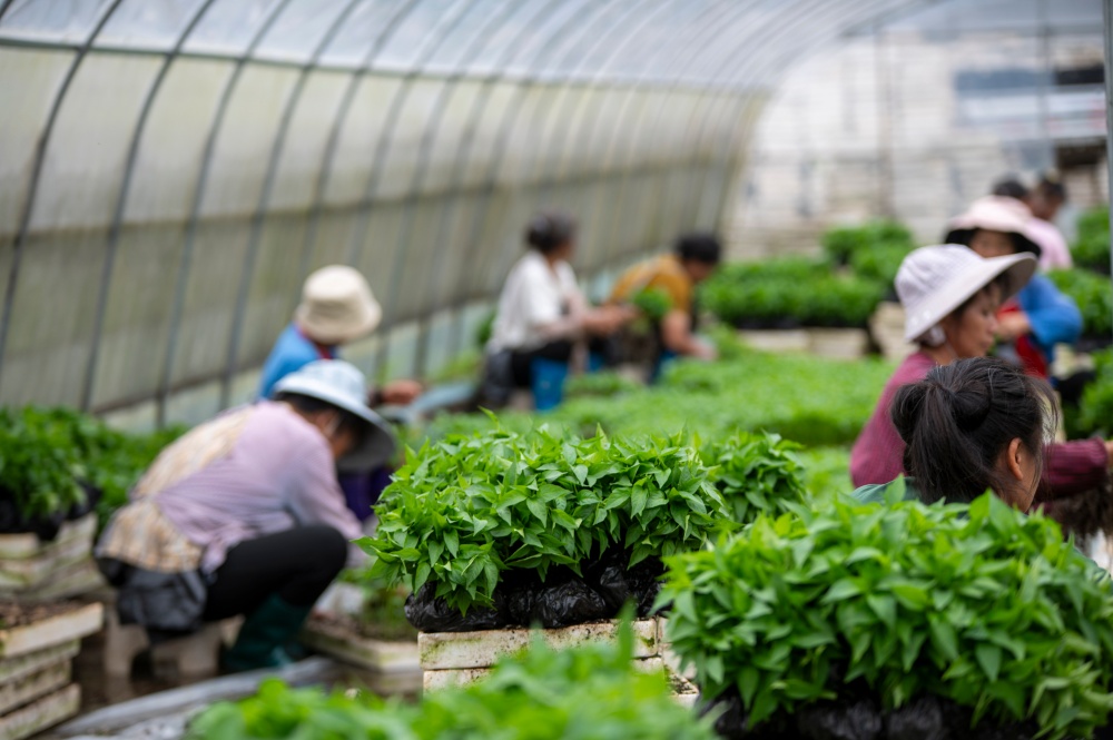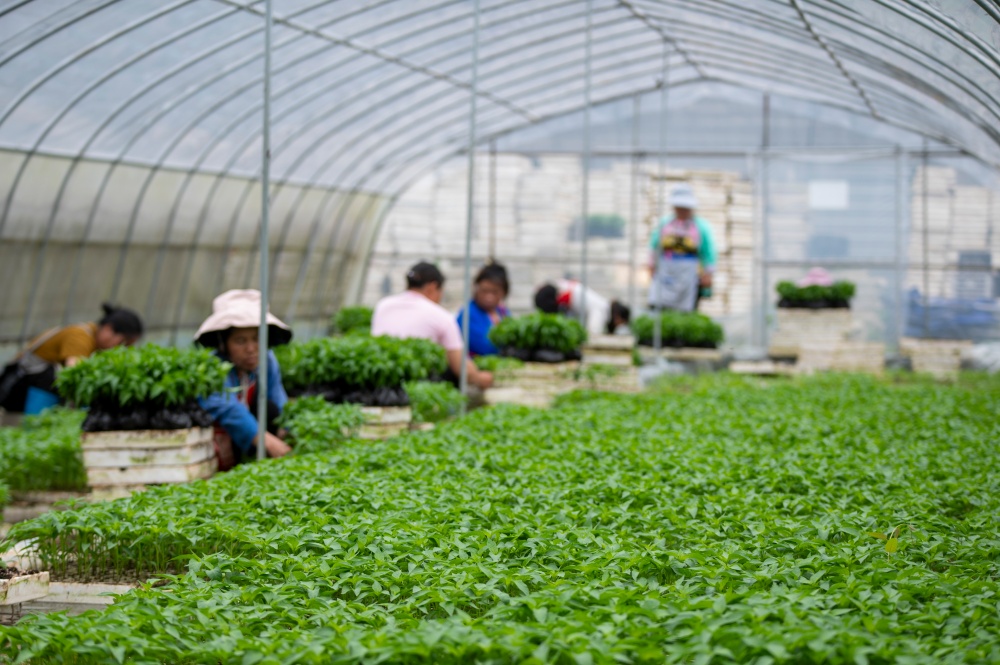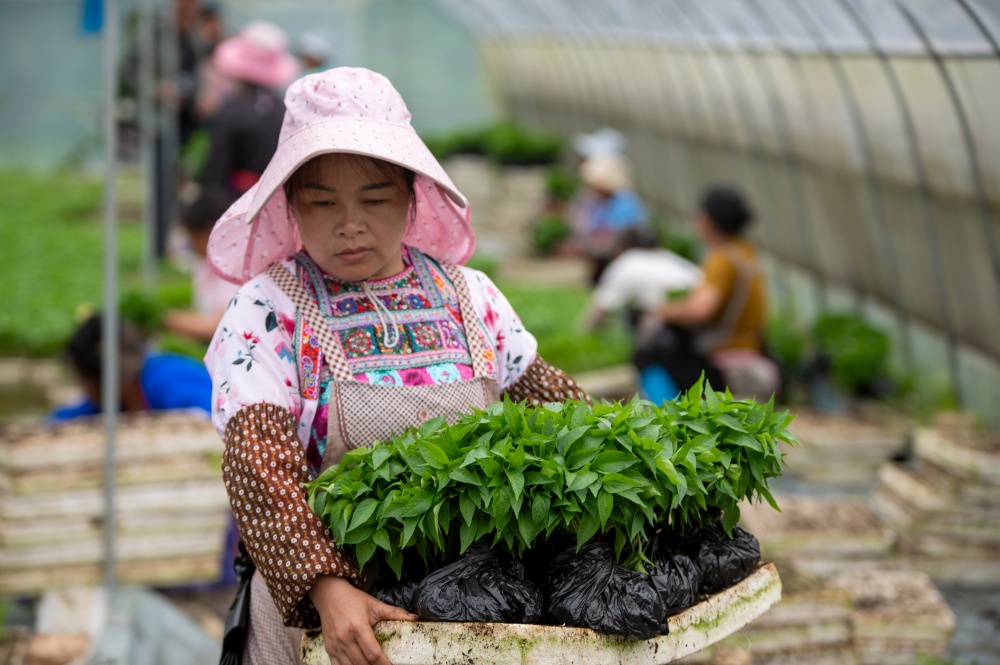 当日,贵州省黔东南苗族侗族自治州从江县丙妹镇大塘村辣椒育苗基地大棚内,村民抢抓农时集中起苗,准备移栽大田。