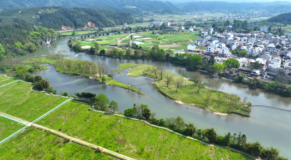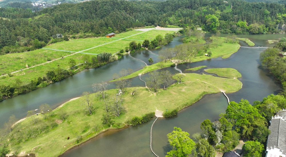 春日里的锦屏县敦寨镇雷屯村,亮江河蜿蜒流淌,环抱出一片绿意盎然的太极沙洲。江水清澈如镜,映着两岸新抽的嫩绿枝桠;沙洲之上,芳草如茵,风吹过便泛起层层绿浪,正是踏青漫游的好时节。