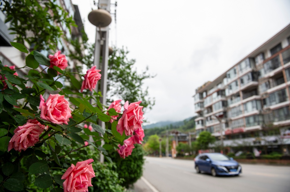 2026年4月15日,贵州省黔东南苗族侗族自治州从江县城銮里大道,雨后初晴,道路两侧的月季花竞相绽放、娇艳欲滴。粉红与火红的花簇缀满枝头,与侗乡特色民居、现代城市楼宇及往来行驶的车辆相映成趣,为春日山城增添了一抹浪漫生机,展现出生态宜居、人与自然和谐共美的城市风貌。