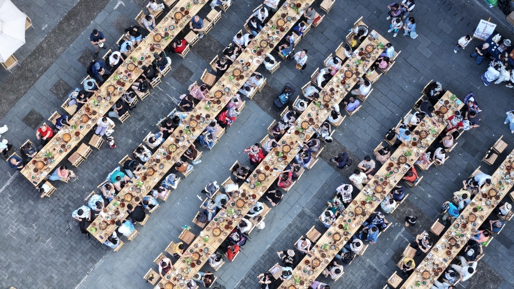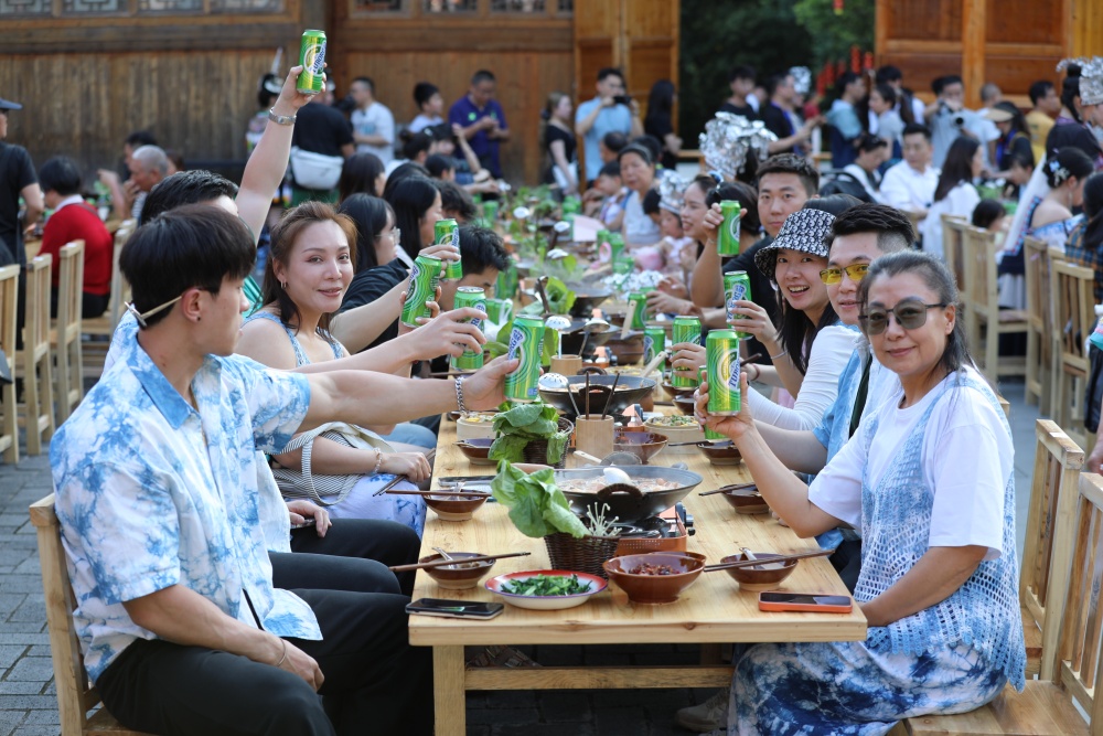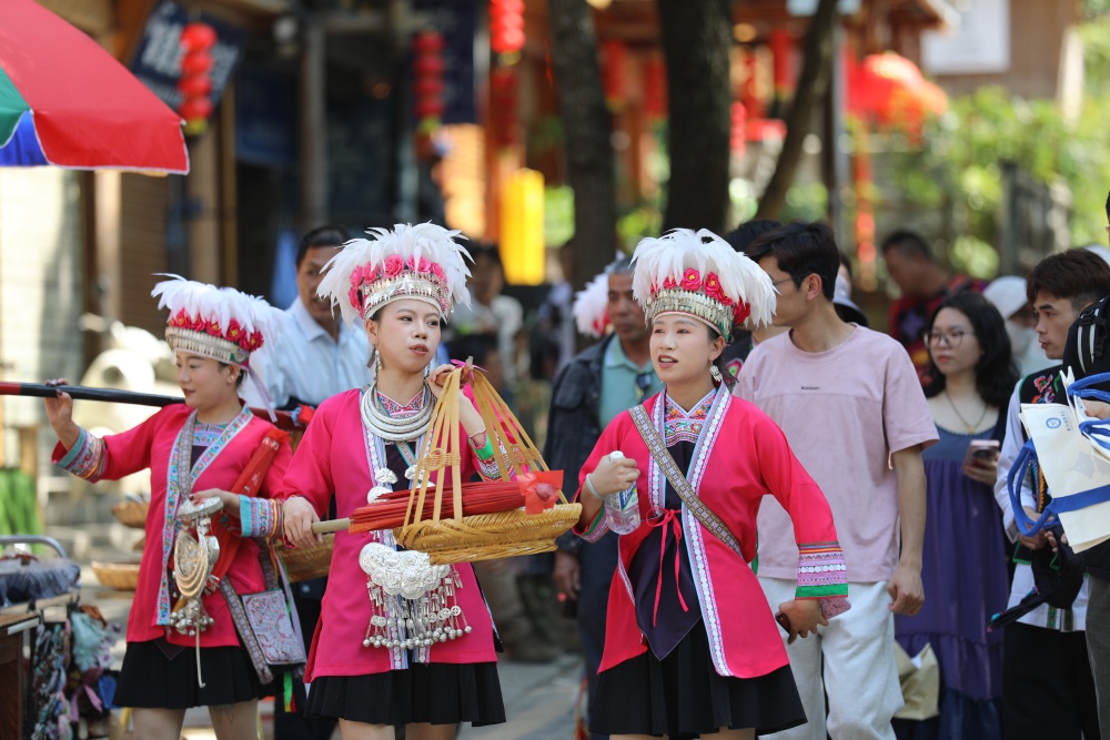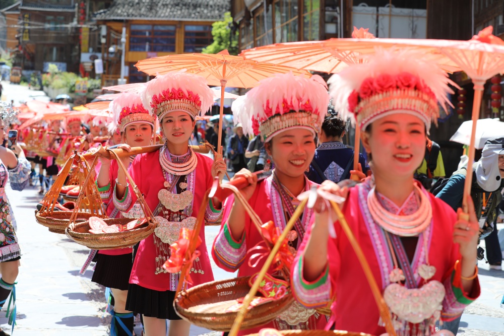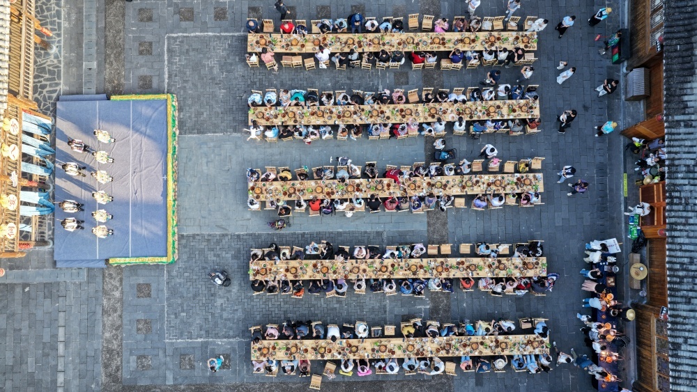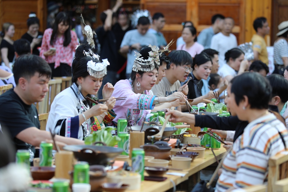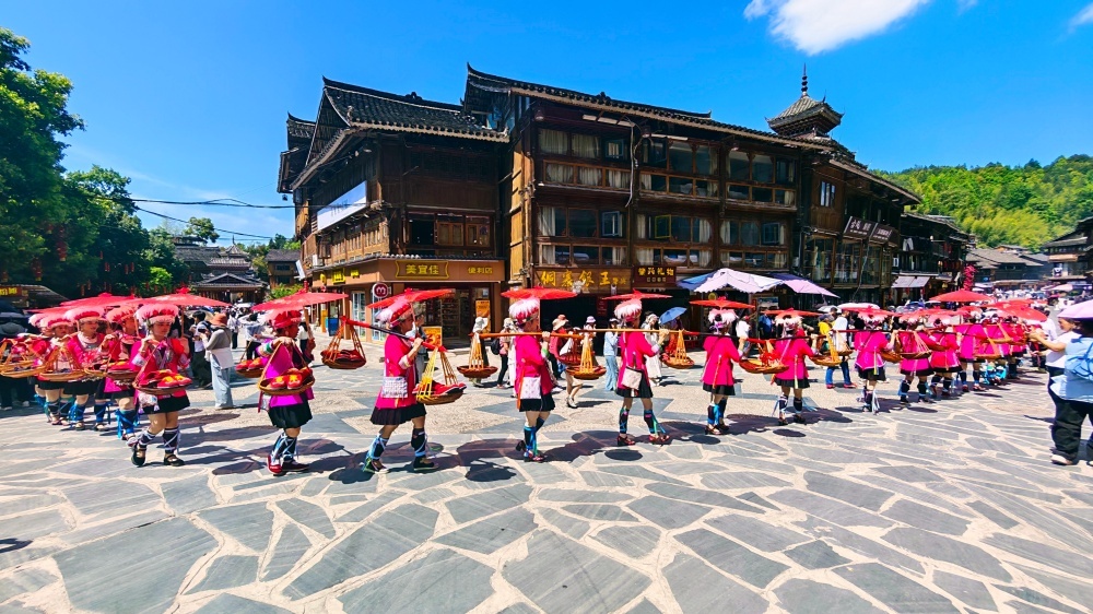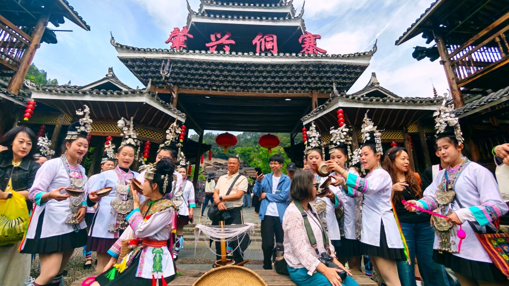 4月18日至20日,贵州省黎平县肇兴侗寨迎来一年一度的传统节庆——谷雨节。是时,八方游客纷至沓来,齐聚这座千年古寨,与当地村民一同制作乌米饭、抹花脸、传唱“村歌”、共享特色长桌宴,处处洋溢着其乐融融的节日氛围。